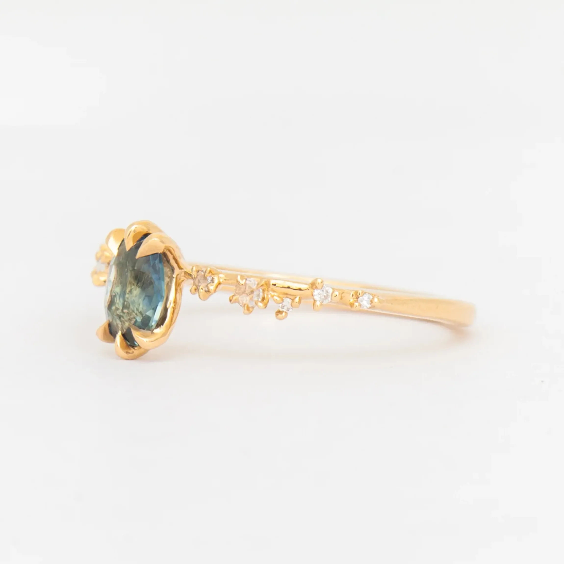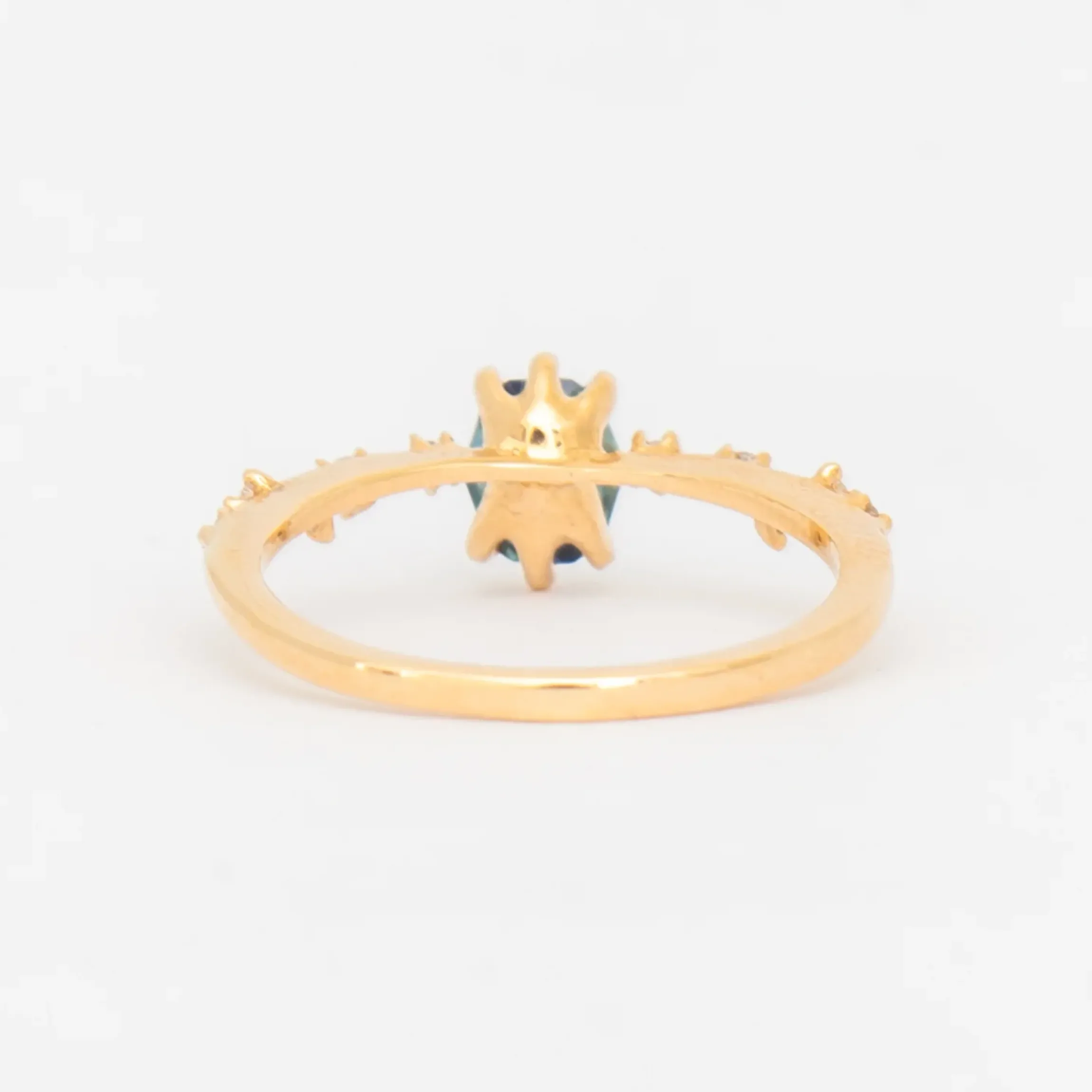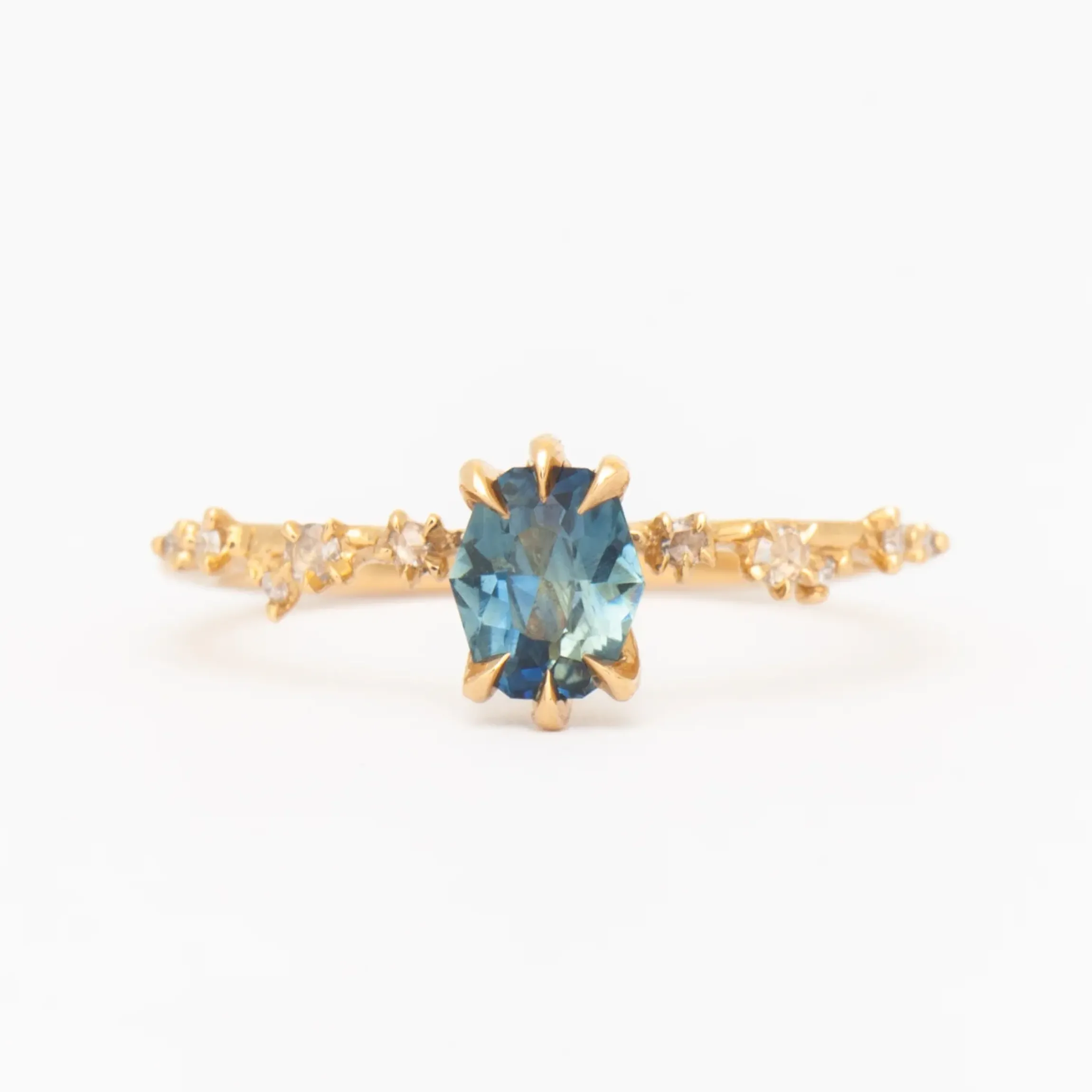 Textured white diamonds dance around a dazzling teal sapphire for a truly one-of-a-kind look. In true Laurie Fleming fashion, its six claw prongs bring attention to the mesmerizing blue stone in its center. So special, you’ll be starstruck. Designed in Toronto, Canada.