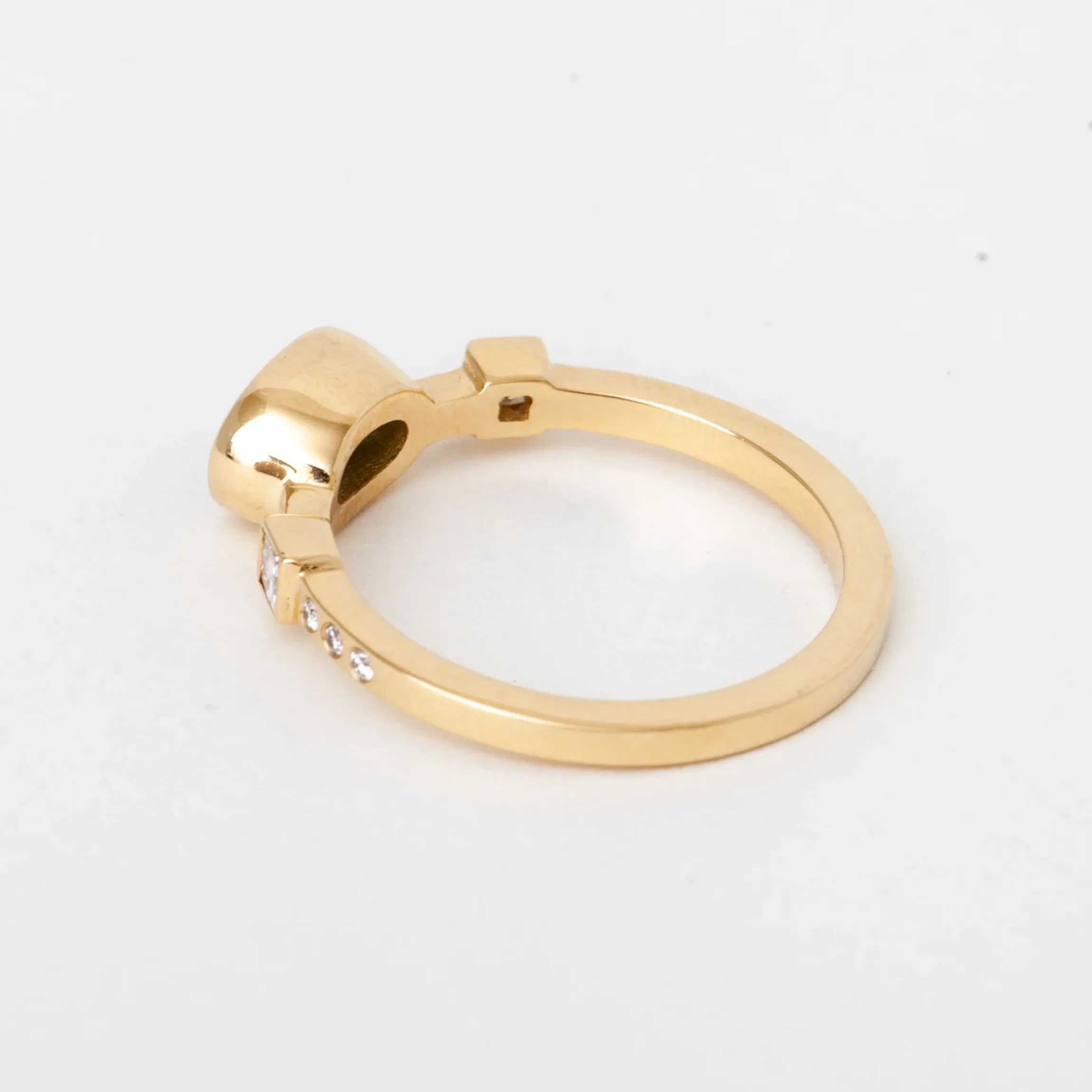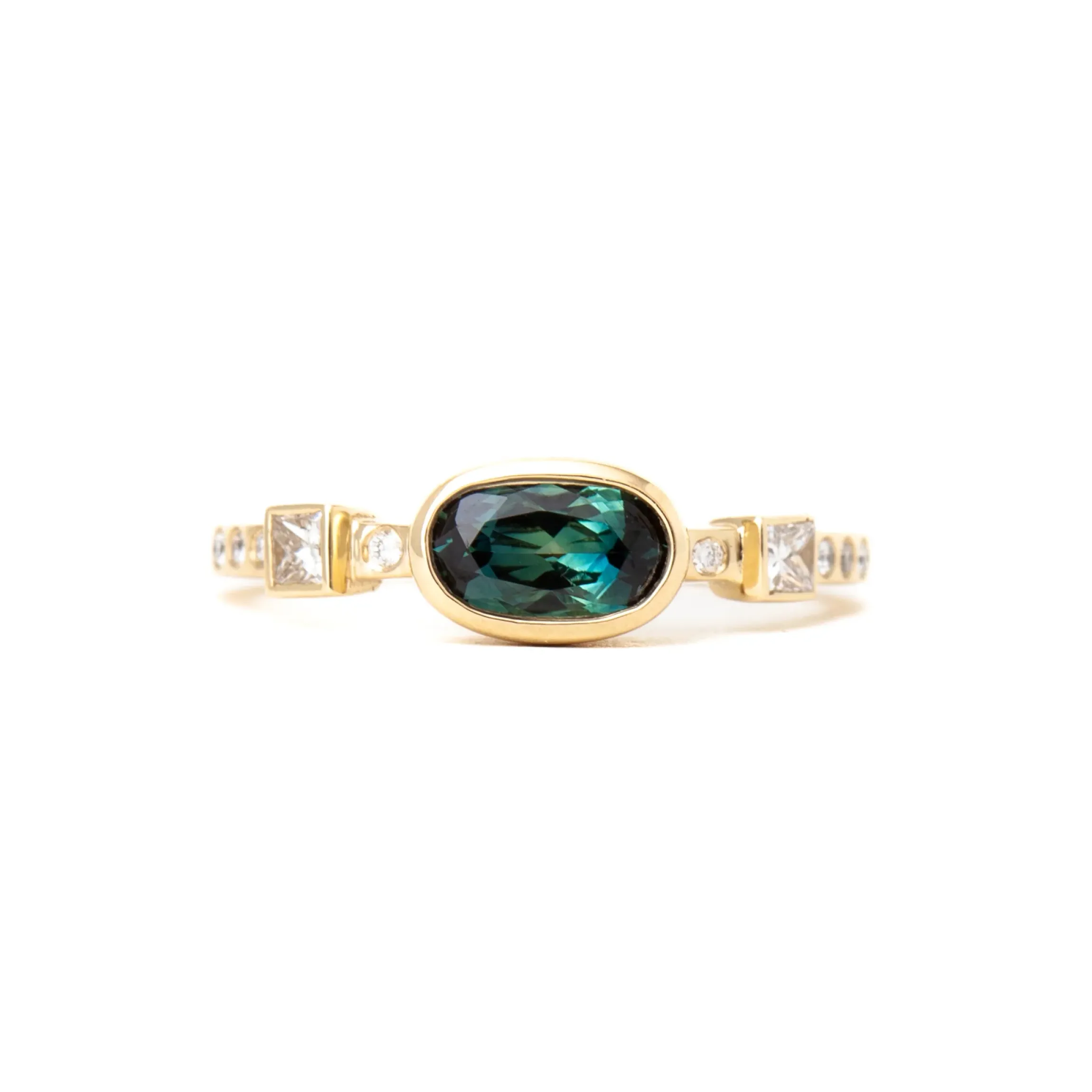 Inspired by the Hikaru Series by designer M.Hisae, this unique ring showcases a stunning teal Australian sapphire surrounded by a golden bezel and accented with round and princess-cut diamonds. Perfect for those seeking a non-traditional engagement ring or a colorful addition to their everyday stack. It’s truly a gem that embodies your vibrant inner light, formed over millions of years on Earth. Made in the U.S.A.