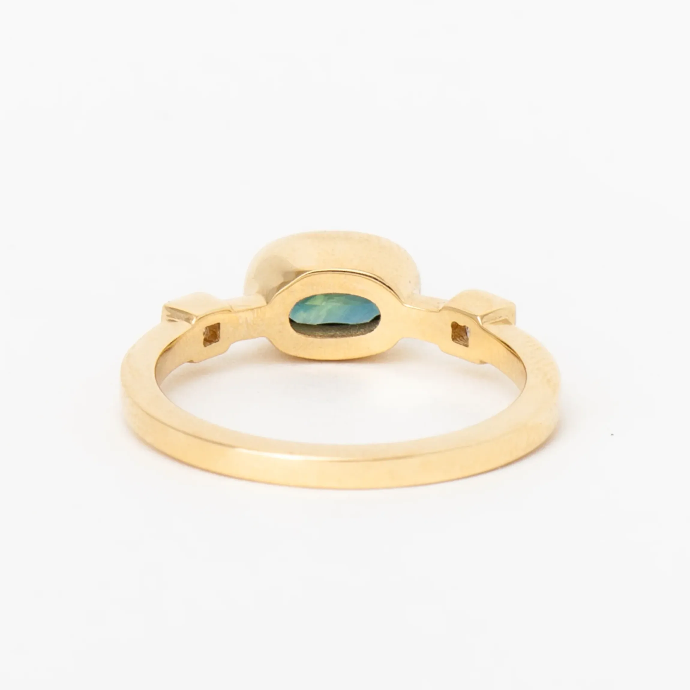 14 karat gold with 0.77 carat Teal Australian Sapphire with two princess cut diamonds and eight round white diamonds.