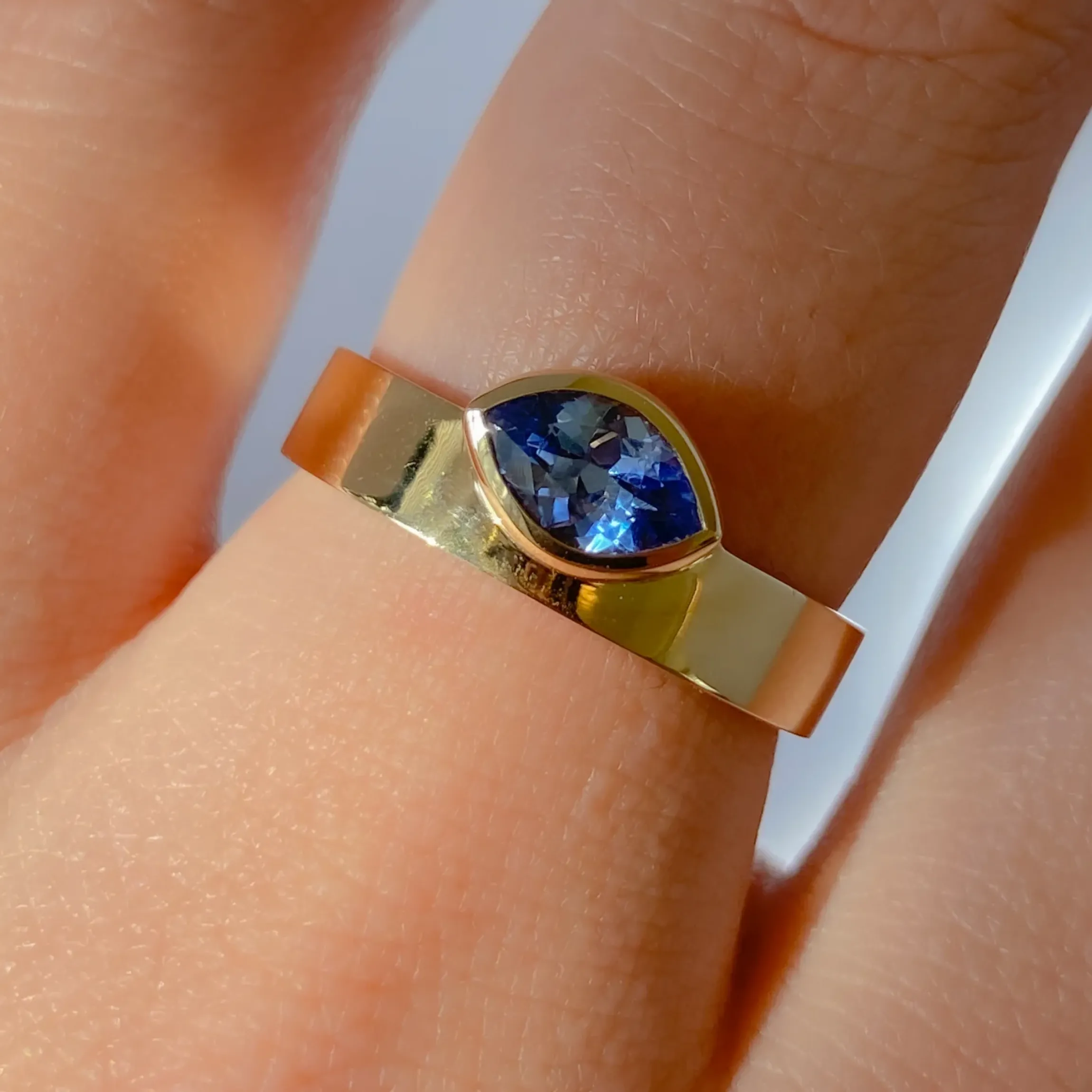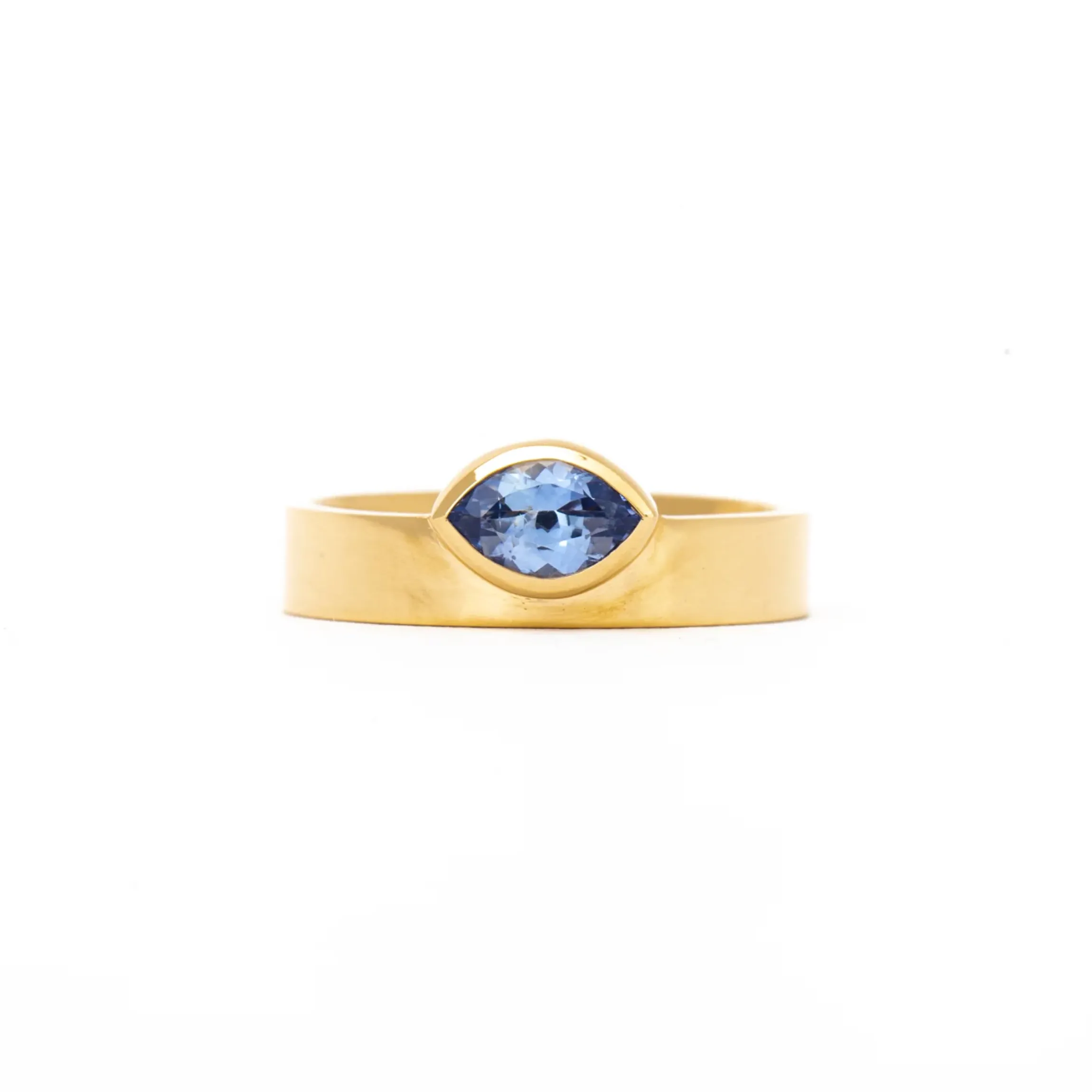 Blending her love for architecture and fine jewelry, Wing Yau’s Monolith series combines minimalism and maximalism in perfect synergy, creating a ring that is as unique as the one who wears it. This one-of-a-kind beauty features a bezel-set Sri Lankan marquise sapphire, adding a colorful appeal to a beautifully modern design. Stack it with WWAKE’s organic, contoured rings to break the rules and make your own traditions. Made in the U.S.A.
