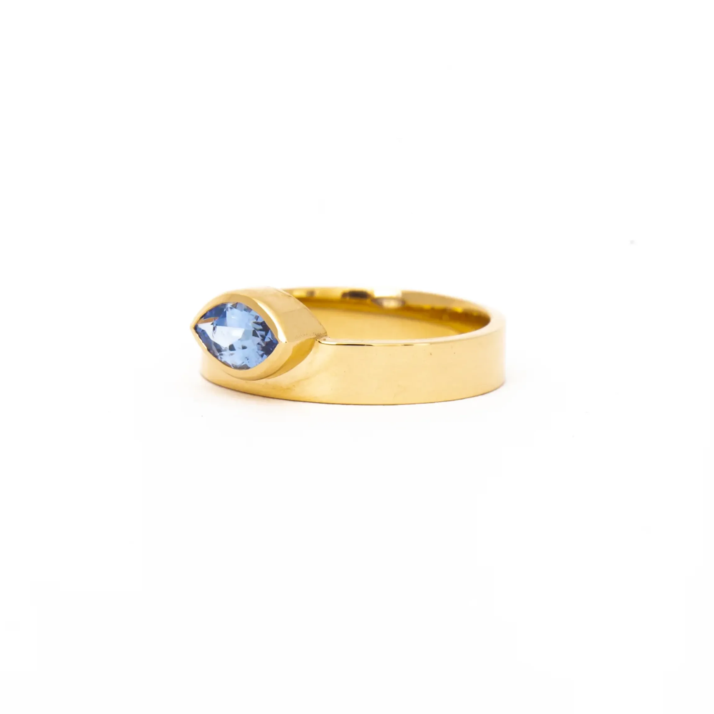14 karat gold set with a Sri Lankan marquise sapphire totaling 0.81 ct.