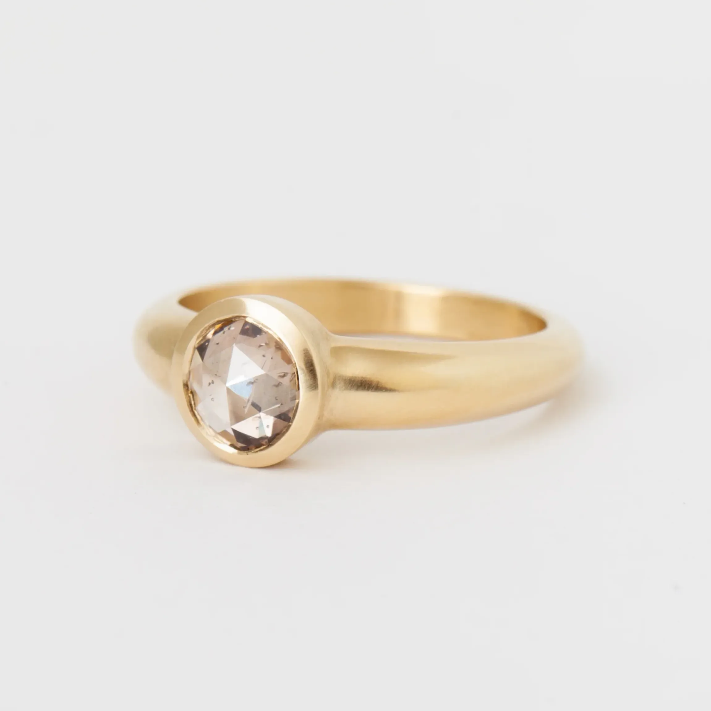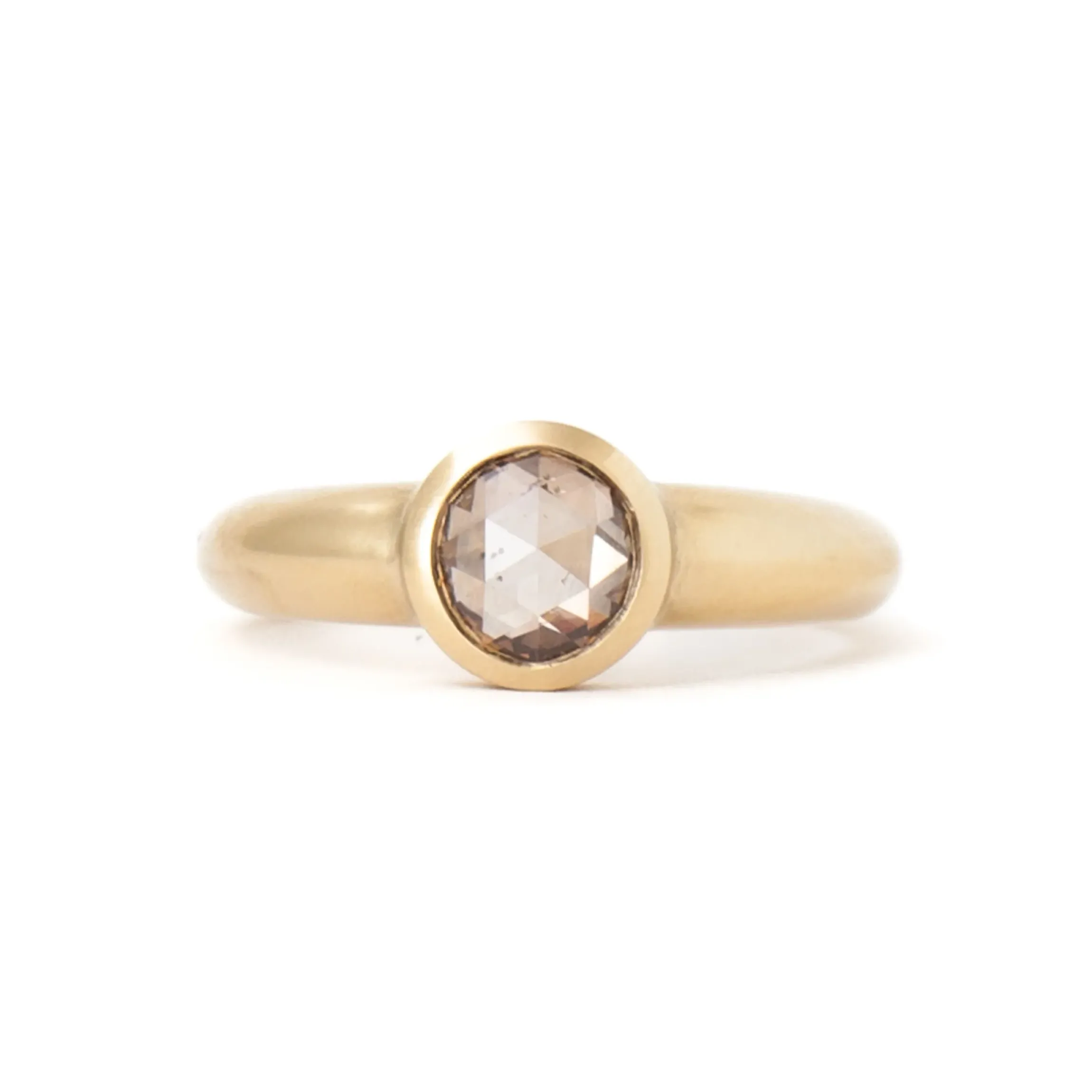 Featuring a gorgeous round rose-cut diamond with an orange-brown hue, the traditional solitaire takes on a modern update with this playful and eye-catching design from Melissa Scoppa. The chunky band and low-set center diamond wrapped in a weighty bezel create a beautiful and unique piece, perfect for someone looking for a cool alternative engagement ring. Made in the U.S.A.