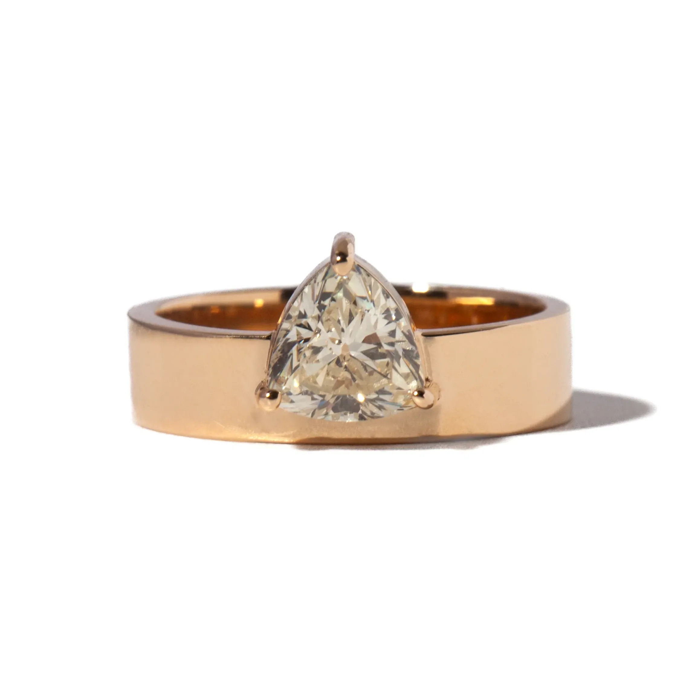 14 karat yellow gold with a GIA Certified trillion diamond (N color/VS2 clarity) totaling 1.04 carat.