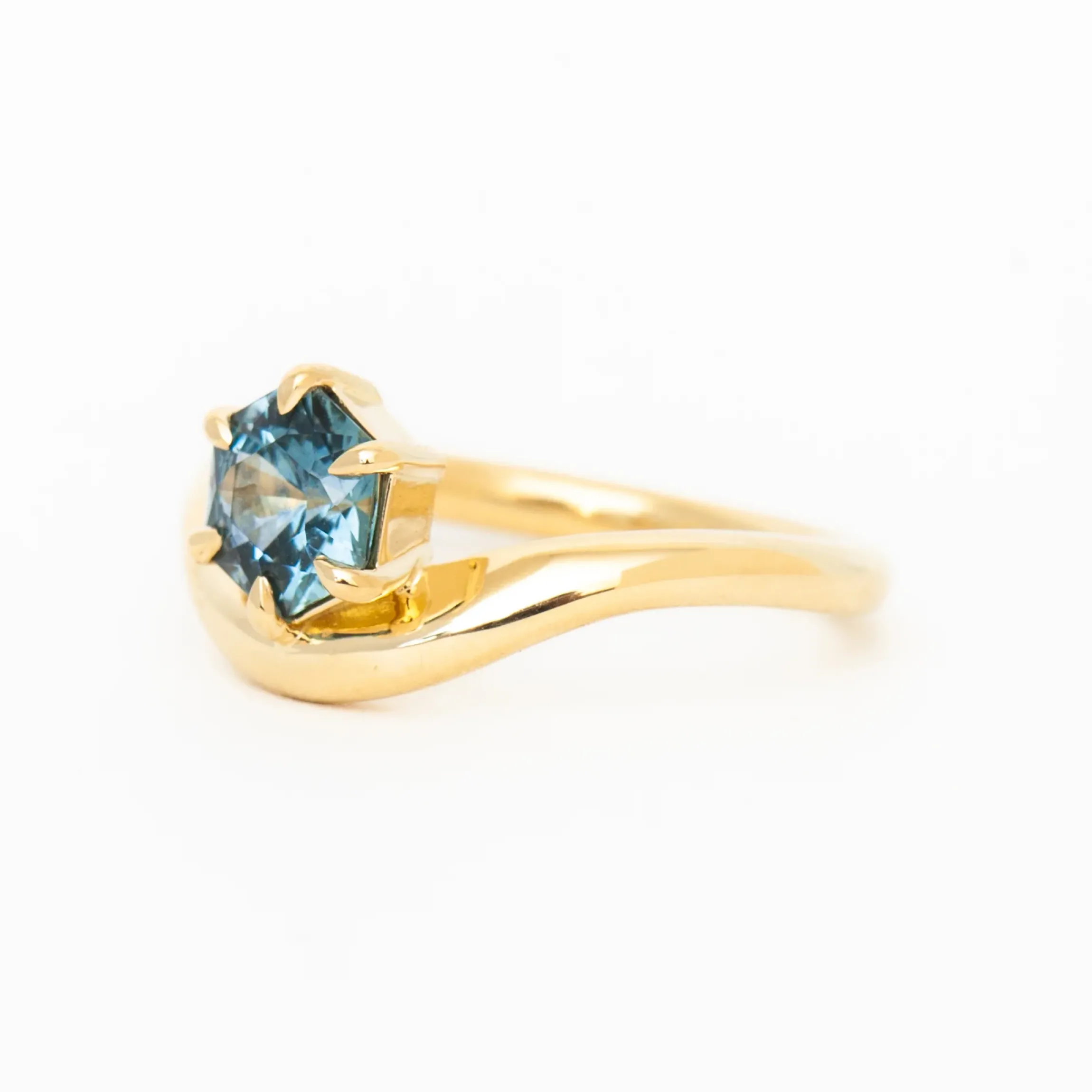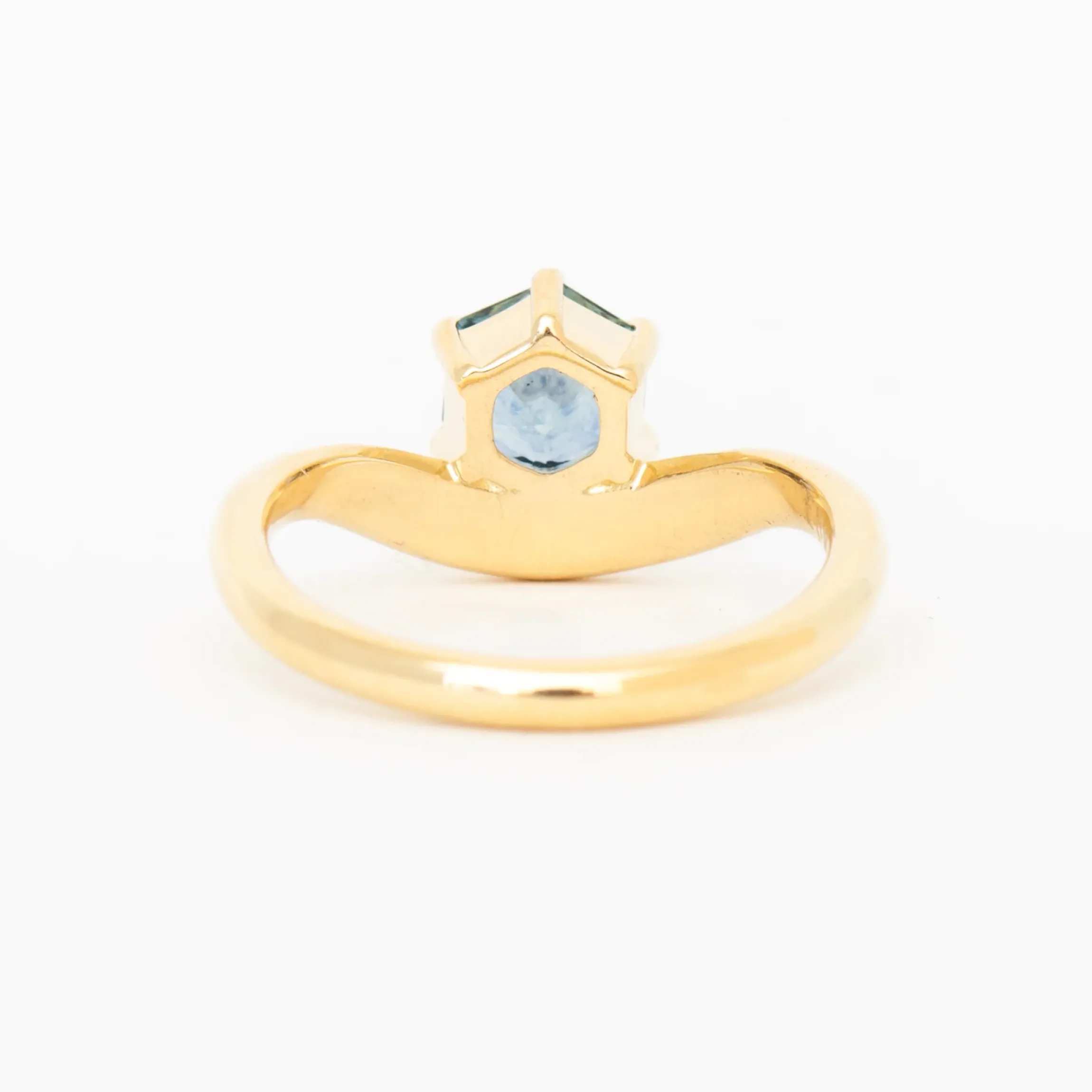 This unique ring from The Future Fine is truly a masterpiece, with its gold lines that playfully dip and dance around a stunning center sapphire. The Montana teal hexagonal stone perfectly complements the warm yellow setting, creating a dreamy effect with its asymmetric design. It’s like gazing into a serene pool, with the stone gently shimmering in perfect harmony. Designed and made in the U.S.A.