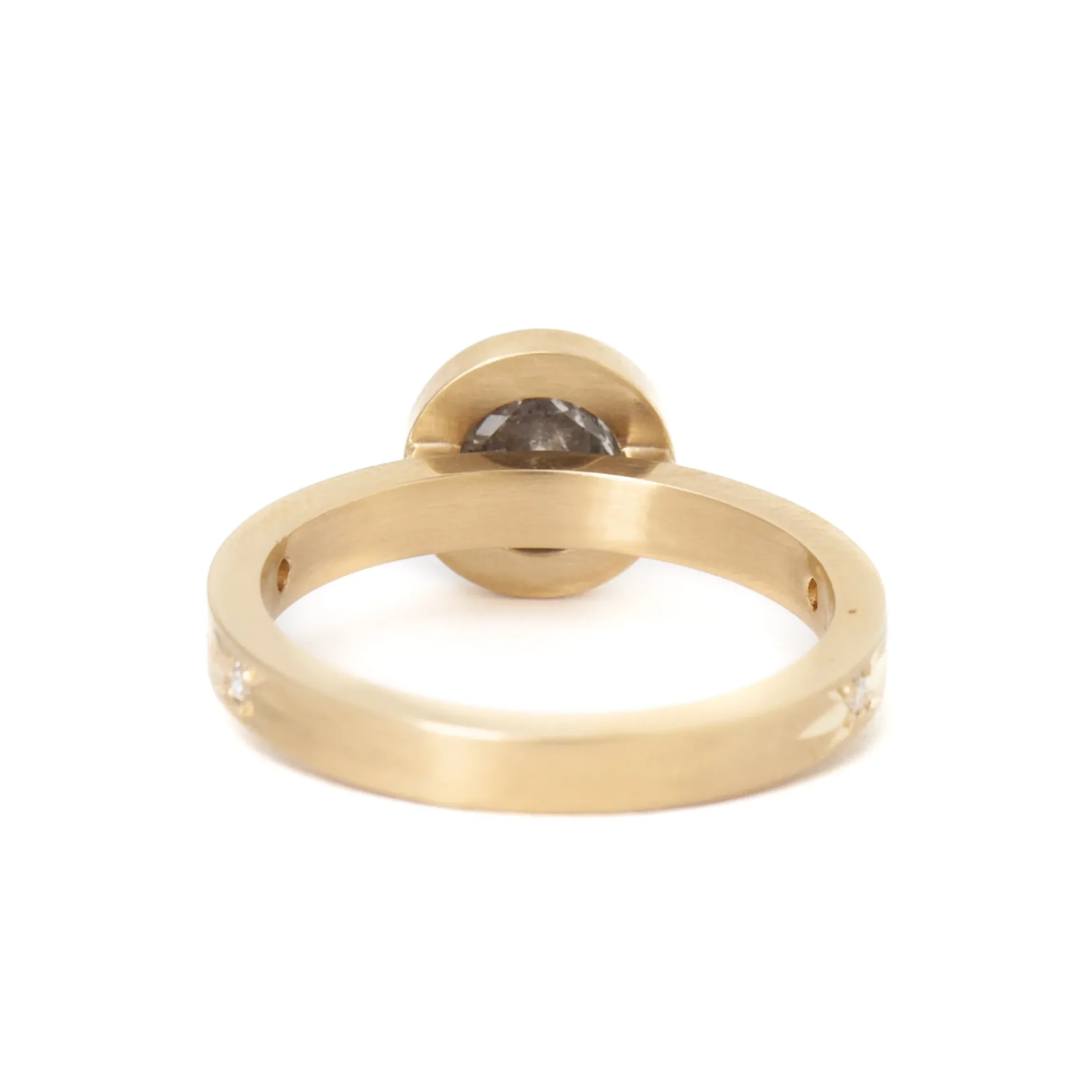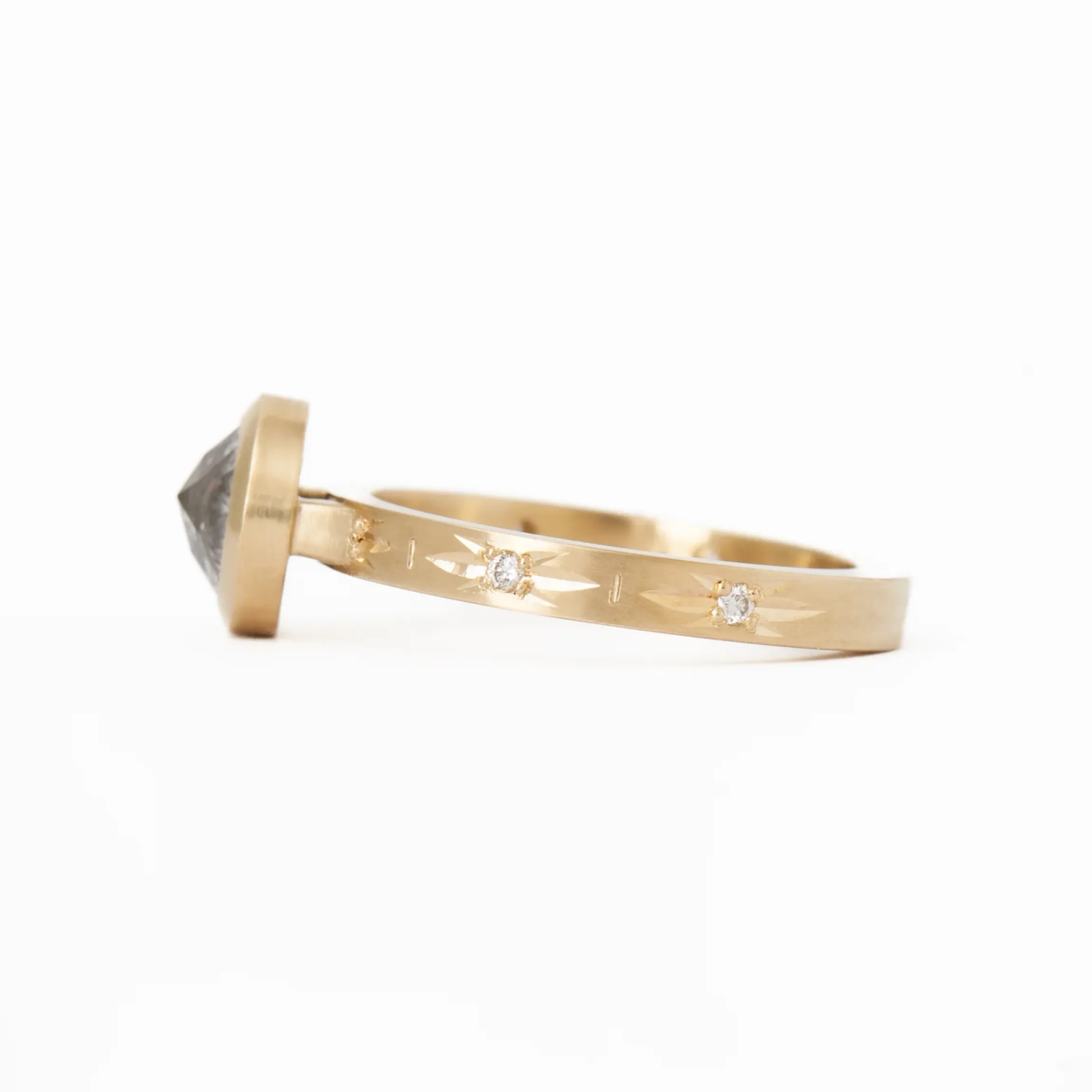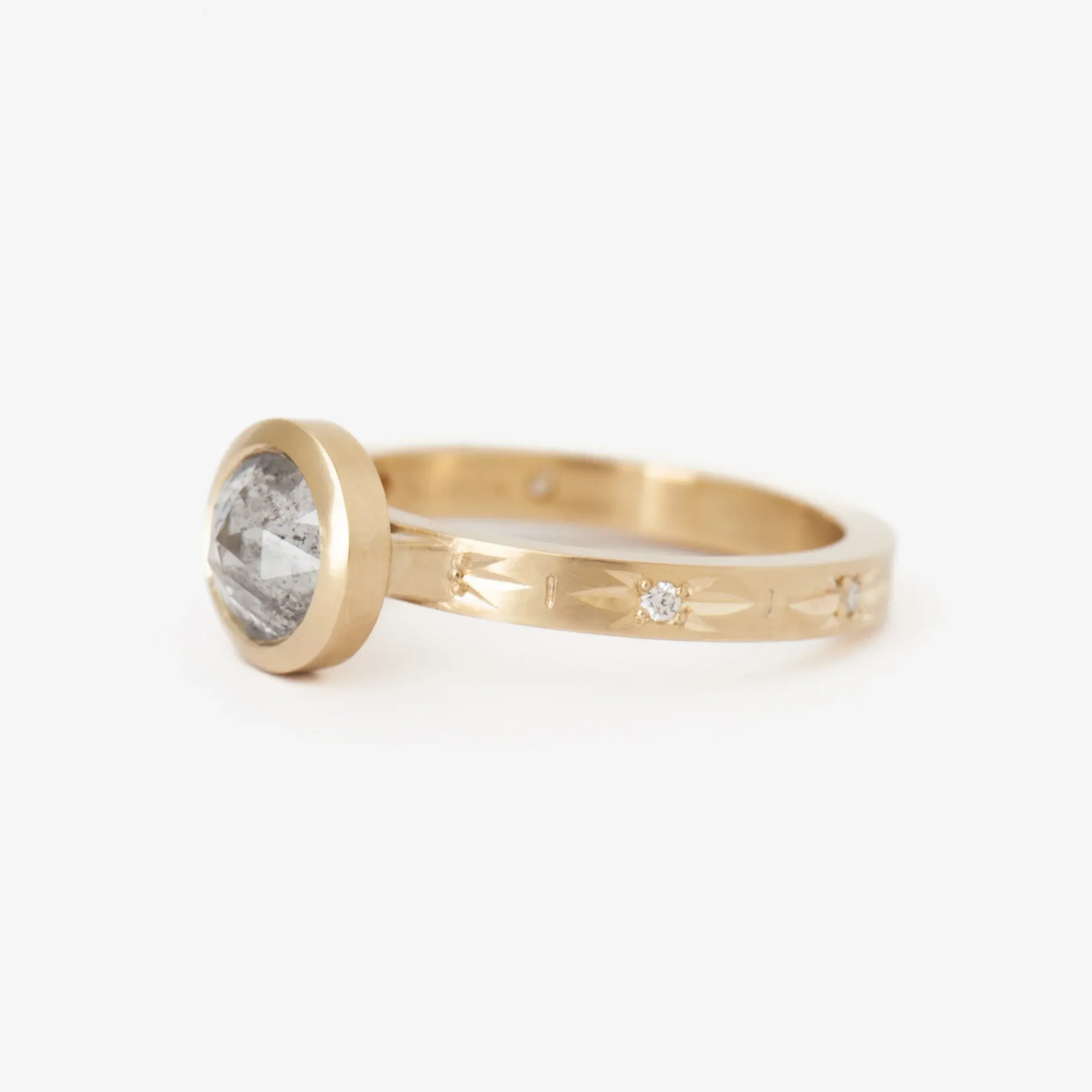 14 karat fairmined yellow gold with side accent diamonds (F+ color, VS clarity) totaling 0.04ctw a rose-cut diamond totaling 1.14 carat.