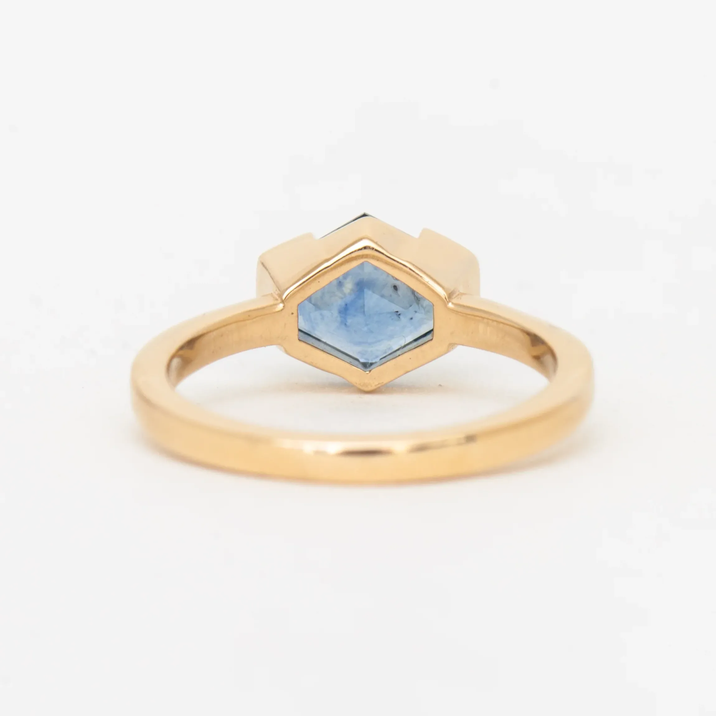 18 karat yellow gold set with a 1.47 carat Montana-origin hexagonal-cut French blue sapphire.