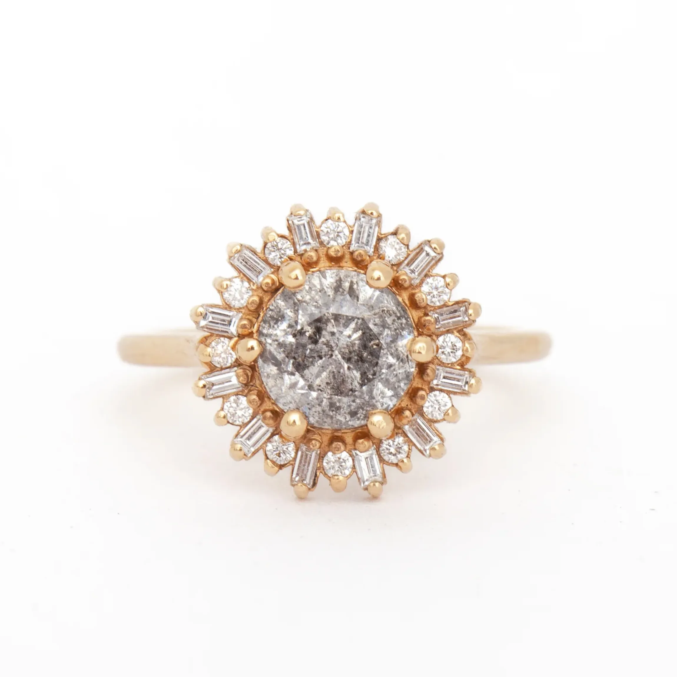 Balancing classic and intriguing elements, this 1.50 carat salt and pepper, round diamond delivers. We love the interesting inclusions and incredible amount of light this gemstone reflects. Surrounded by a halo of baguette and round white diamonds, this Arielle ring is a burst of wearable sparkle you’ll enjoy for a lifetime. Designed in San Francisco, California.