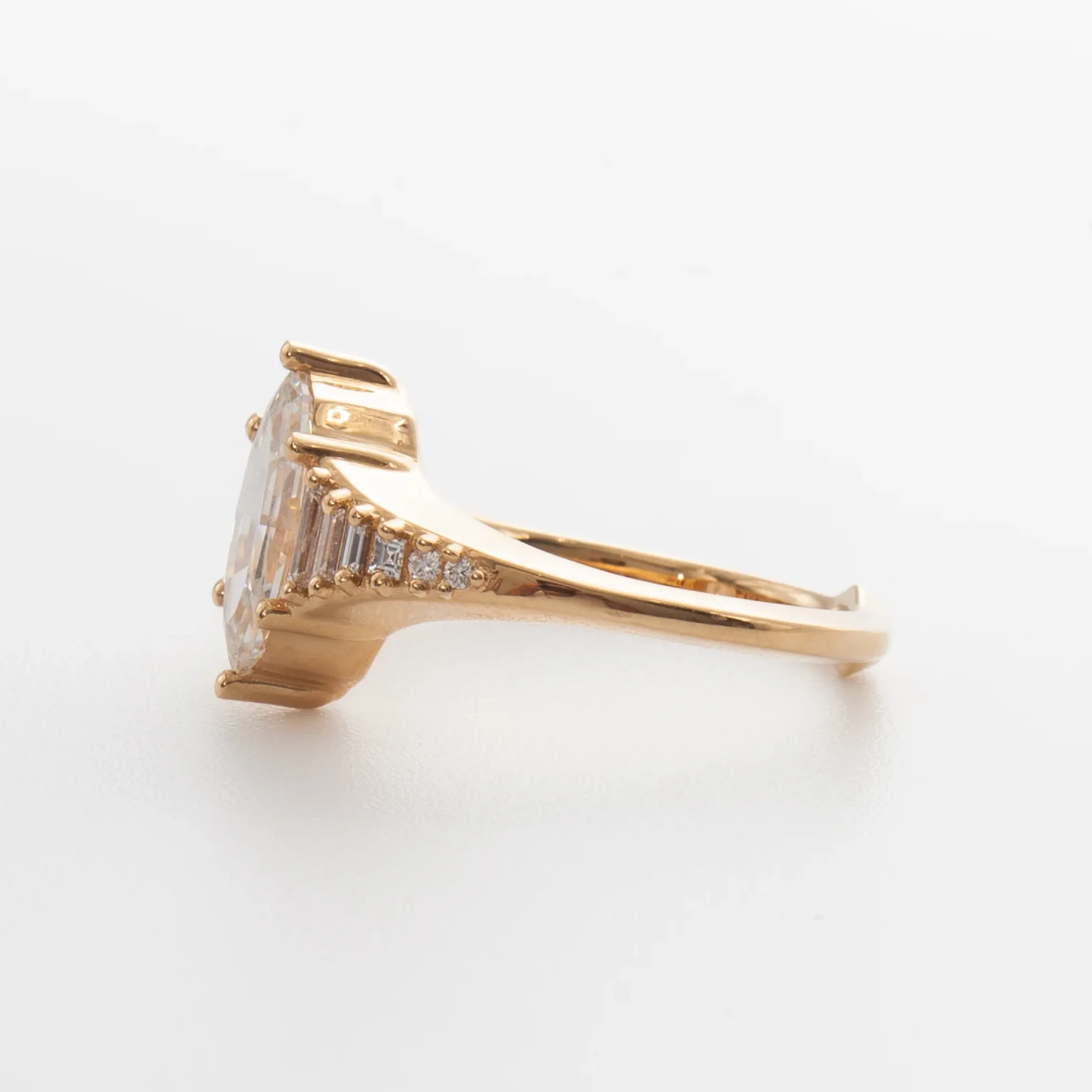 18 karat yellow gold set with baguette, round and princess-cut white diamonds with a center lab-grown step-cut oval diamond totaling approximately 2.0 carat.