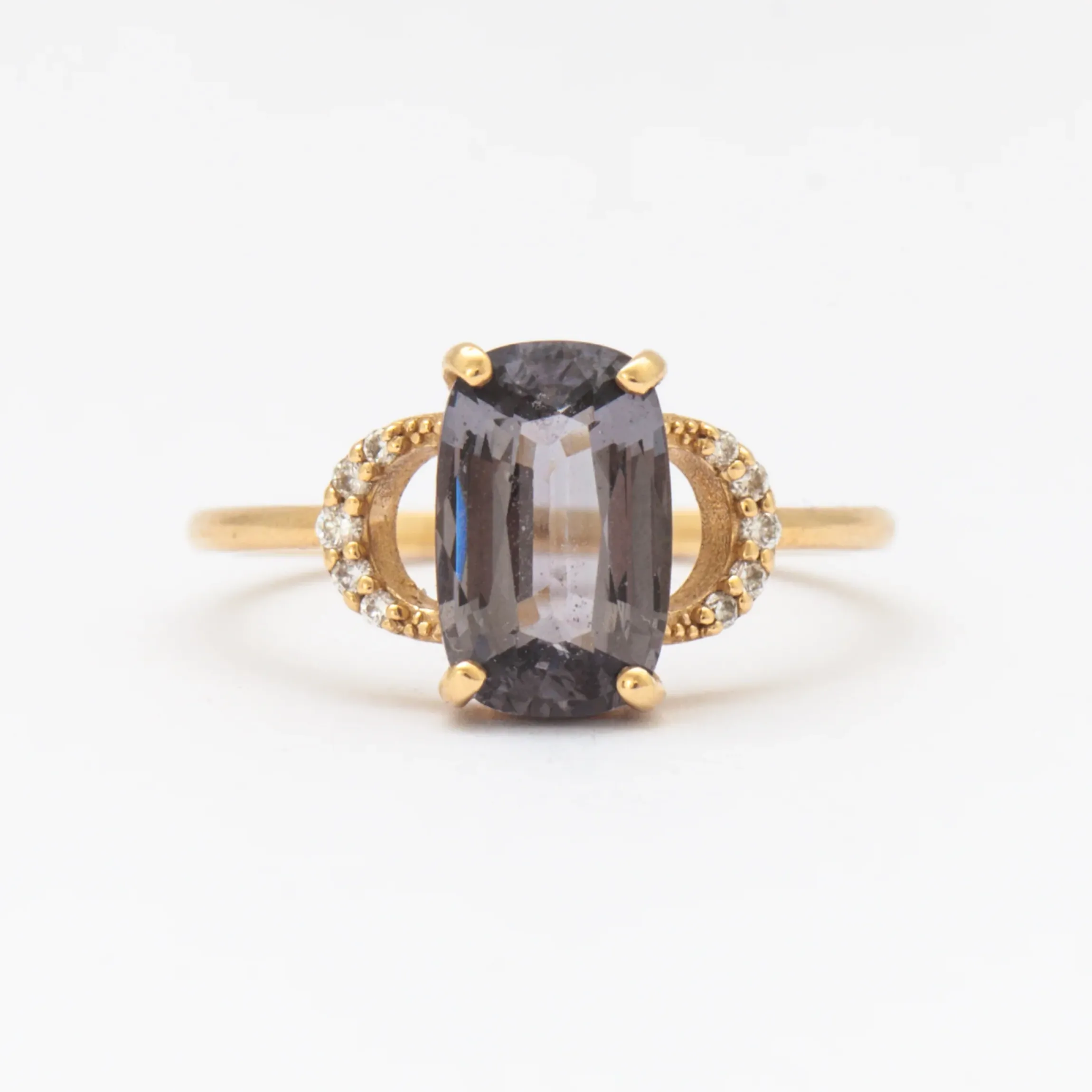 Introducing a unique and playful ring fresh from the renowned NYC designer, Vale Jewelry. This ring is sure to turn heads, featuring a stunning elongated cushion in purple, flanked by diamond-adorned half circles. The low-profile design ensures comfortable wear for every day. It is a perfect option for those seeking a non-traditional engagement ring or an every day power ring.