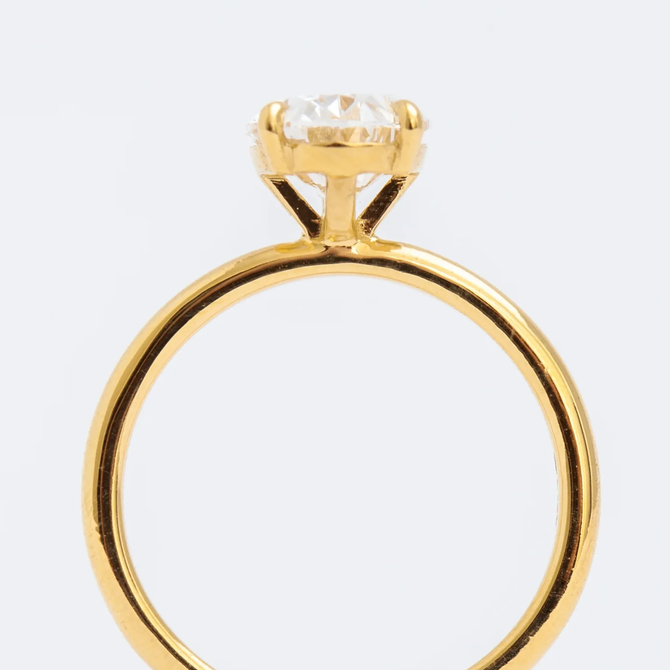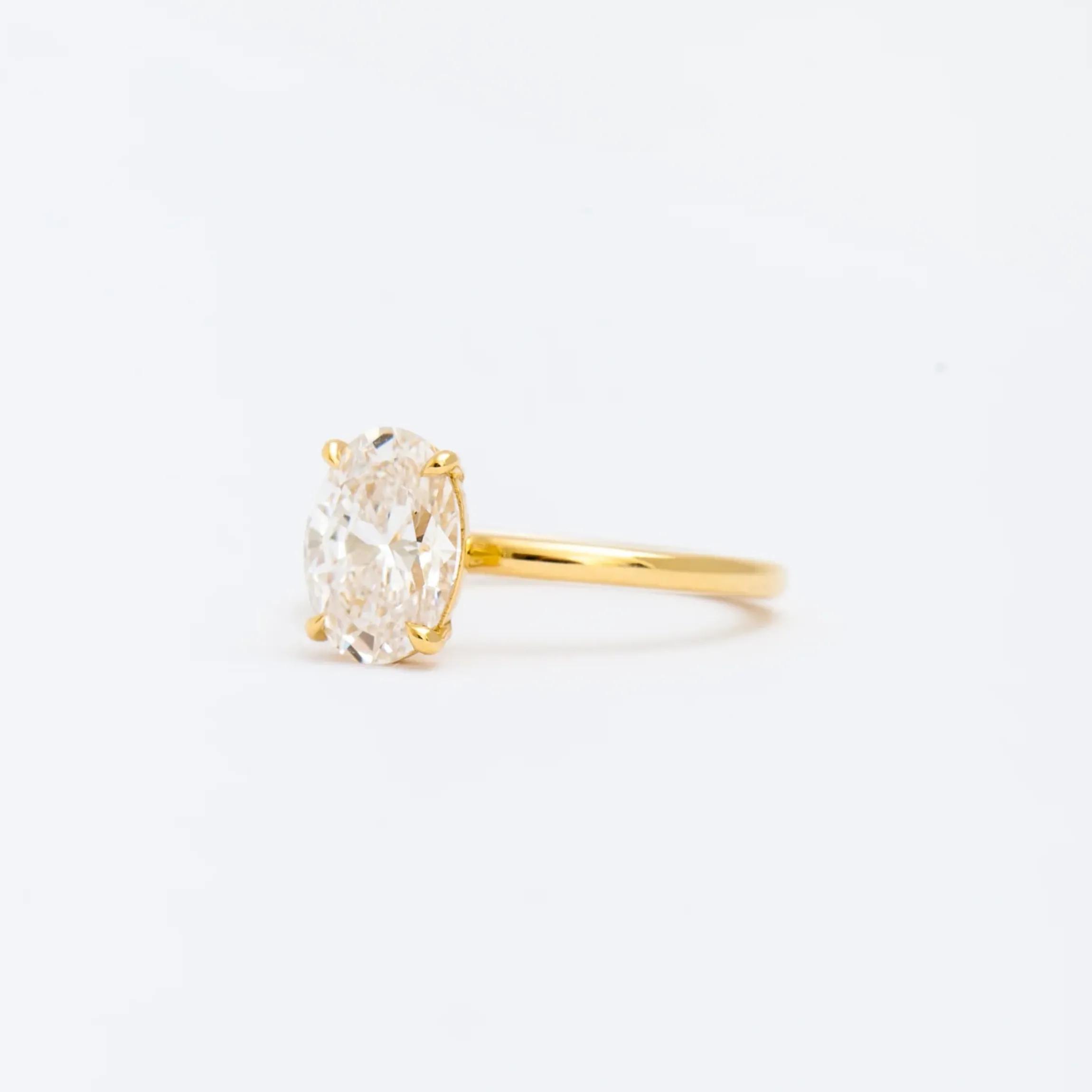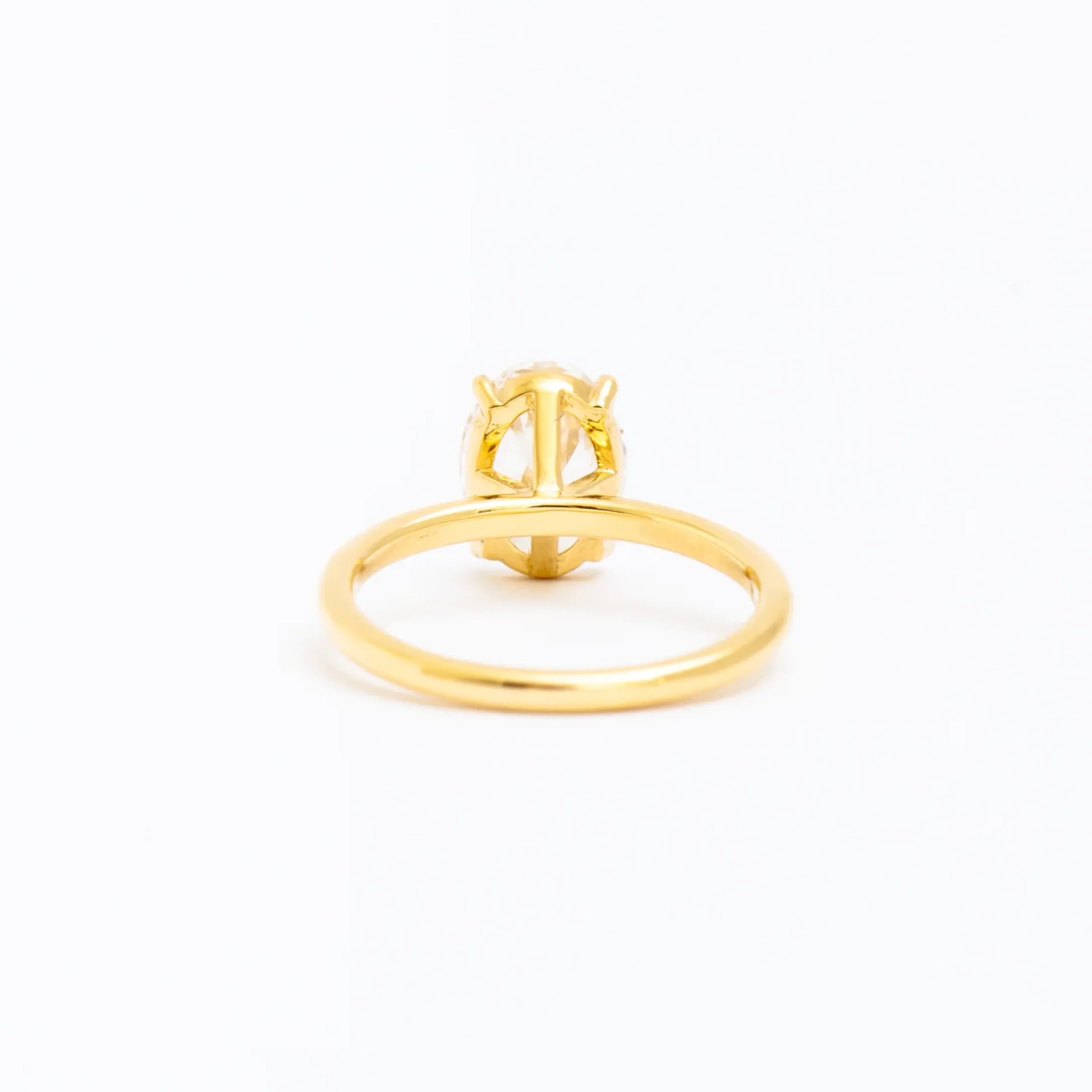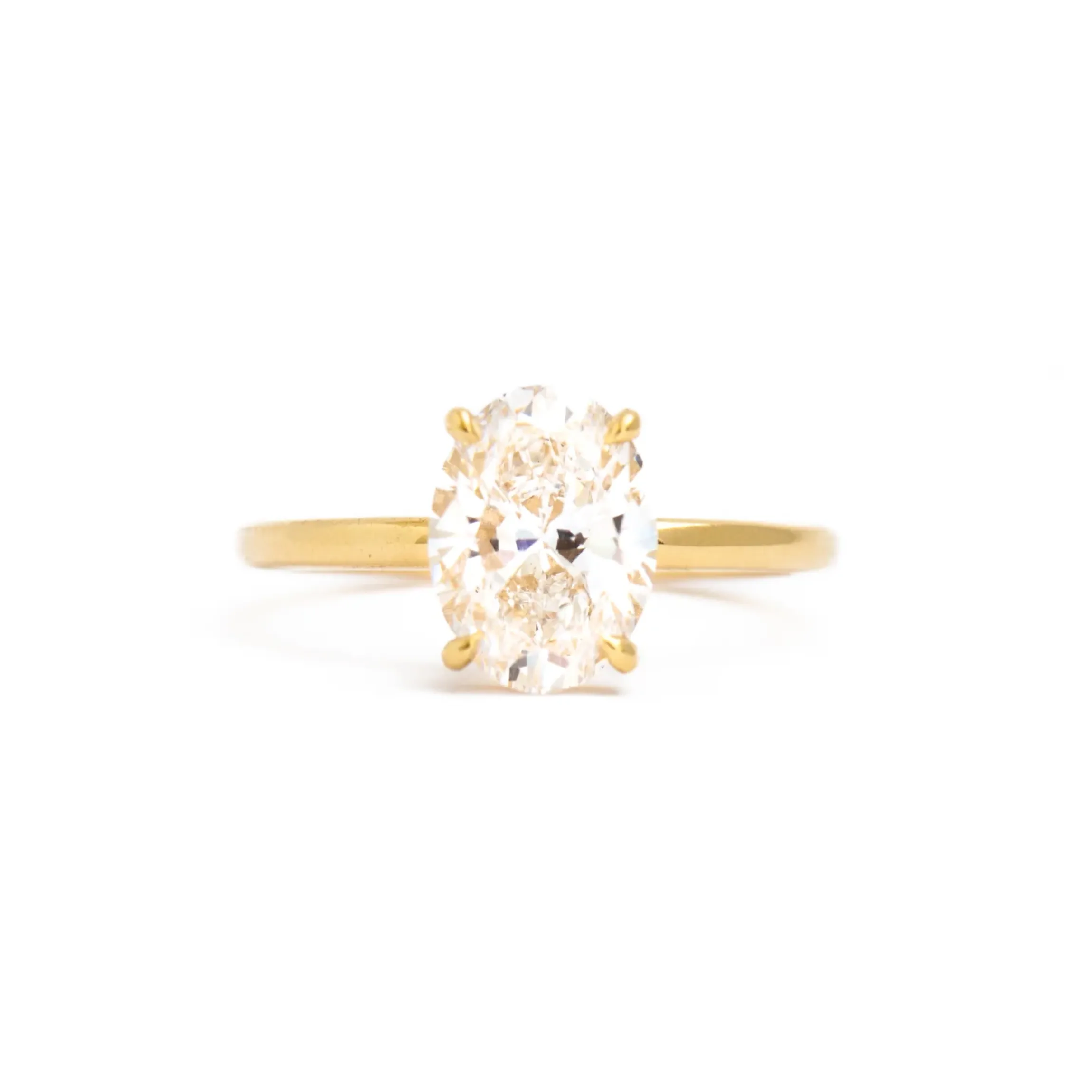 18 karat yellow gold set with one 2.00 carat GCAL certified lab-grown oval white diamond (F color/VS2 clarity) grown in the U.S.A.