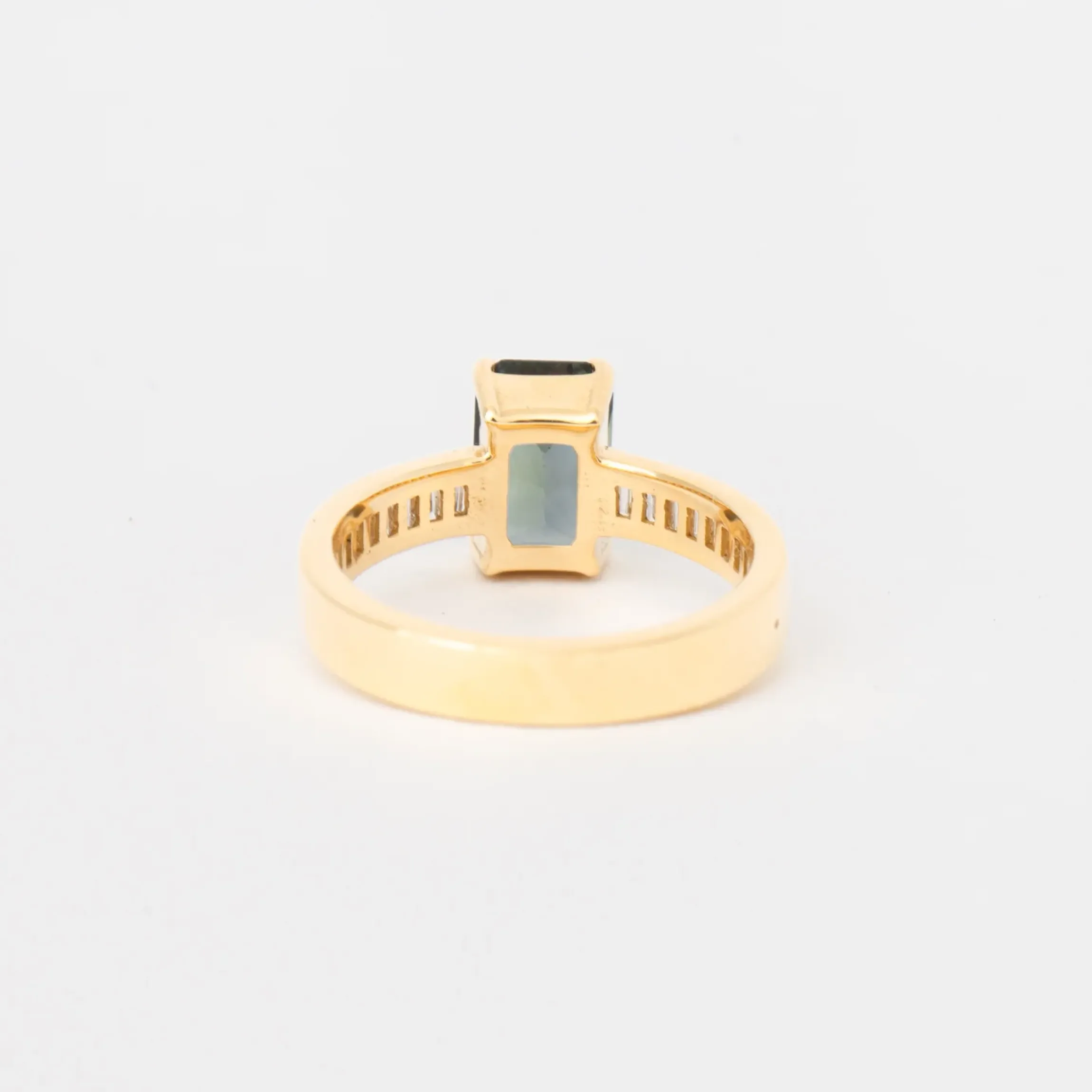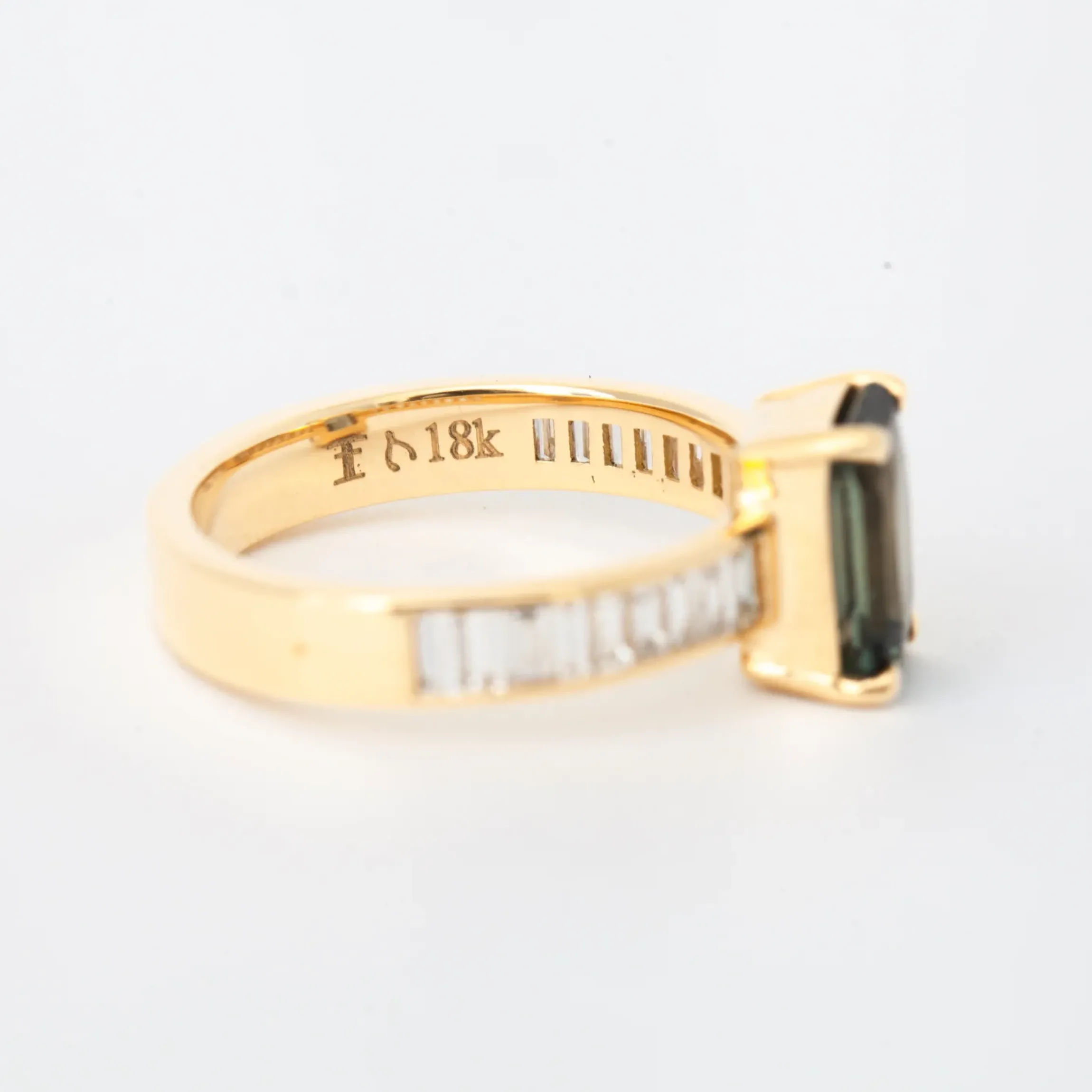 18 karat yellow gold set with a 2.06 carat radiant cut green sapphire center and baguette-cut white diamonds totaling approximately 0.60 carat.