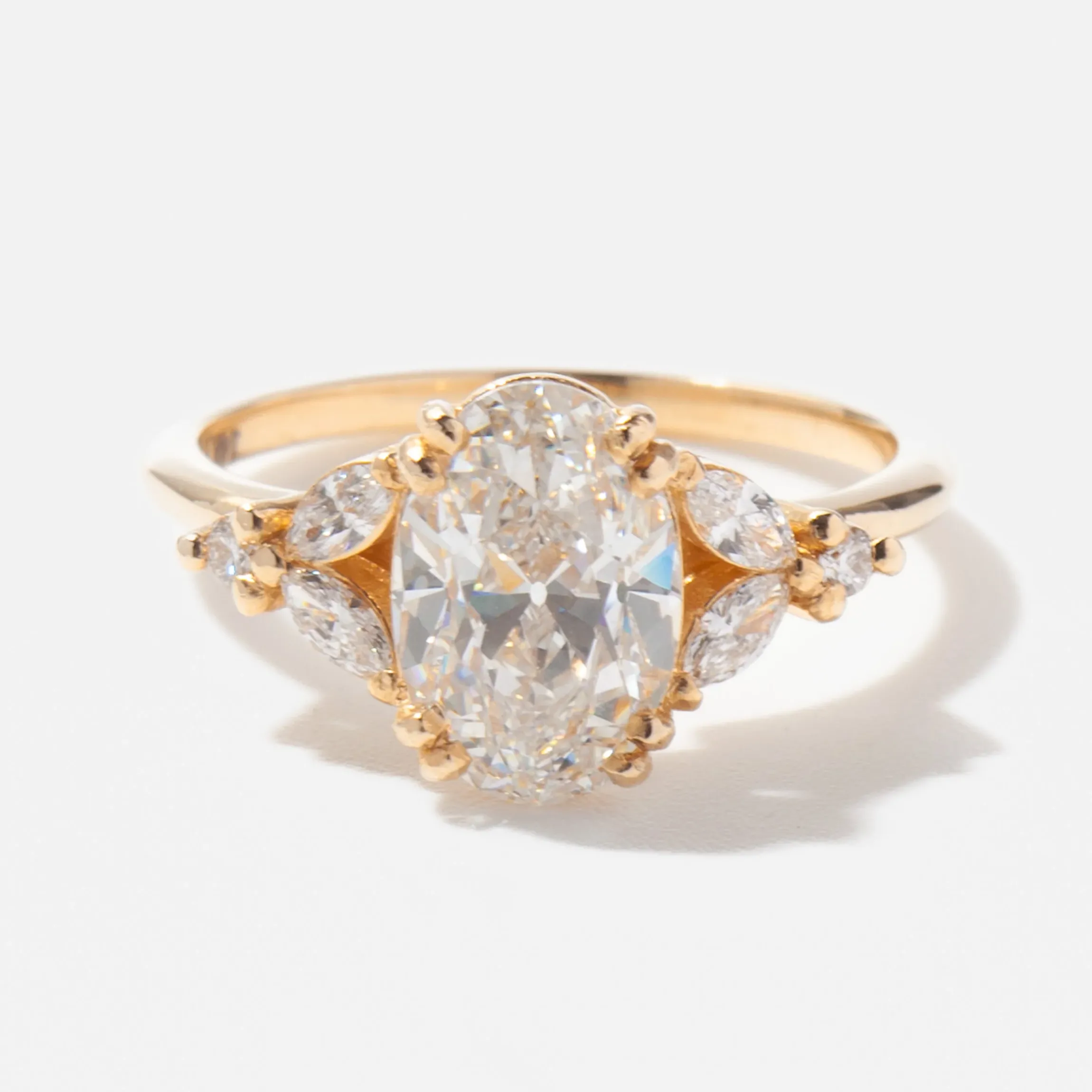 Introducing the Goldie ring, a perfect blend of elegance and playfulness. At the center is a substantial 2.14 carat oval lab-grown diamond. It is complemented by two marquise and a round diamond on each side. Set in 14 karat yellow gold, this ring exudes timeless beauty with a touch of whimsy. Ideal for statement-makers, it effortlessly transitions from formal occasions to everyday glamour. Made in the U.S.A.