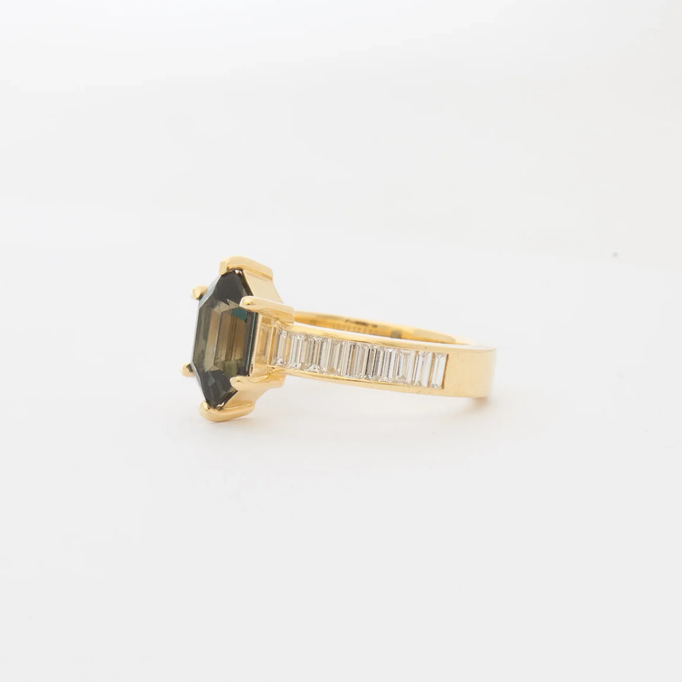 18 karat yellow gold set with a 2.06 carat radiant cut green sapphire center and baguette-cut white diamonds totaling approximately 0.60 carat.
