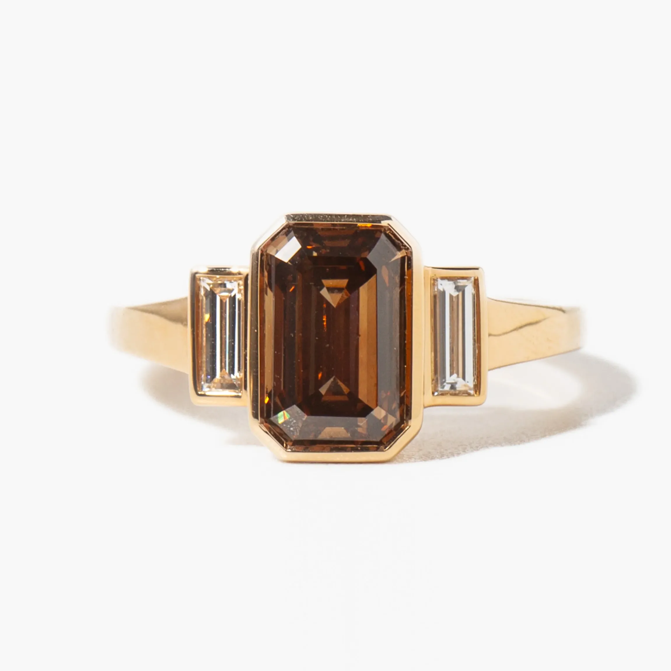 18 karat gold set with a GIA Certified 2.34 carat emerald-cut orangey-brown diamond center (L color, VS1 clarity) with two baguette white diamond accents.