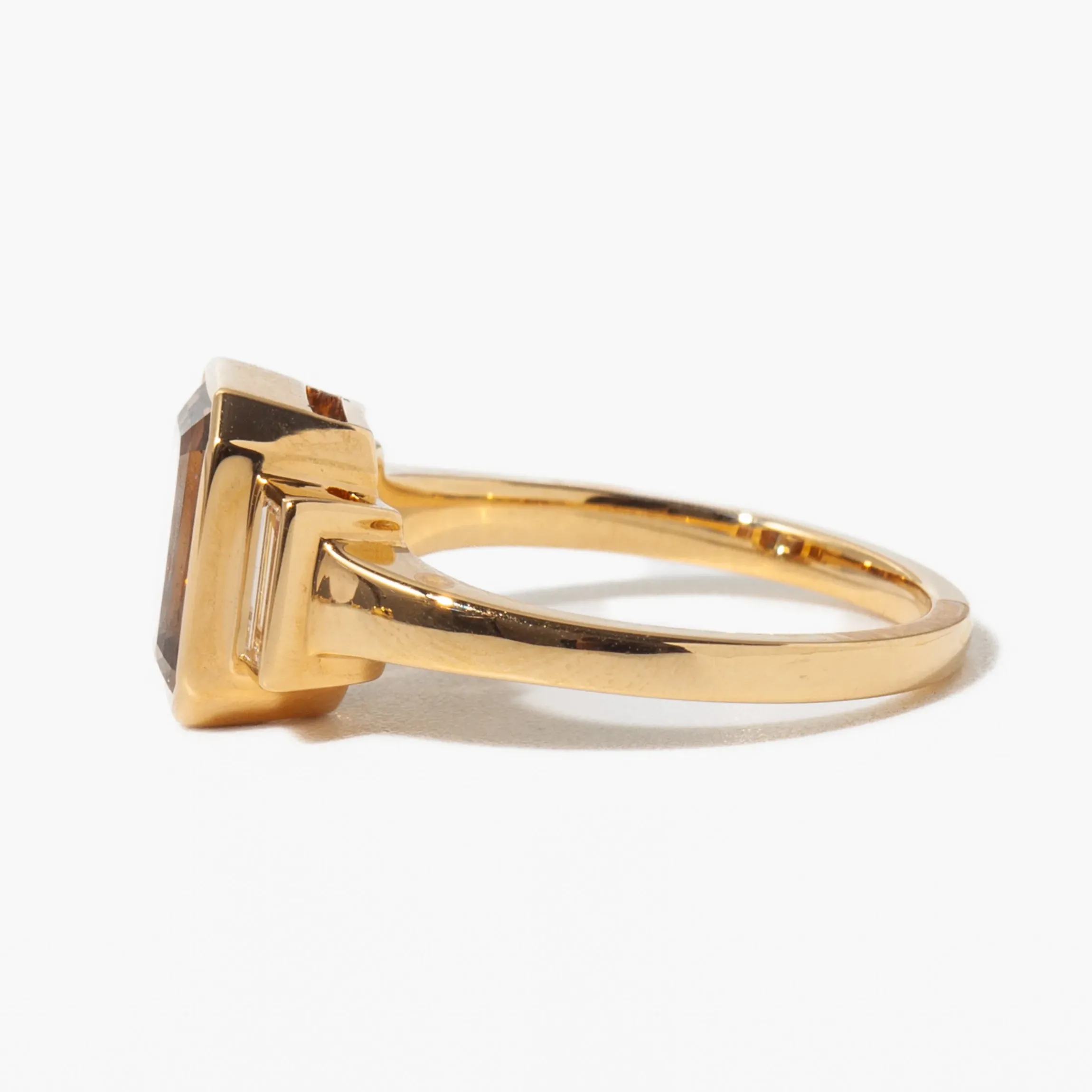 Big and bold; this ring is made for the woman who wants jewelry that can stand up to her own personality. A breathtaking emerald-cut, fancy brown diamond is framed in a thin, gold bezel, accentuating its impressive scale and unforgettable hue. A pair of baguette diamonds puts extra emphasis on the ring’s elongated silhouette and adds just the right amount of extra sparkle. Made in the U.S.A.