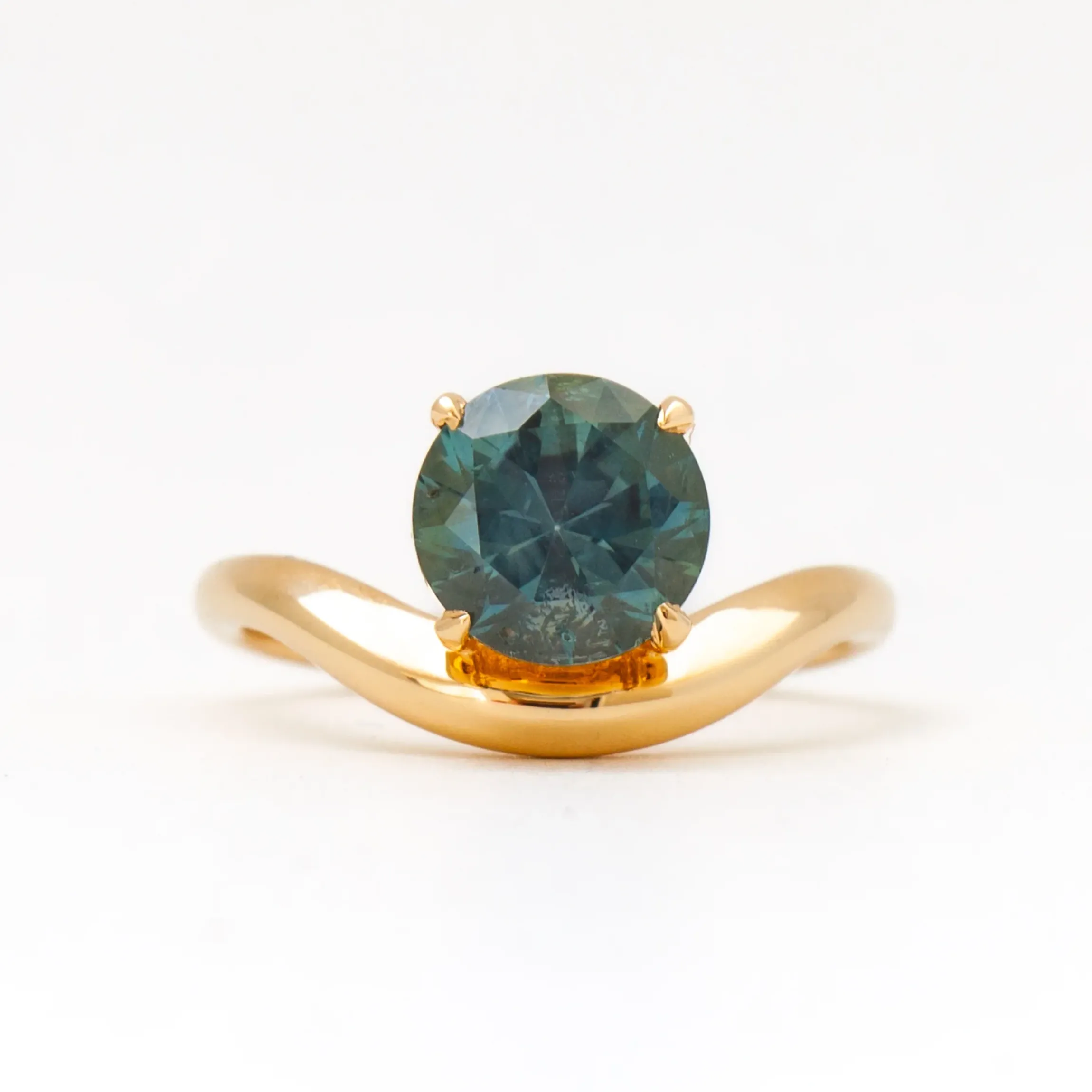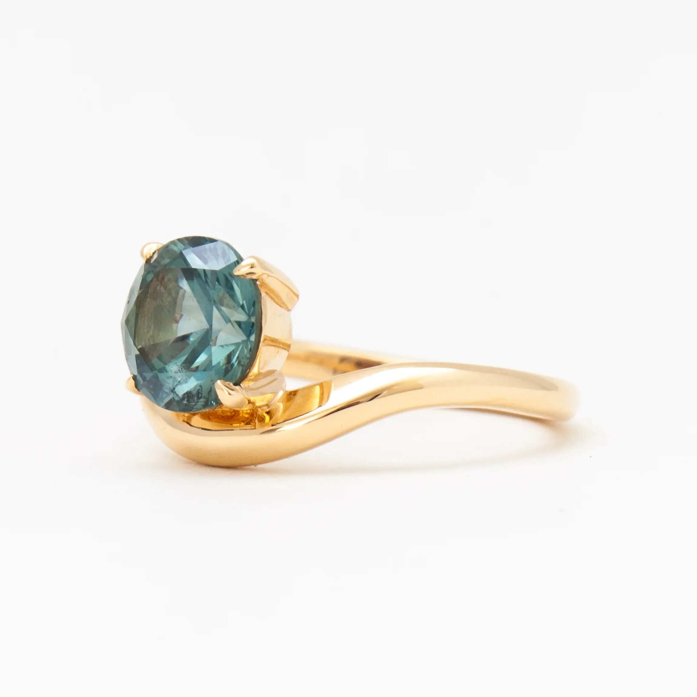 A true work of art, this new ring from The Future Fine features organic gold lines that take a gentle dip to mirror the unique curves of its center sapphire. This one-of-a-kind Piscine features a glimmering teal sapphire from Montana that pairs beautifully with the yellow hue of the setting. Its asymmetric design creates a dream-like quality, while the offset stone glimmers in perfect harmony like ripples on a tranquil pool. Designed and made in the U.S.A.