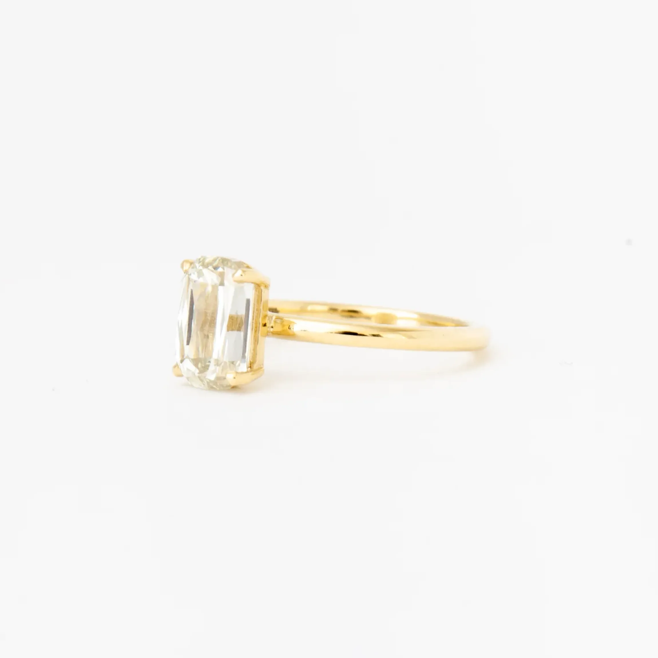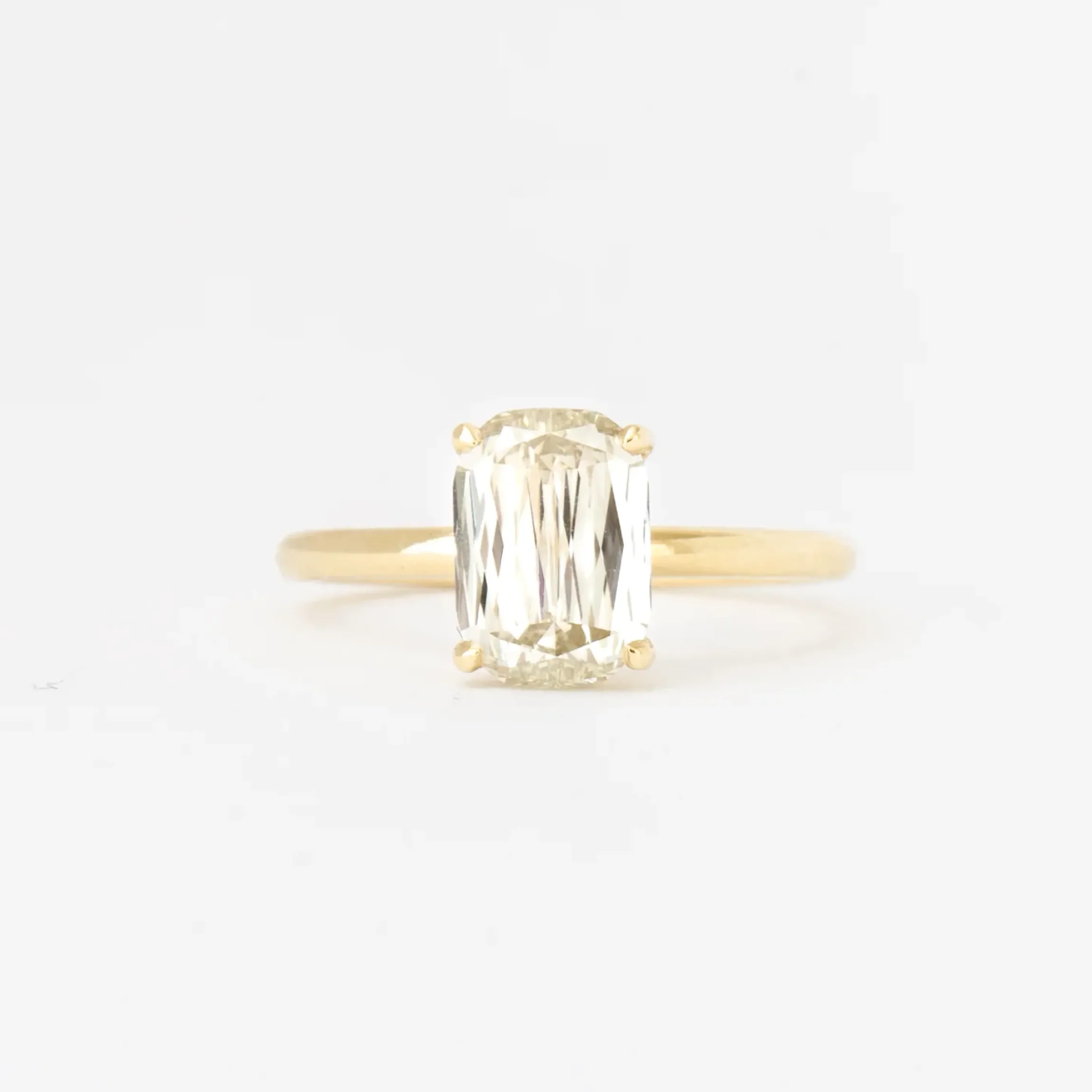 The subtle architecture of this solitaire setting lets the fantastic faceting of this unusual diamond shine its brightest. With straight sides, rounded corners, and a distinctive set of angular facets at its back, this elongated diamond blends soft curves, strong geometry, and remarkable sparkle into one look. The height of the gallery allows for bands to pair it with step-cut diamond bands for understated shimmer or amp up its brilliance with a stack of eternity bands. Made in the U.S.A.