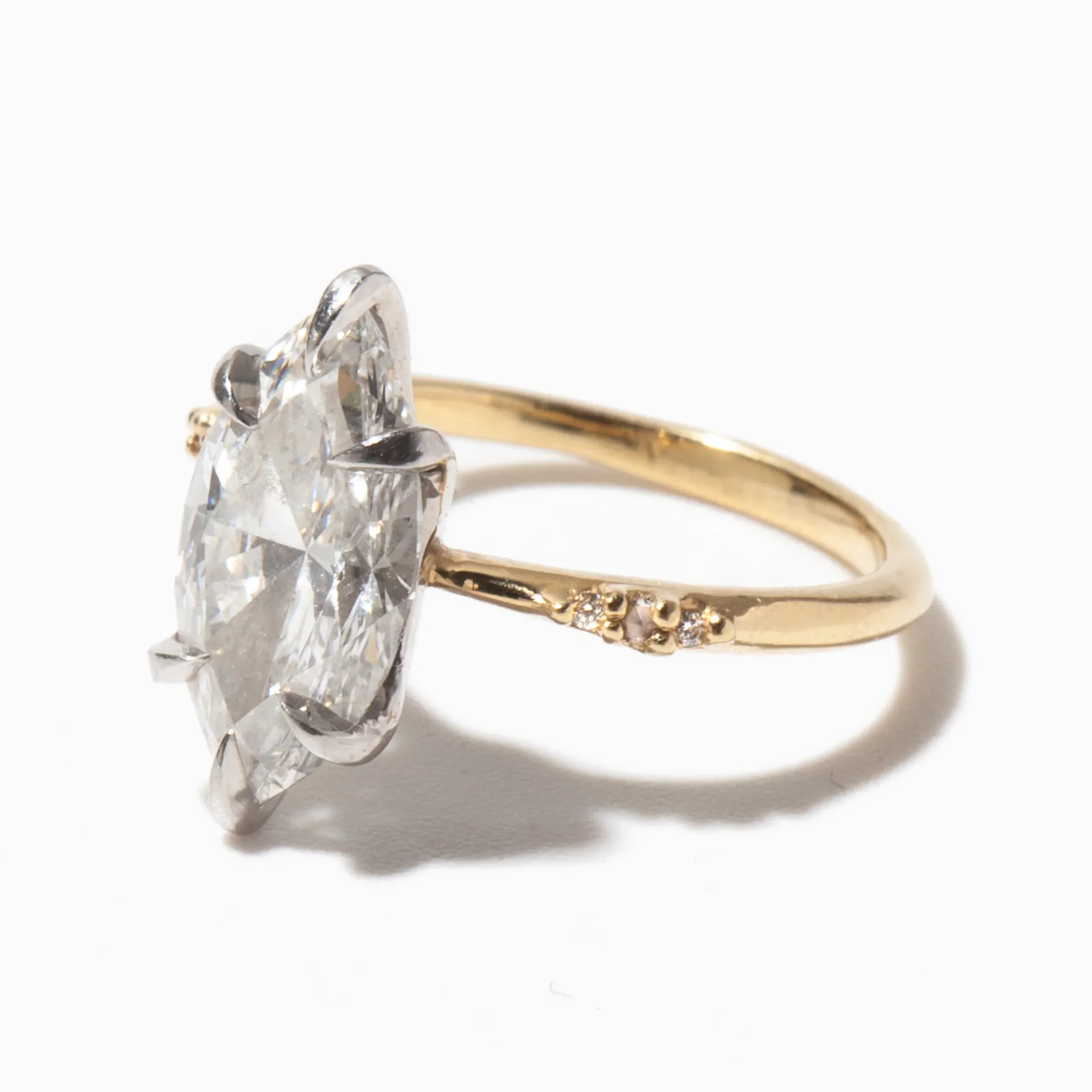 14 karat gold and platinum set with a GIA certified marquise diamond totaling 2.86 carat (E color/VVS1 clarity) and two 1.25 mm round rose-cut white diamonds, and four 0.9 mm recycled round white diamonds.