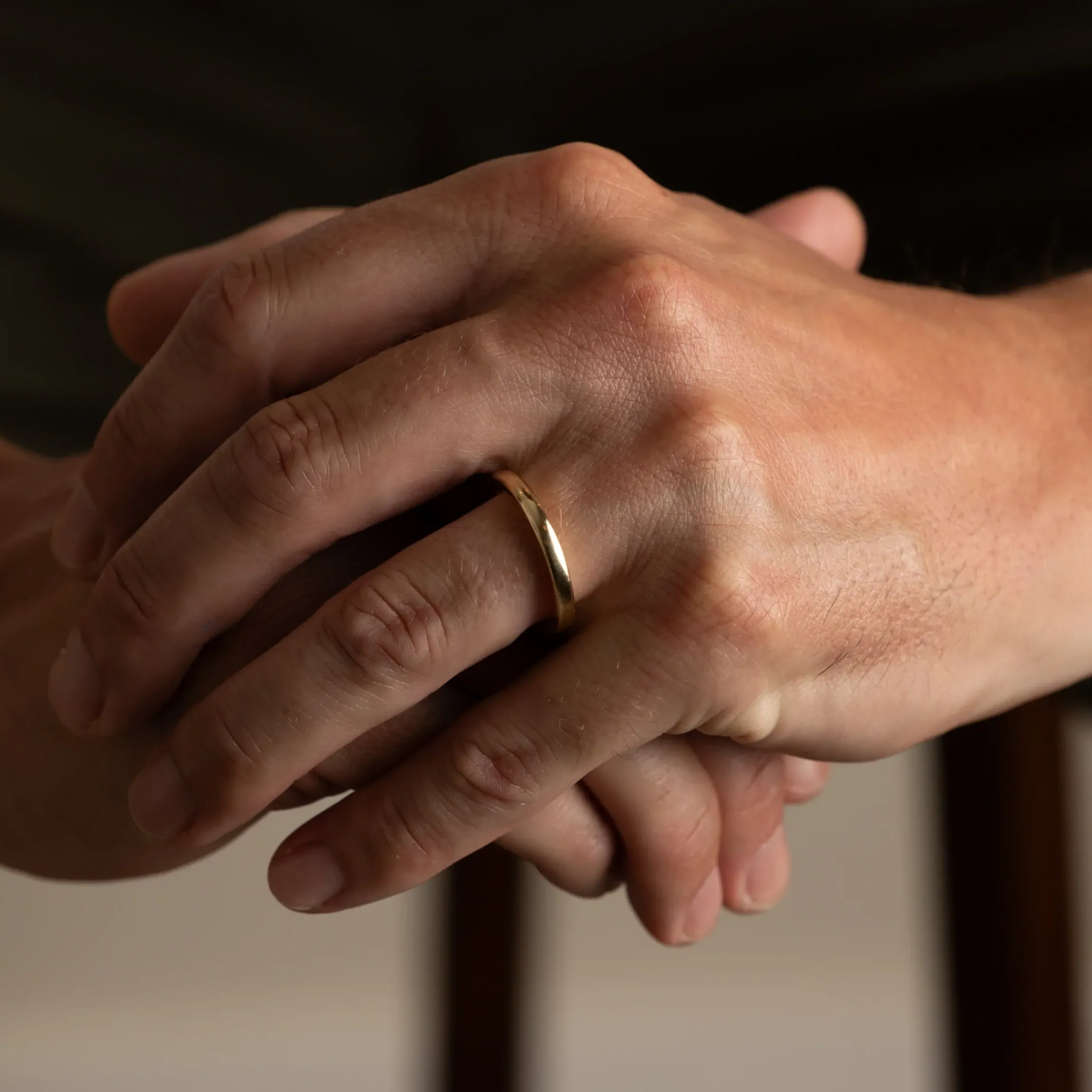 This dynamic band is an M. Hisae signature. It is abeautiful genesis of movement out of static, geometric forms. This design reflects upon the idea of embracing and flowing seamlessly through whatever life presents us as a square band morphs into a round. Every angle is perfect. This sentiment is especially reflected in love relationships, making it a beautiful, meaningful, and sleek wedding band.