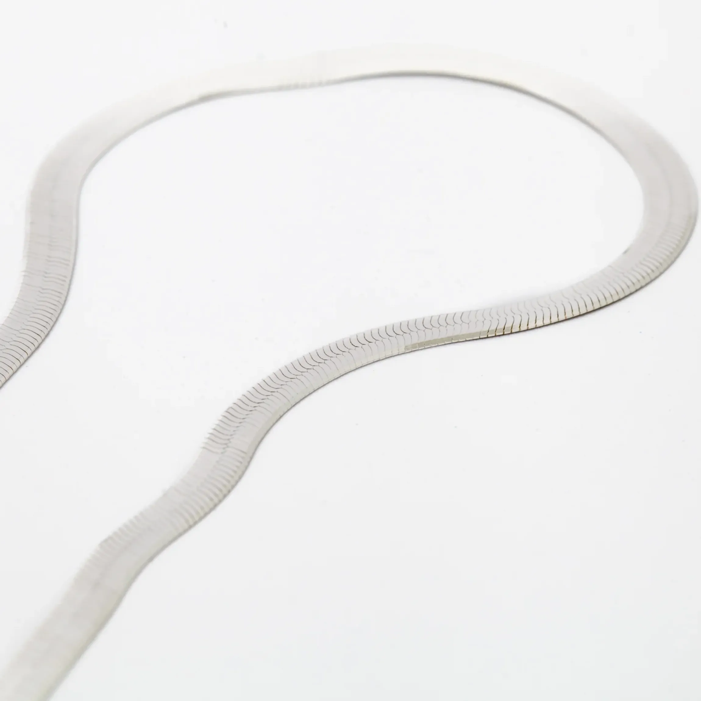 Like it’s golden counterpart, the woven sheen of this herringbone chain pours across your skin like a silvery string of light. The nearly seamless chain adds a gleaming, structured look to any outfit, making it a perfect foil to delicate chains and pendants of your choice. Finished with a lobster clasp. Imported.