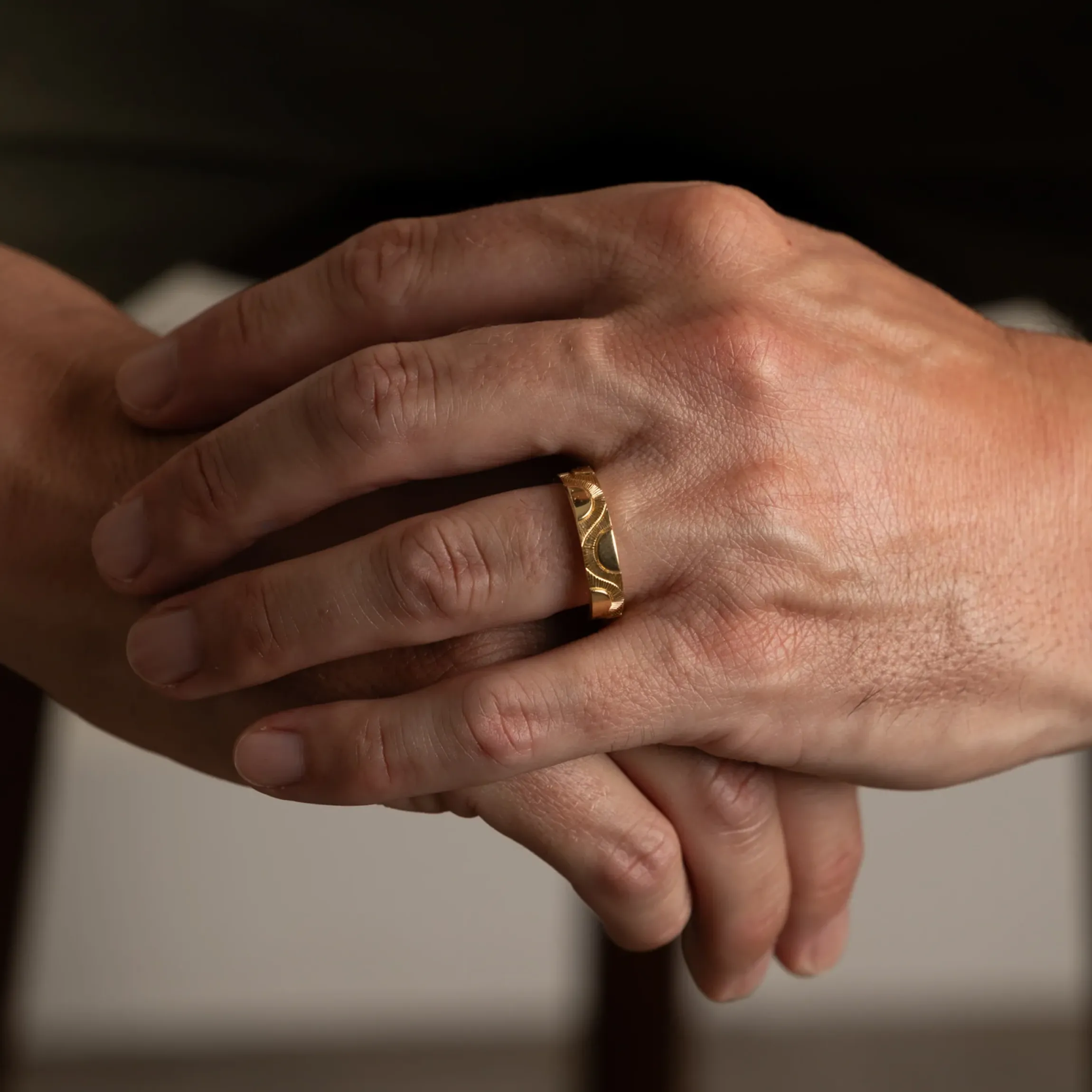The engraved sun wedding band is a modern design an artful twist. This band features an interior comfort fit band, and on the outside a geometric engraving in the shape of a sun beaming with light.