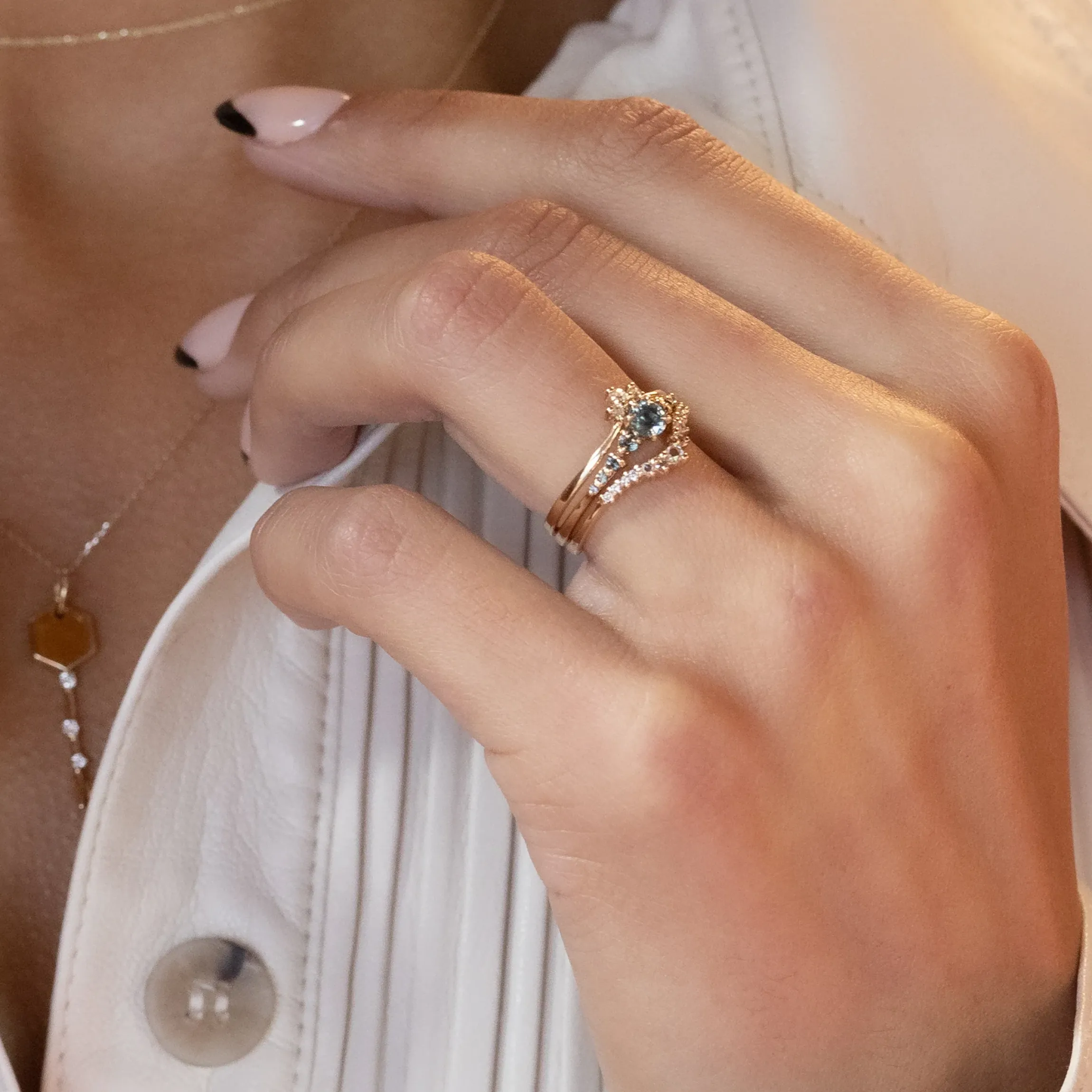 Big sparkle comes in small packages like the triple of rose-cut diamonds that accent the subtle peak of this gold ring. A fundamental ring in Laurie Fleming’s collection, wear this piece as the foundation of any stack. Use it as a subtle topper over her more extravagant pieces or wear them in a pair to frame your engagement ring. Made in Canada.