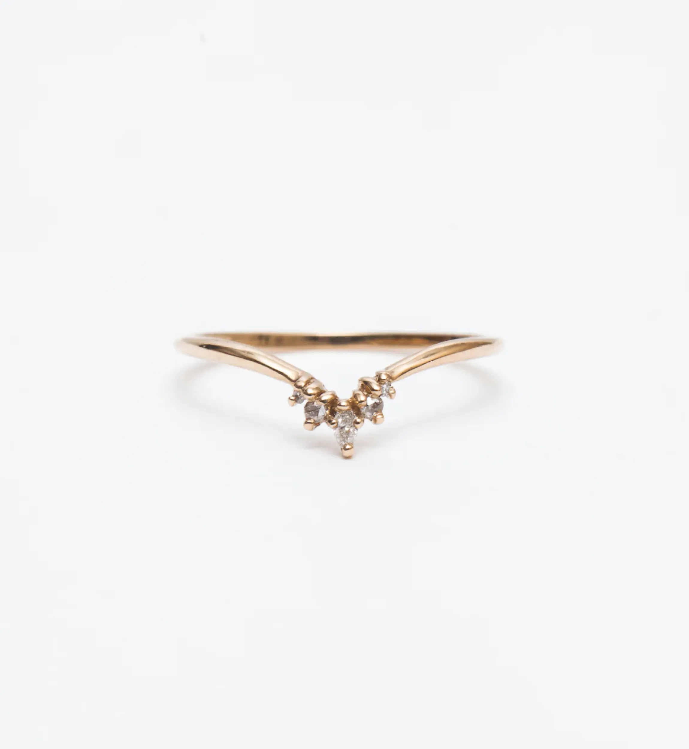 14 karat gold with one 2.5 mm x 1.25 mm marquise white diamond, two 1.3 mm round rose-cut white diamonds, and two 0.9 mm recycled round white diamonds totaling 0.044 carat.