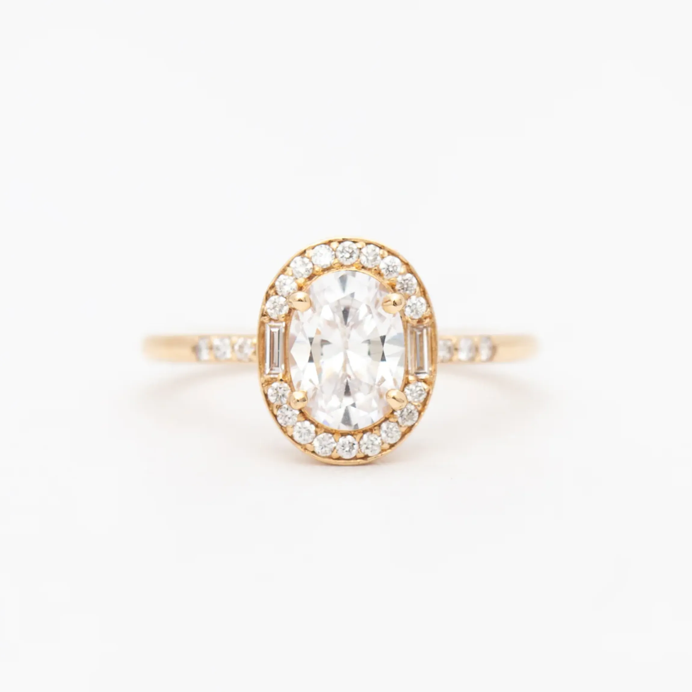 This beloved setting by San Francisco-based designer Porter Gulch combines vintage energy with modern appeal. A sparkling oval diamond sits in its center, surrounded by a halo of rounds interrupted only by two baguettes that add texture and intrigue to a traditional design. Stack it with curved bands to create a more expansive silhouette that fills your finger. Made in the U.S.A.