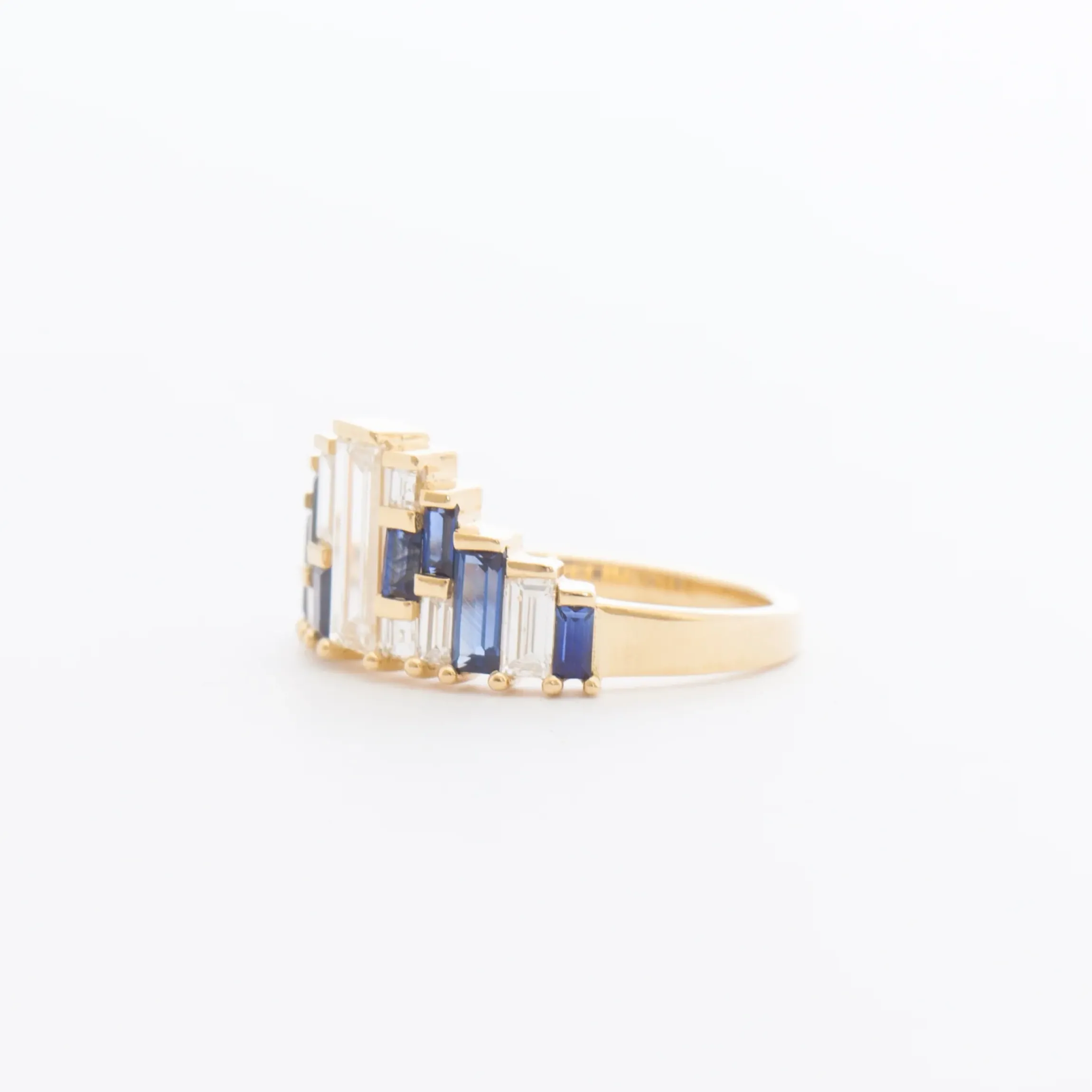 Artemer does it again with this geometric piece of perfection. Both diamond and sapphire baguettes combine to create a staggering, shimmering silhouette. Wear it solo as a modern engagement ring or pair it with a plain or textured gold band. Made in Israel.
