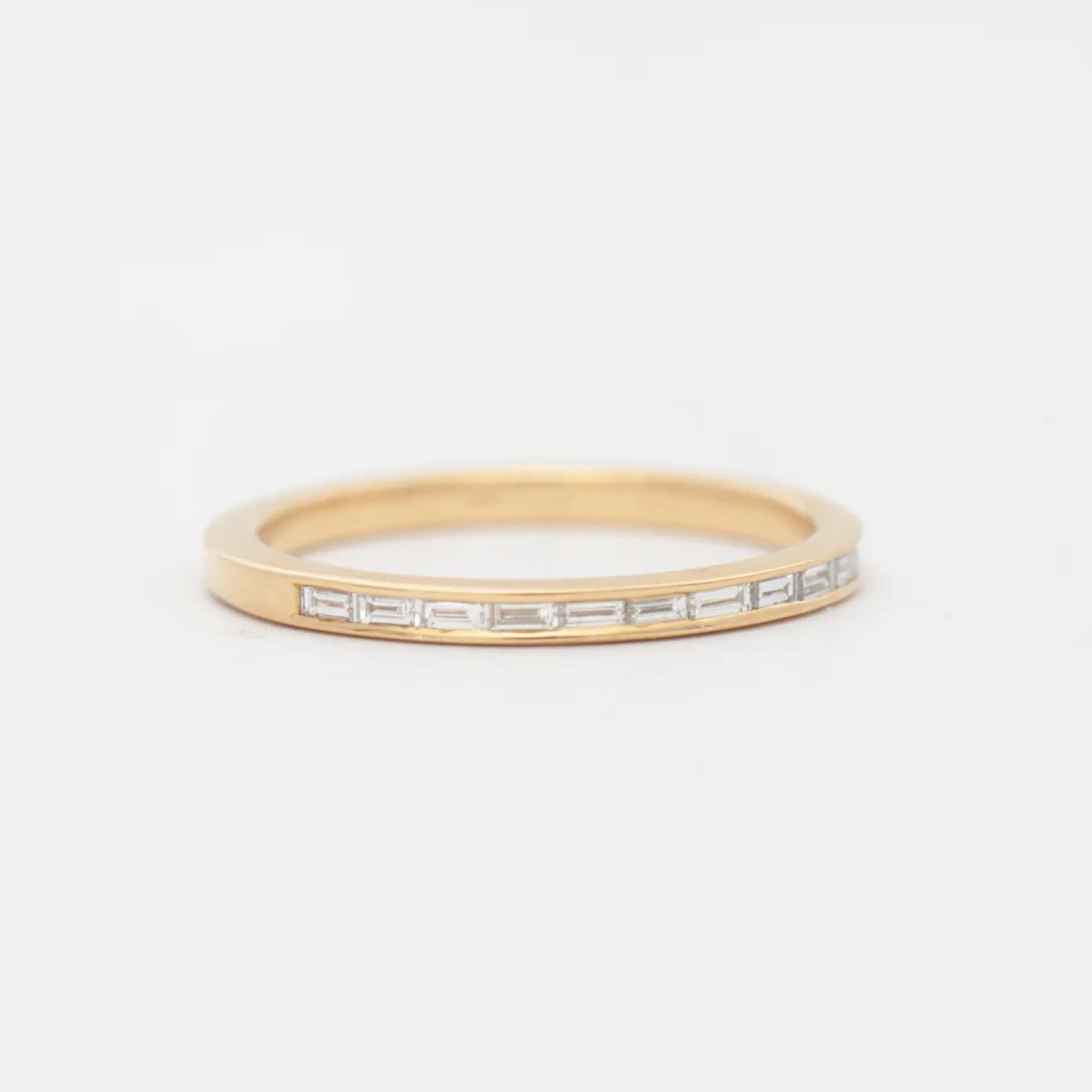 This simple yet stunning band is the perfect mix of elegance and sophistication. Its horizontally-set row of baguette diamonds brings out a unique sparkle from every step-cut stone—a hall of mirrors in the daintiest of forms. Made in Israel.