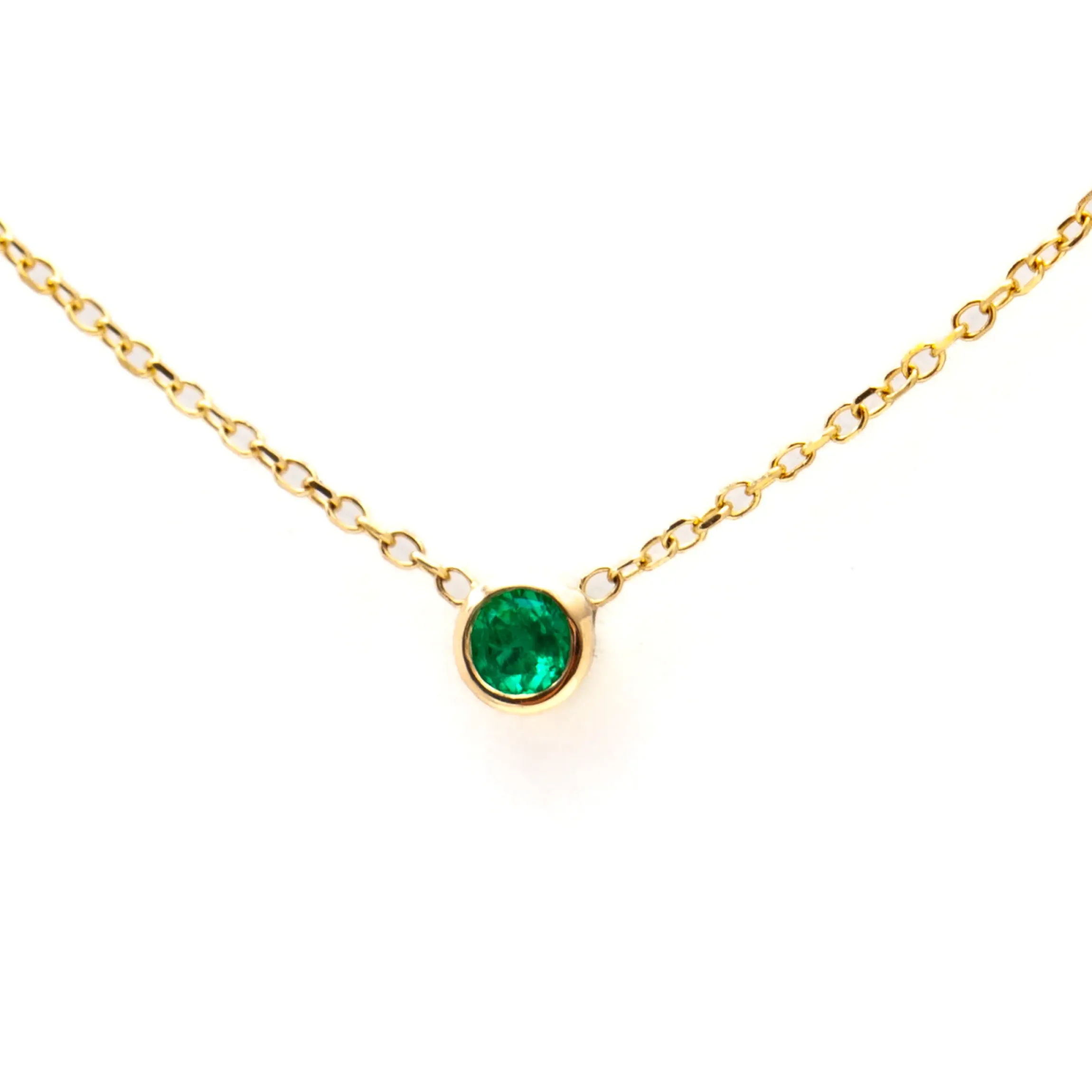 Just because the emerald is all by its lonesome doesn’t mean it’ll be ignored. If anything, the delicate proportions and concise design make it impossible to miss the elegant shine of this round green emerald hanging from fine gold chain. Whether you always walk out the door with a layer of three necklaces or you’re just looking for the one perfect item to make your outfit, this necklace will be the answer. Finished with a lobster clasp closure. Made in the U.S.A.