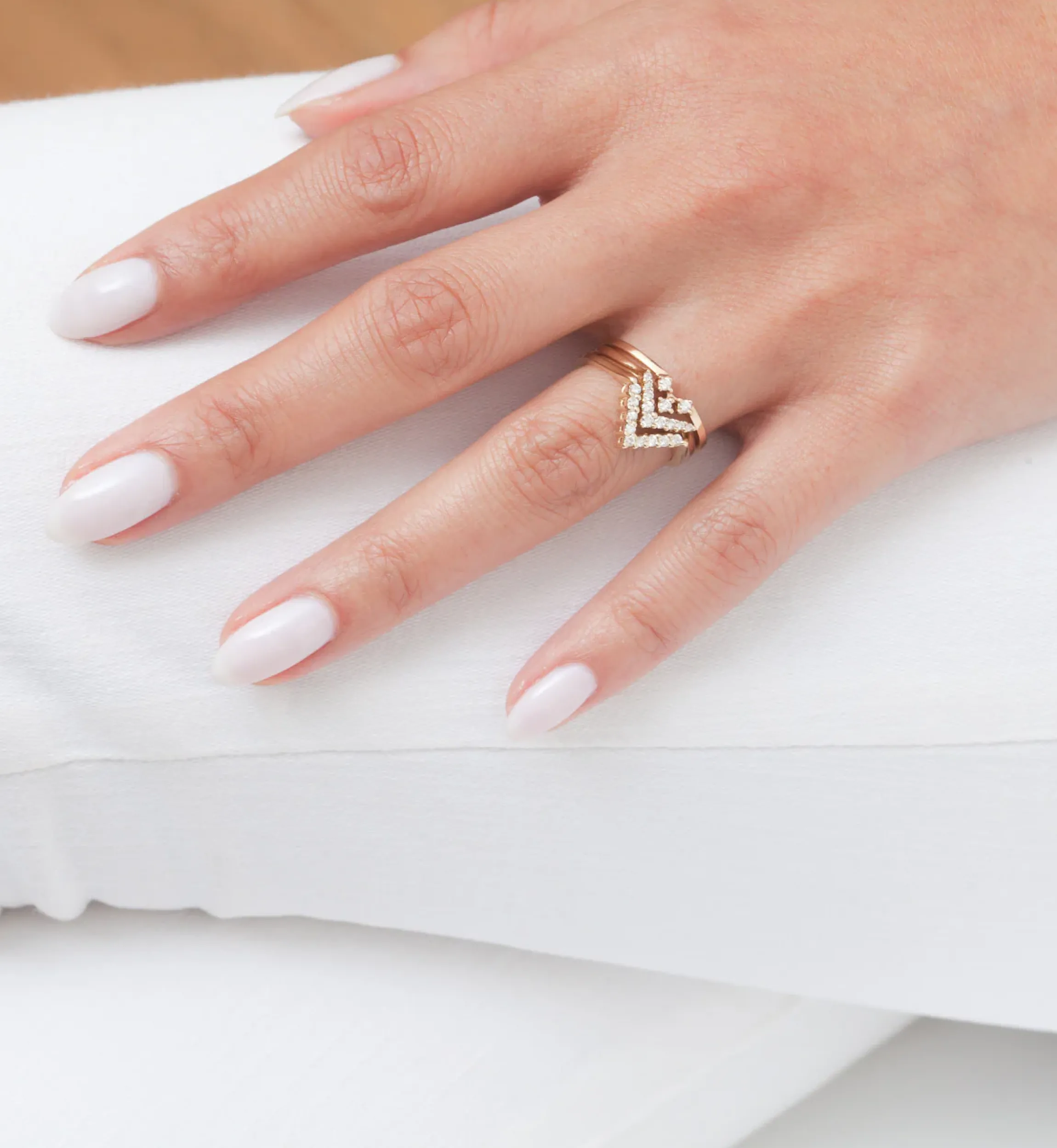 Good things might come in small packages, but great things come in petite ones. Inspired by the triangular detailing that appears on several other rings in Anna Sheffield’s line of Bea rings, this style might be diminutive, but it’s thoroughly charming. Four-prong settings form a delicate chevron of three diamonds making it a simple, sparkling crown when worn with your engagement ring. Designed in New York.