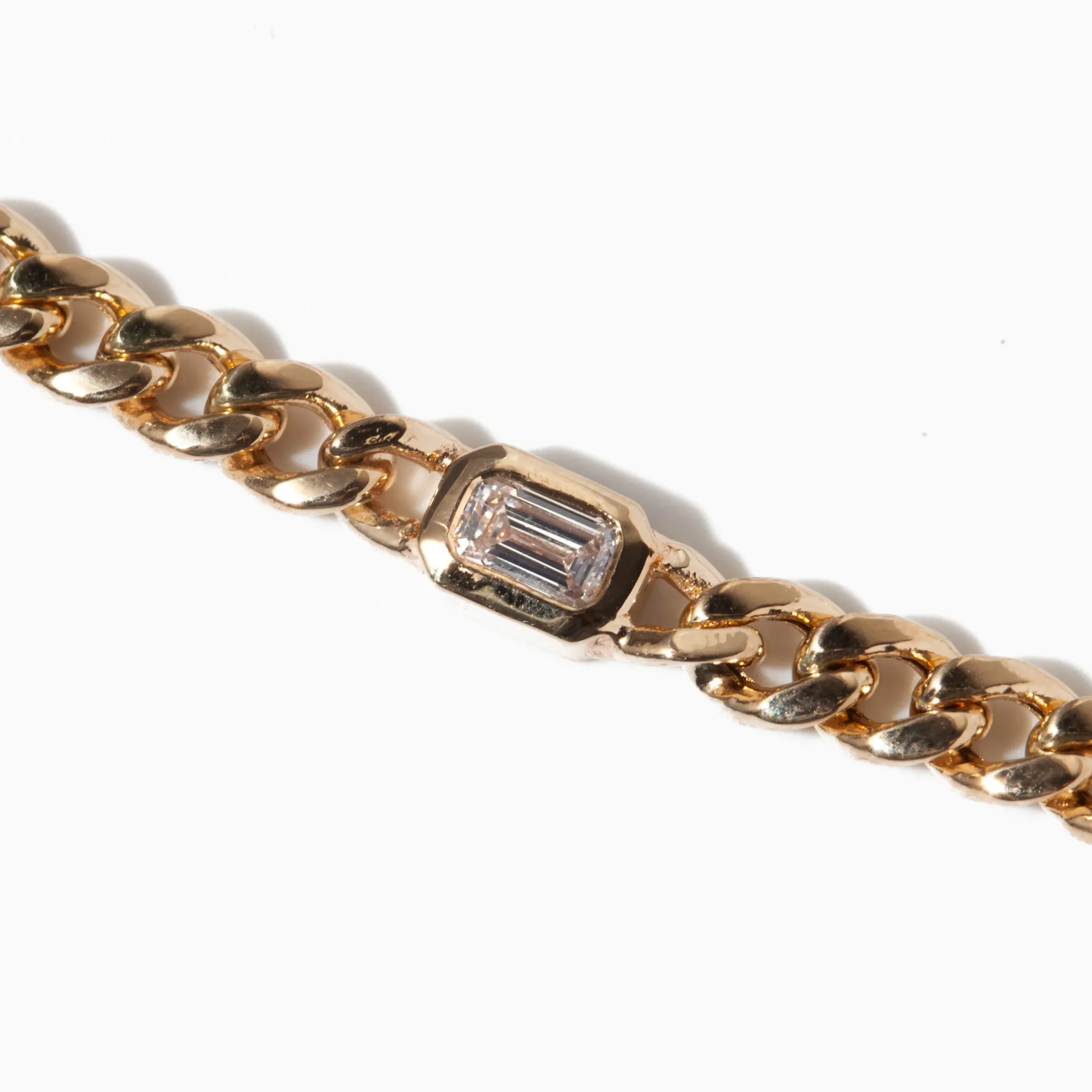 Add some sparkle to your everyday style. The shimmering diamond, set in a sleek bezel setting, is framed by a strong, golden curb chain. A perfect balance of elegance and playfulness. Designed in Los Angeles.