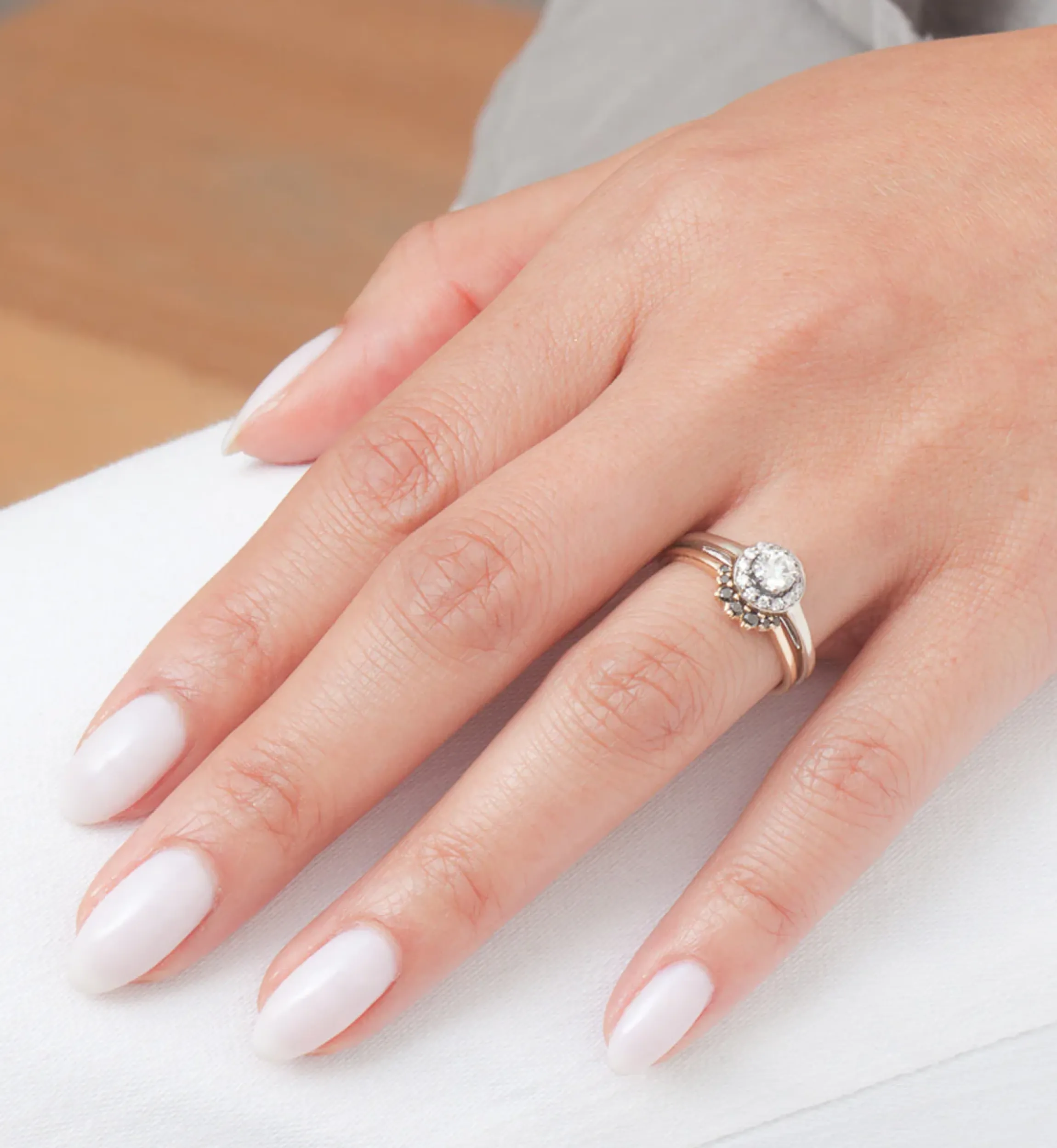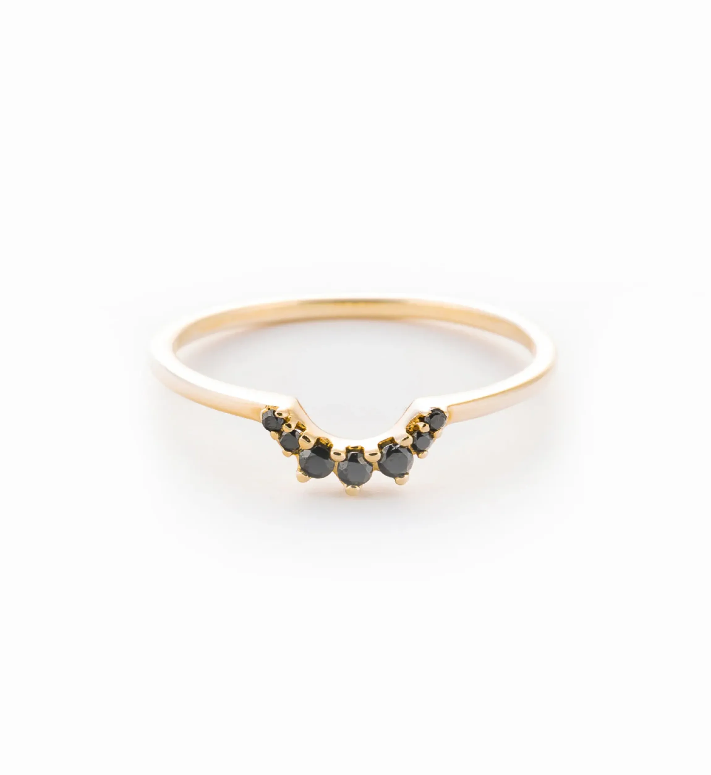 A delicate array of seven prong-set black diamonds create a smokey and darkly romantic look. Intended for wear alongside Anna Sheffield’s classic solitaire styles, this ring features diamonds that taper in size to create a beautiful curve that frames and accentuates other rings. Available in a variety of metals and with different gems, this signature band can be customized to become the perfect complement to your engagement ring. Designed in New York.