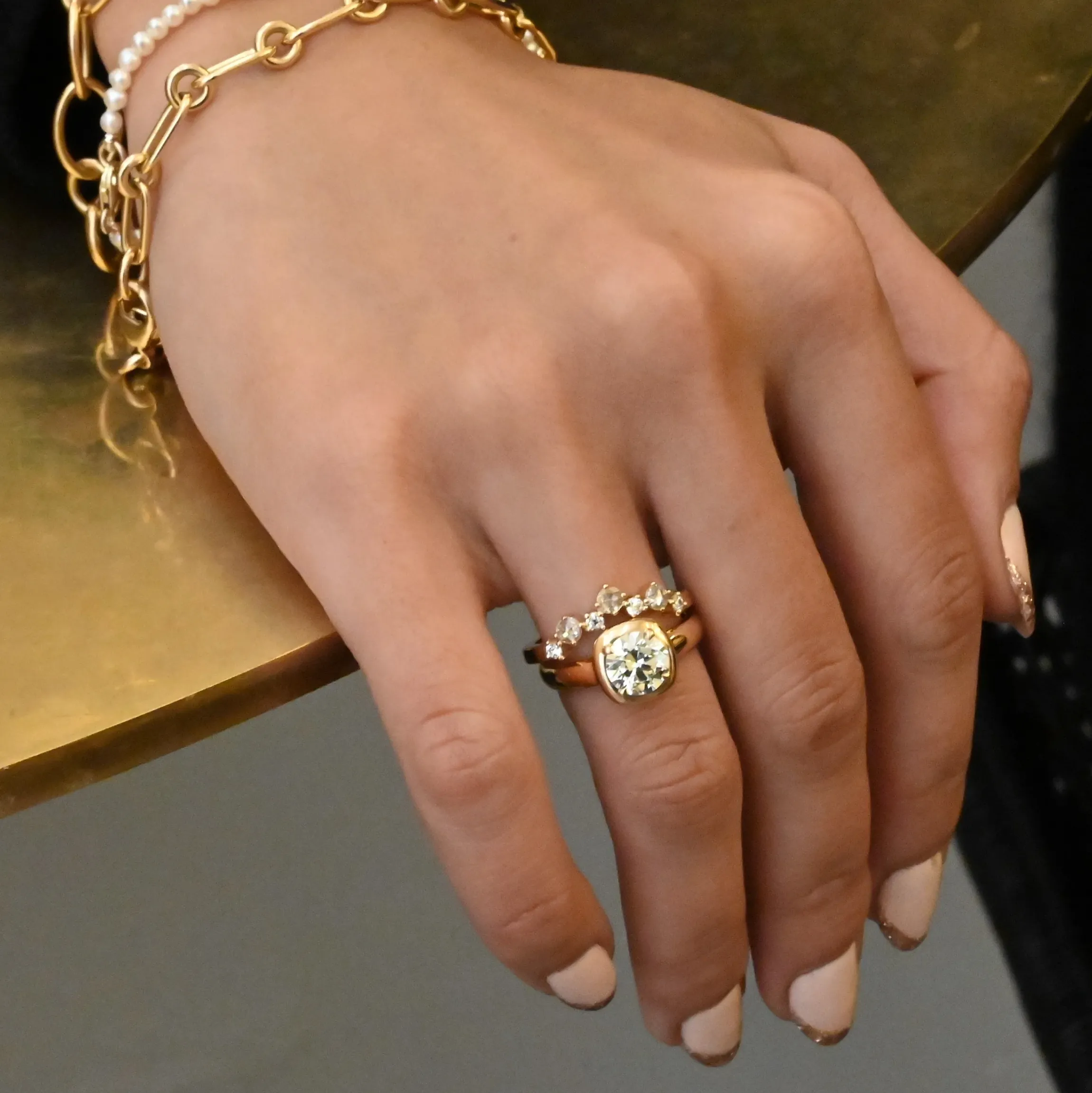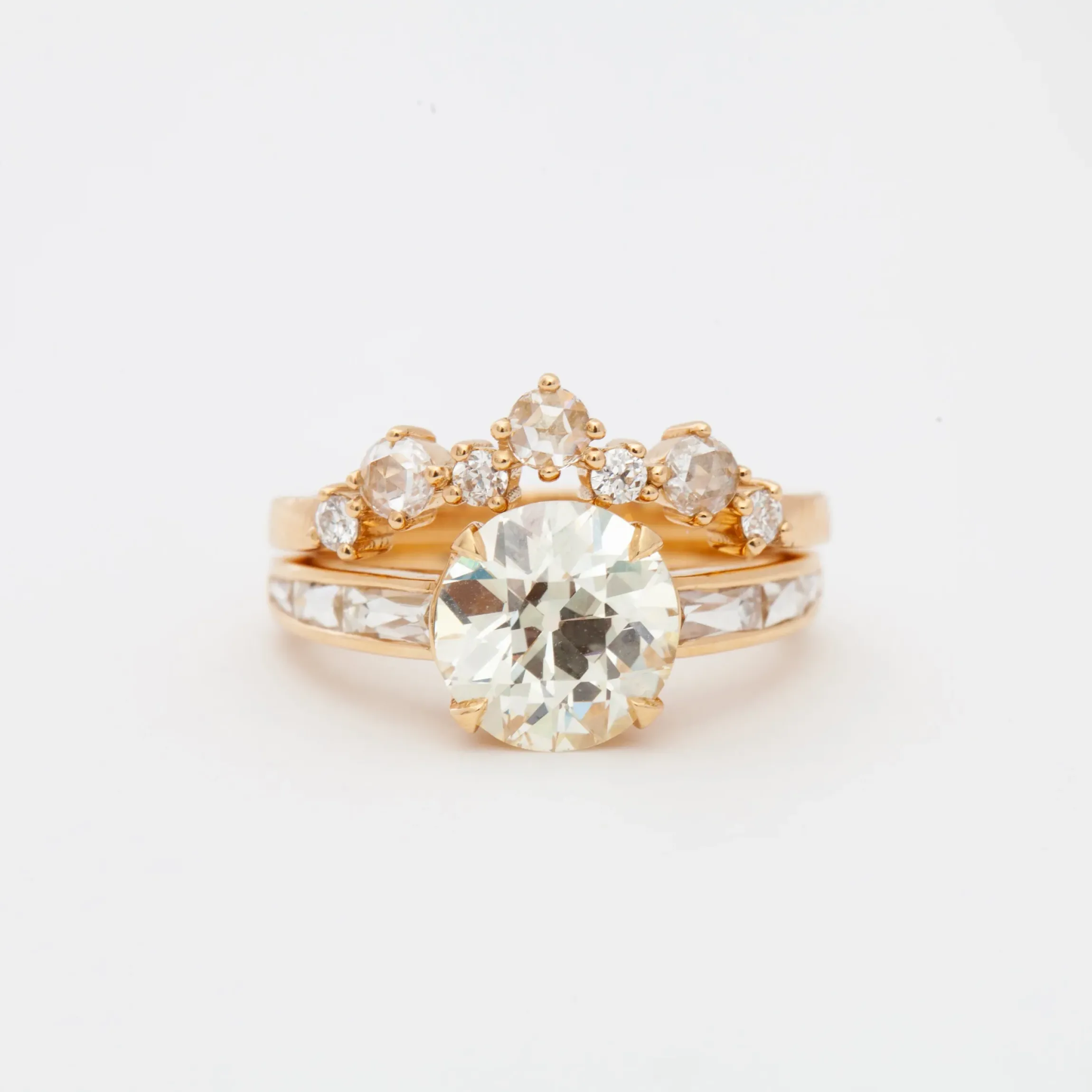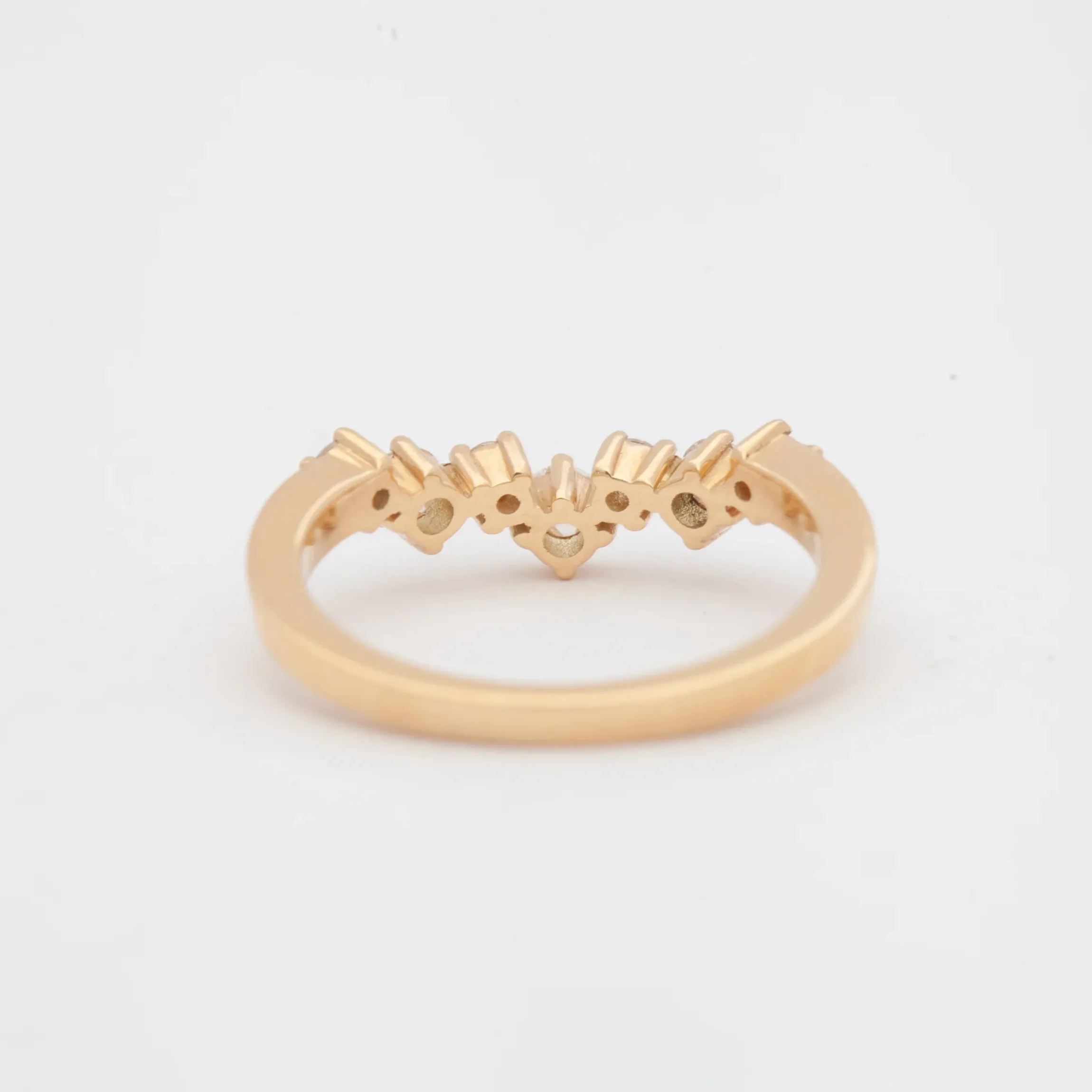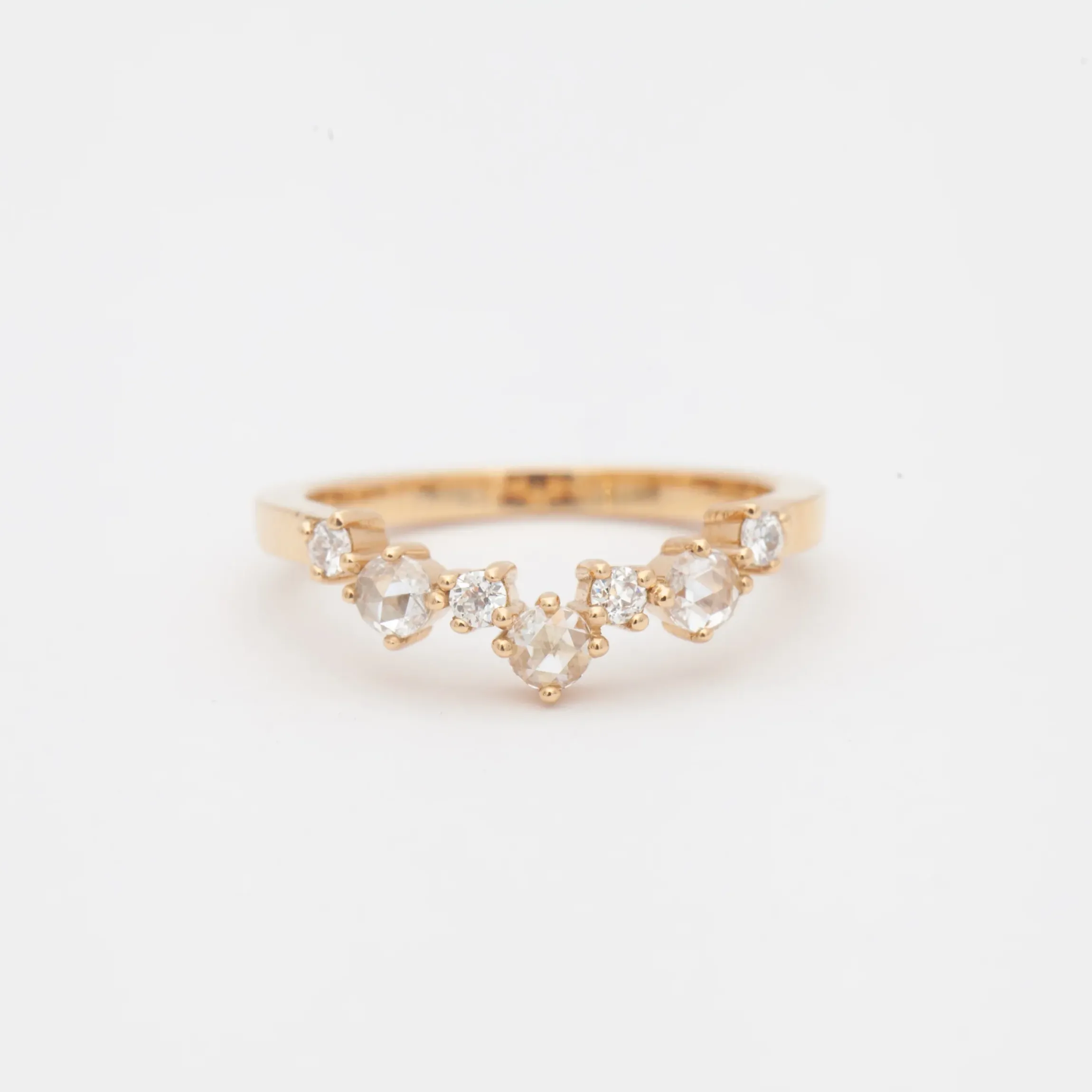 This curved band combines soft shimmer with bright sparkle for an unforgettable way to accentuate your engagement ring. Alternating rose-cut and Old European diamonds form a staggered curve that wraps around your ring with a whimsical mix diamond textures. Celebrate a special anniversary by putting this unconventional stacker atop a classic solitaire and band set. Made in the U.S.A.