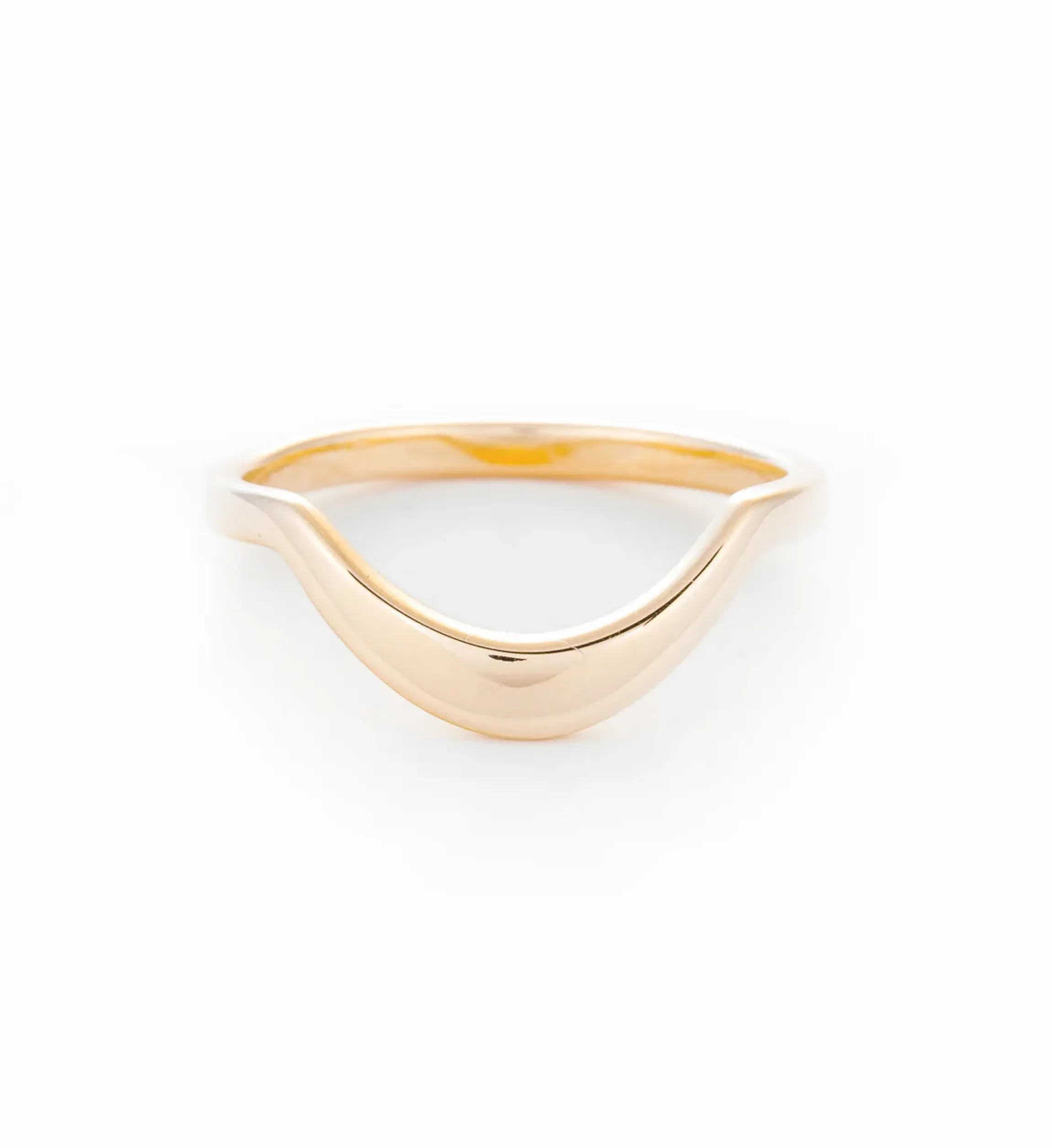A polished swoop of solid gold adds a sensuous feeling to the traditional wedding band. This gently curved design widens at its center, inspired by a handwritten stroke, to create a subtle accent around other rings. The band’s proportions gently hug solitaire and halo settings without overwhelming them for a natural, organic pairing. Wear it in a stack it with other curved styles in the Anna Sheffield collection for layers of different colors and textures. Designed in New York.