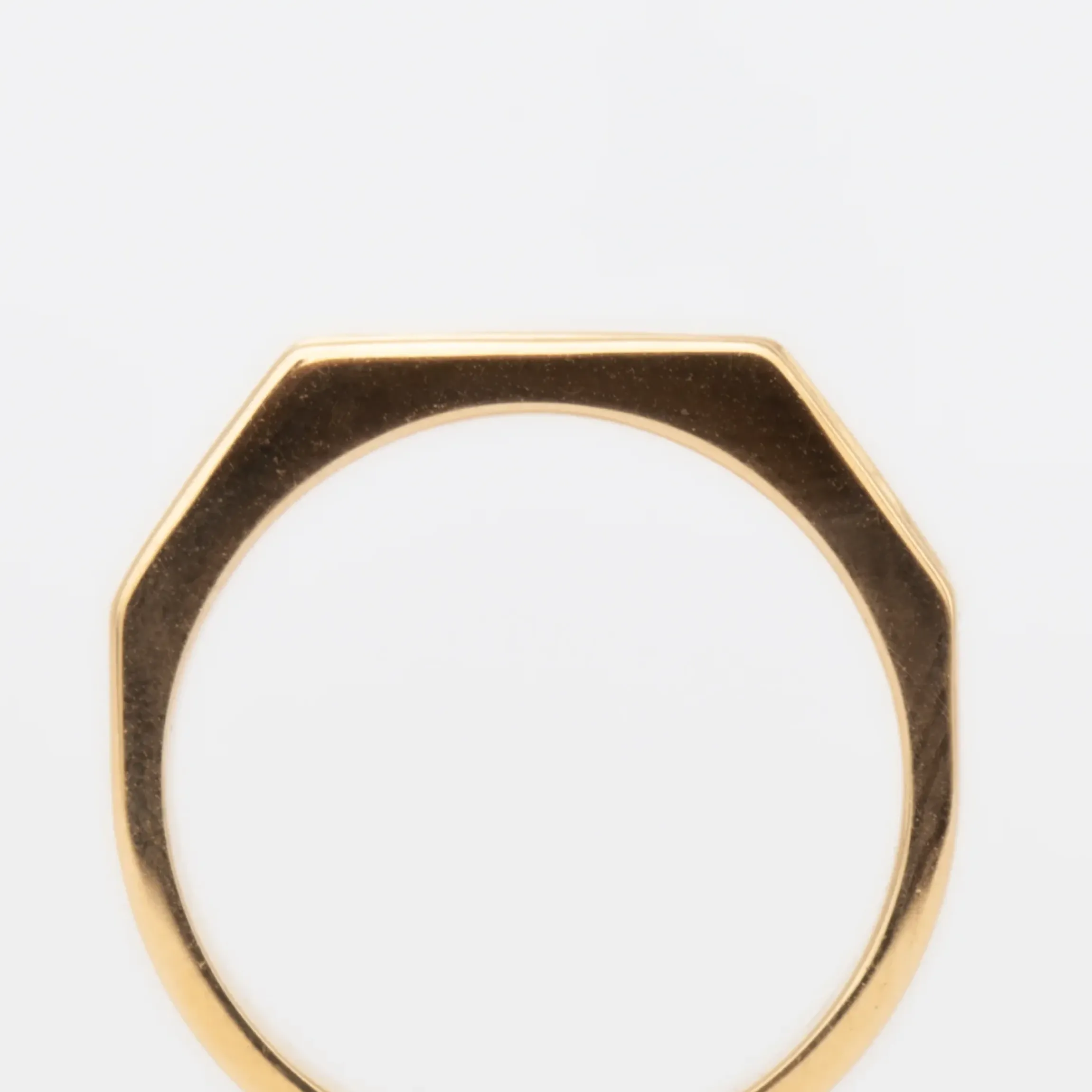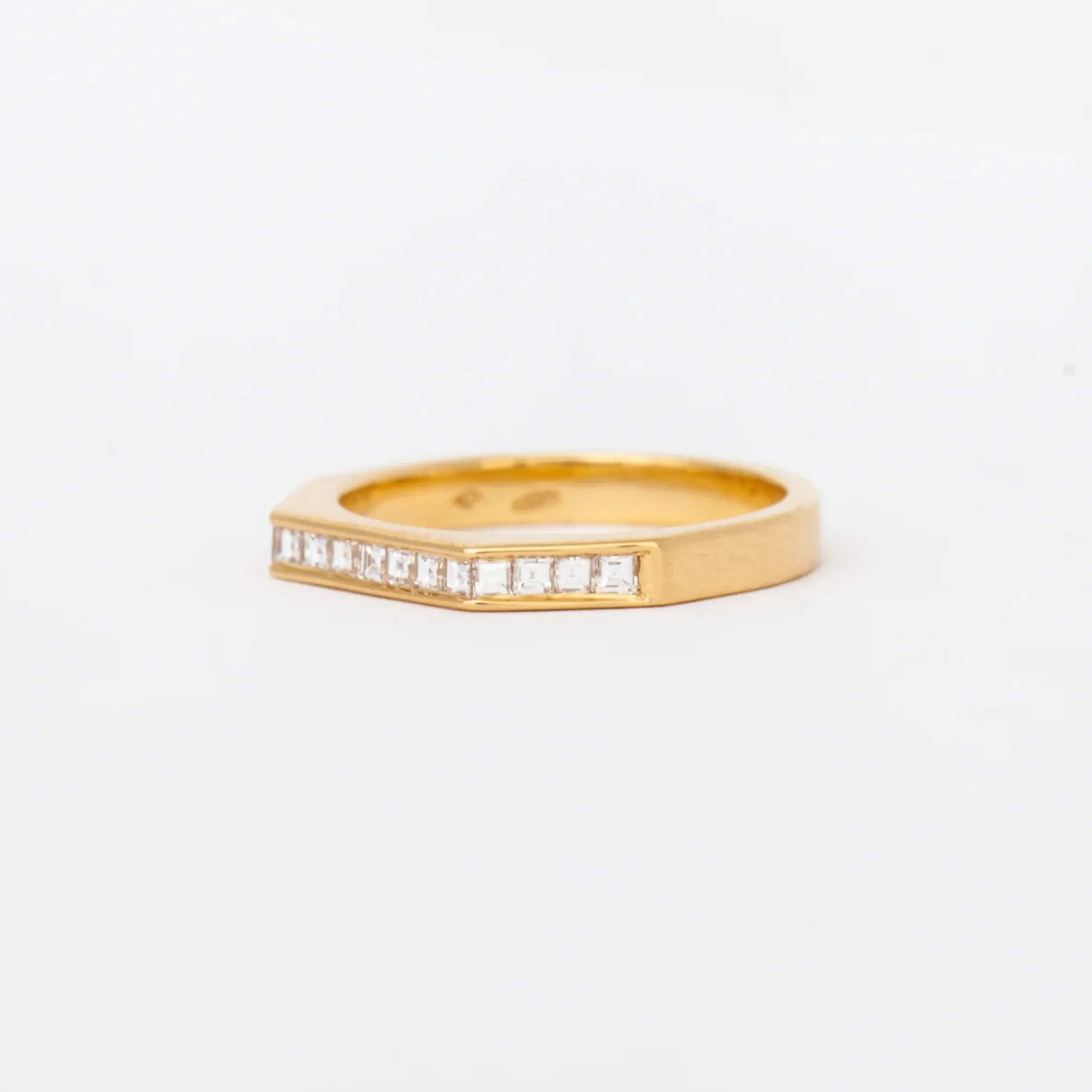This unique band weaves together architectural and geometric elements in a way that only Artemer can. White carre cut diamonds are set along three angled passageways, allowing them to sit flush against the skin while glimmering in new ways as they bend around the finger. Made in Israel.