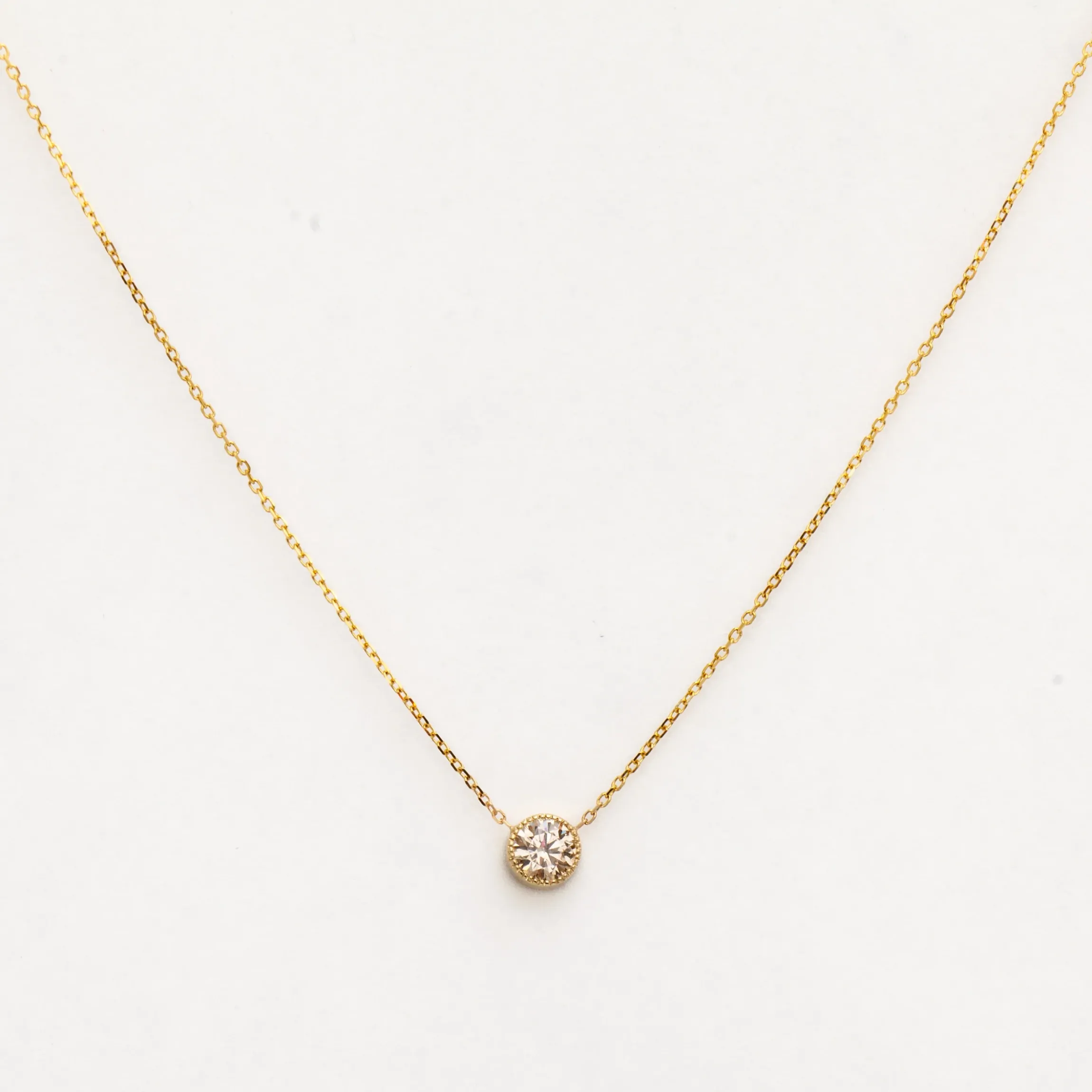 For someone looking for a warm sparkle to add to their necklace stack, try this. A champagne diamond is stationed alond a delicate cable chain and encompassed in the signature Jennie Kwon milgrain detail. Finished with a spring ring clasp. Made in the U.S.A.