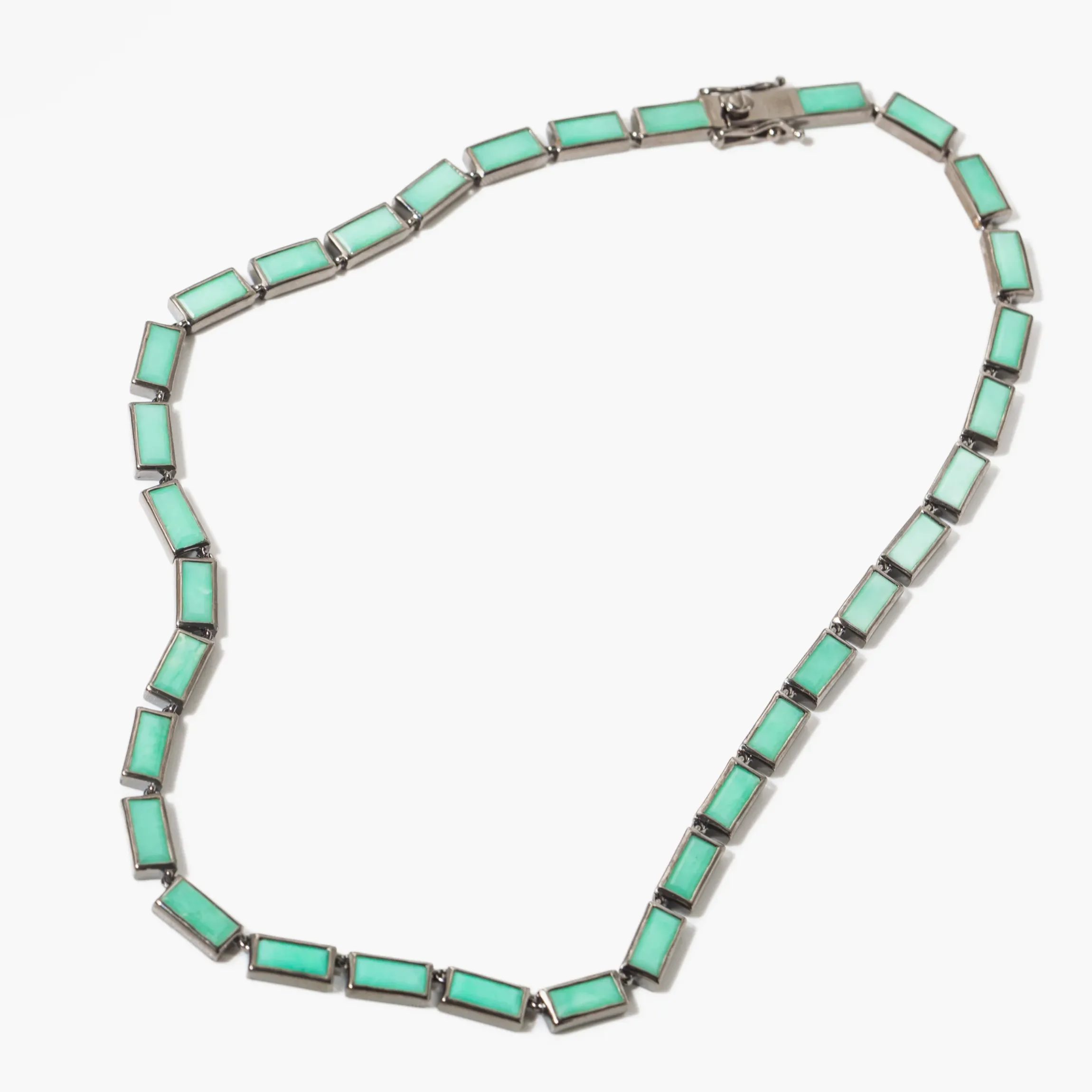 In true Nak Armstrong craftsmanship comes the Chrysoprase Small Linear Baguette Tile Rivière Necklace, an innovative alternative to the traditional tennis necklace. Small rectangular chrysoprase gemstones are set into thick sterling silver covered in black rhodium bezels. Heavy in metal and stones, this is an ideal piece for those who like to express their individual style while simultaneously loving color. Designed in Austin, Texas.