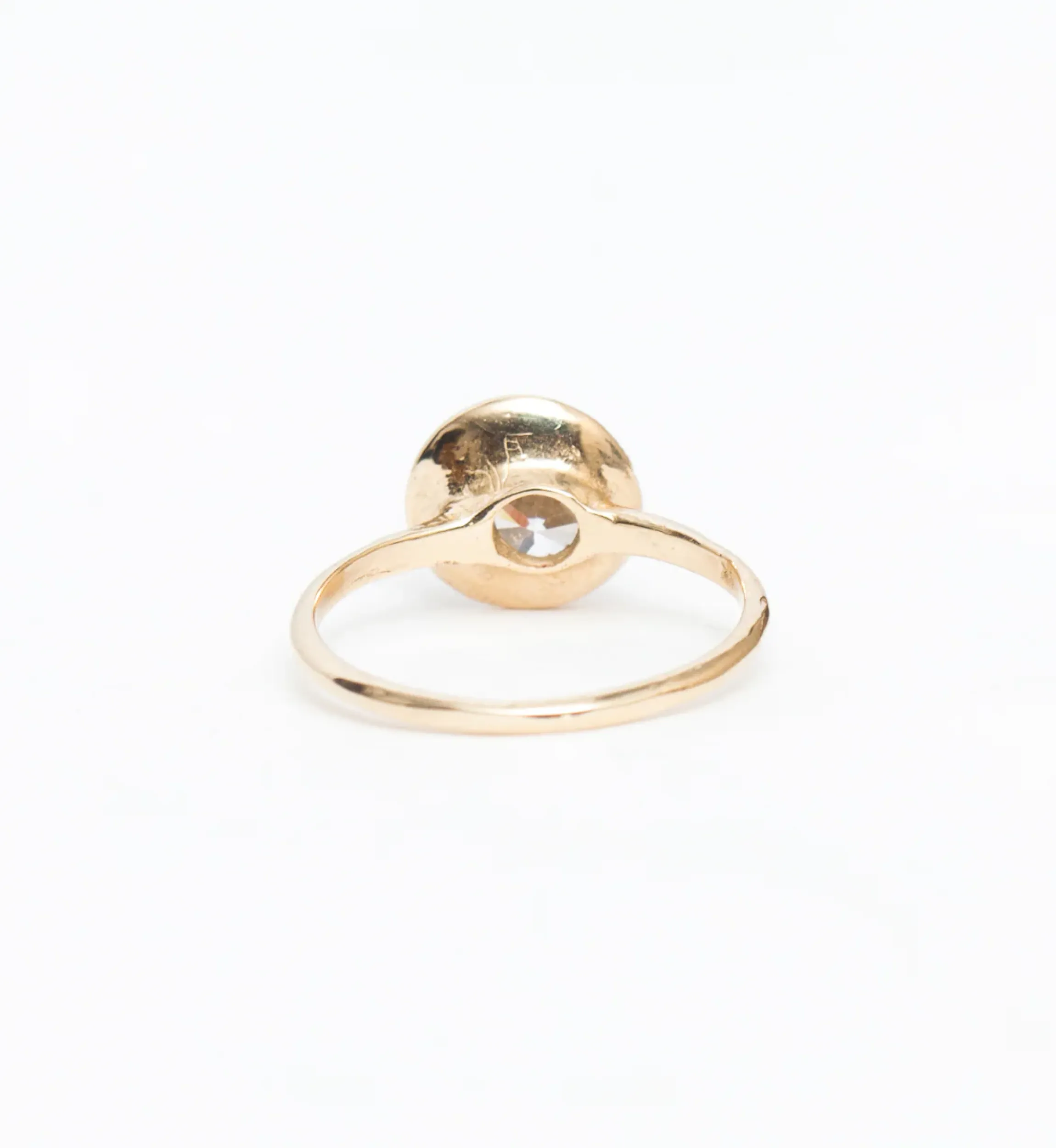 14 karat gold with approximately 1.0 carat center and eleven round white diamonds totaling 0.075 carat.