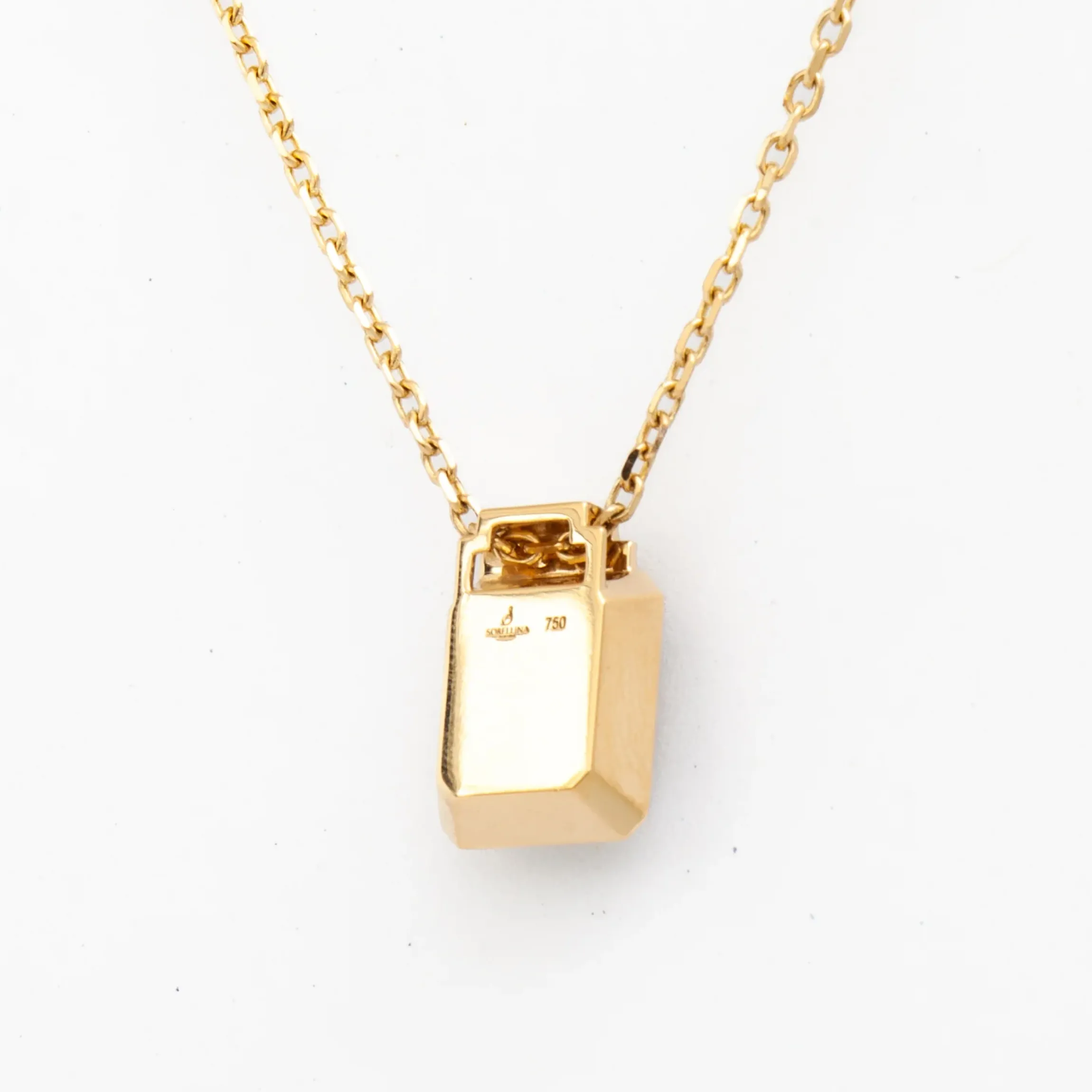 A golden crescent moon and three stars shimmer at the center of a gorgeous grey moonstone. The weighty gold pendant with diamond details slings along a delicate golden chain, making this the perfect stacking piece. Sorellina, a New York jewelry design house, creates a harmonious dichotomy by seamlessly blending opposing ideas of feminine with masculine and vintage with modern.