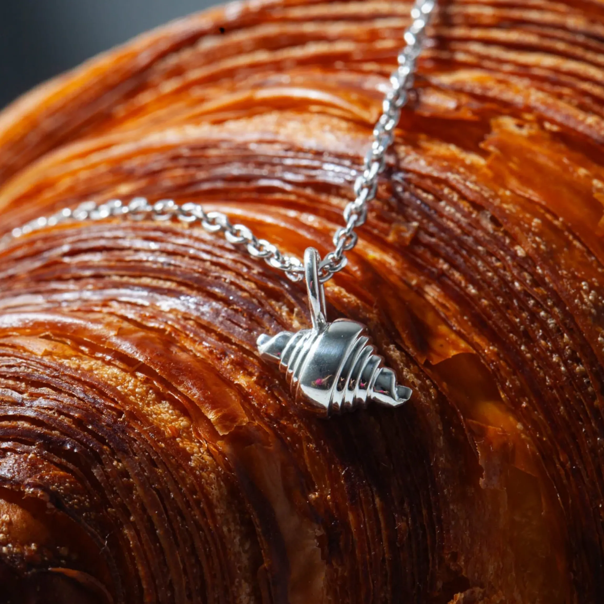 Butter u0026amp; Crumble, is a treat you won’t want to resist. The intricately designed charm, crafted in 14k yellow gold or sterling silver, captures the buttery layers of a raw croissant right before it’s baked to perfection. A delicious nod to SF’s culinary scene, it’s the ultimate keepsake or gift for foodies and fine jewelry lovers alike.