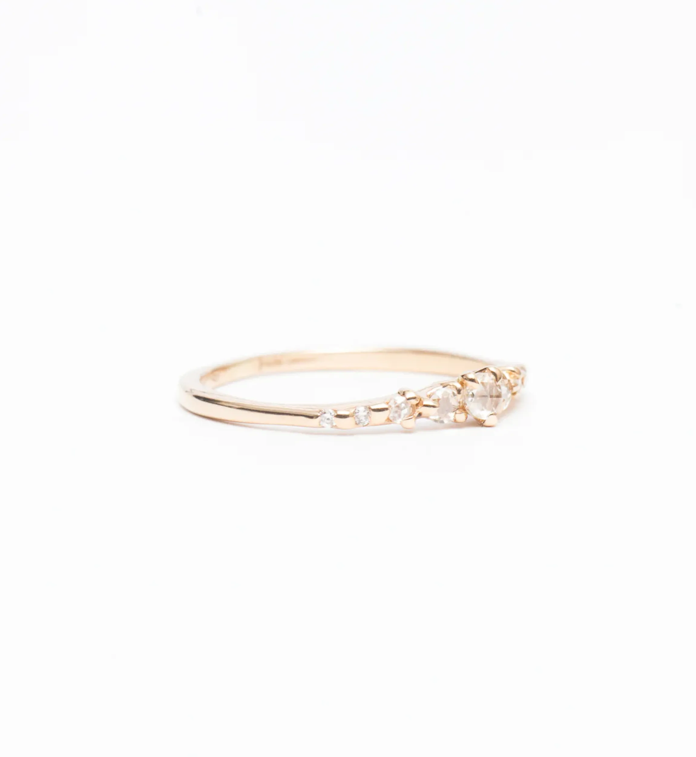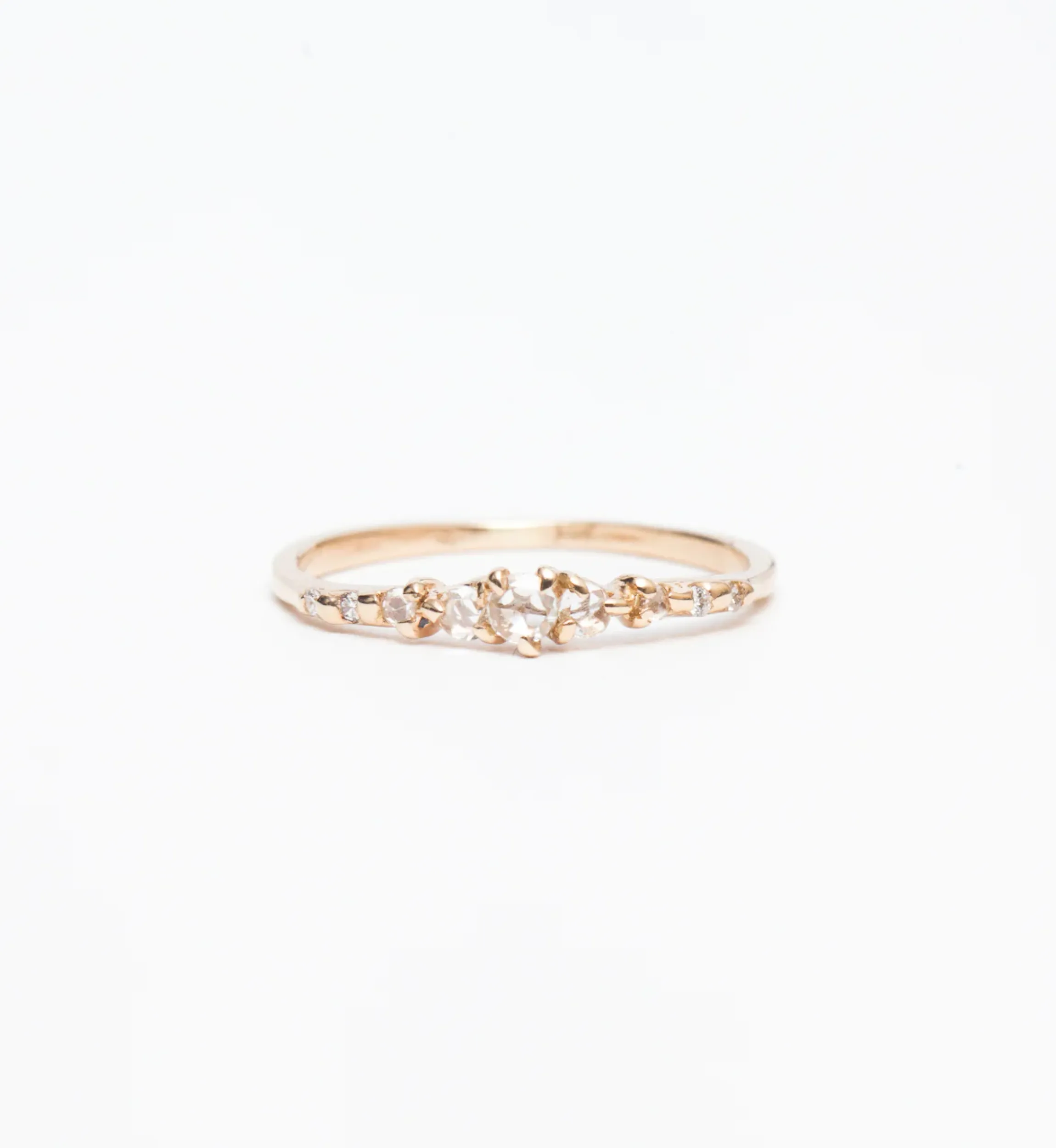 Laurie Fleming breathes new life into the vintage look of rose-cut diamonds with a graduated arrangement and just the barest sprinkling of modern round diamonds. Despite the variety of sizes and facets among its nine gems, this ring maintains a sleek silhouette that gives you freedom to style it how you like. Do you want a petite, but intricately-detailed engagement ring? Or are you looking for a wedding band with loads of texture and sparkle? In our mind, the Cyndra Ring is perfect for both. Made in Canada.