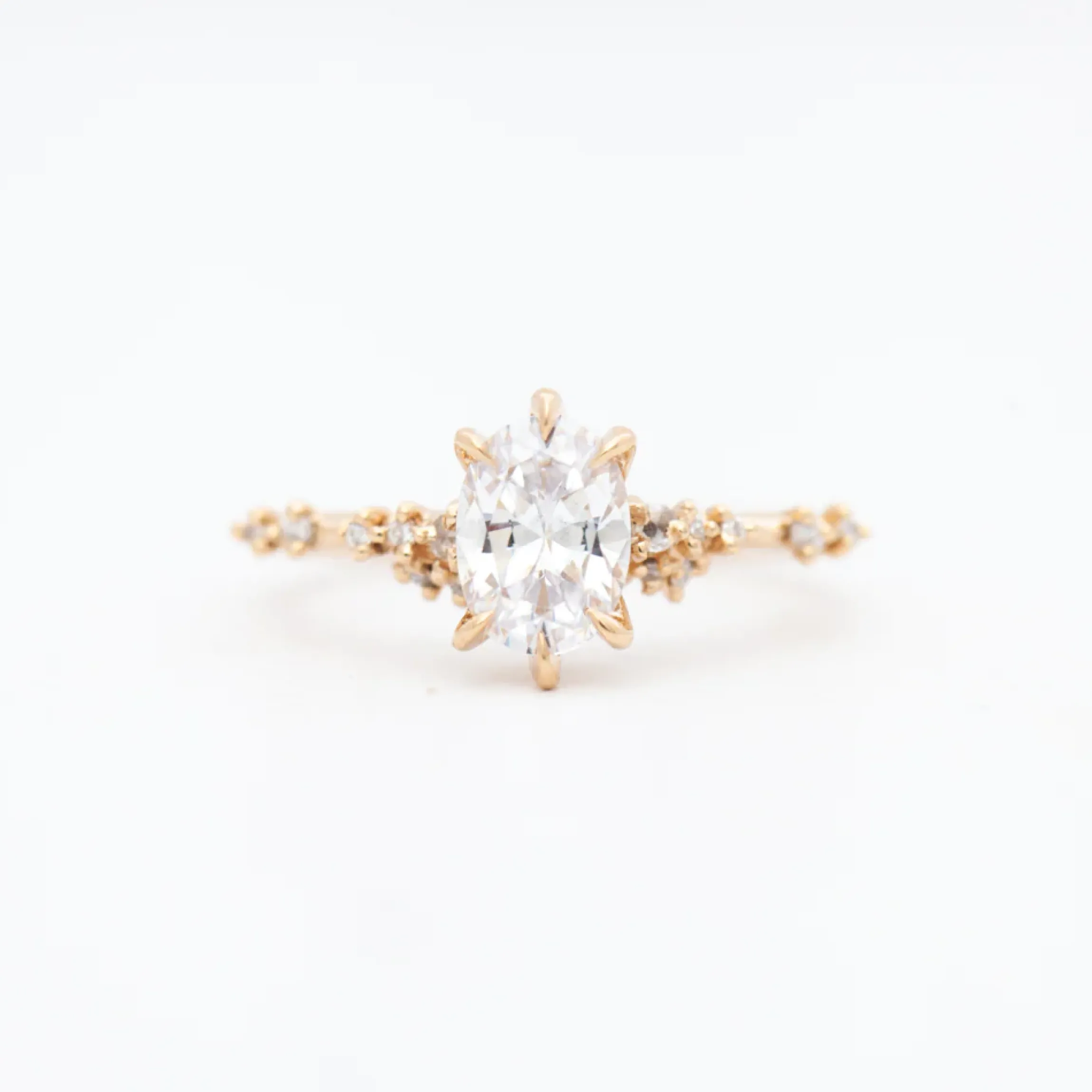 14 karat gold set with one approximately 1 carat oval white diamond center and recycled accent diamonds (1.5 mm rose-cut (SI1, GH1), 1.2 mm, 1 mm, and 0.9 mm round brilliant-cut white diamonds (VS, GH) totaling appromixately 0.07 carat.