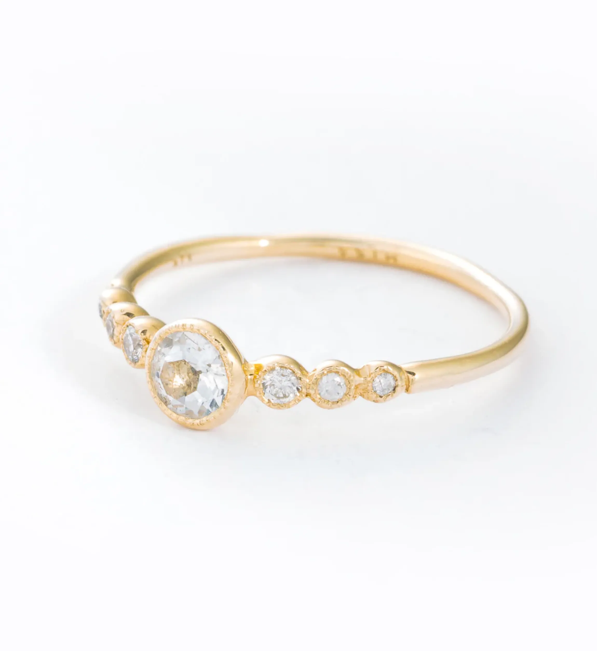 Nature’s own beauty serves as the template for this wonderfully delicate diamond ring. Inspired by the glistening dew of the early morning, seven round brilliant-cut white diamonds are each hand set in matching bezels to create an enchanting mix of stone and metal. The largest diamond is flanked by three smaller stones on each side, descending in size to form a natural, harmonious frame. Minute milgrain detailing traces around the edge of each bezel for a final, painstaking touch. Pair with diamond eternity bands for an overload of gems or a more textured, solid metal style to heighten the contrasts. Made in the U.S.A.