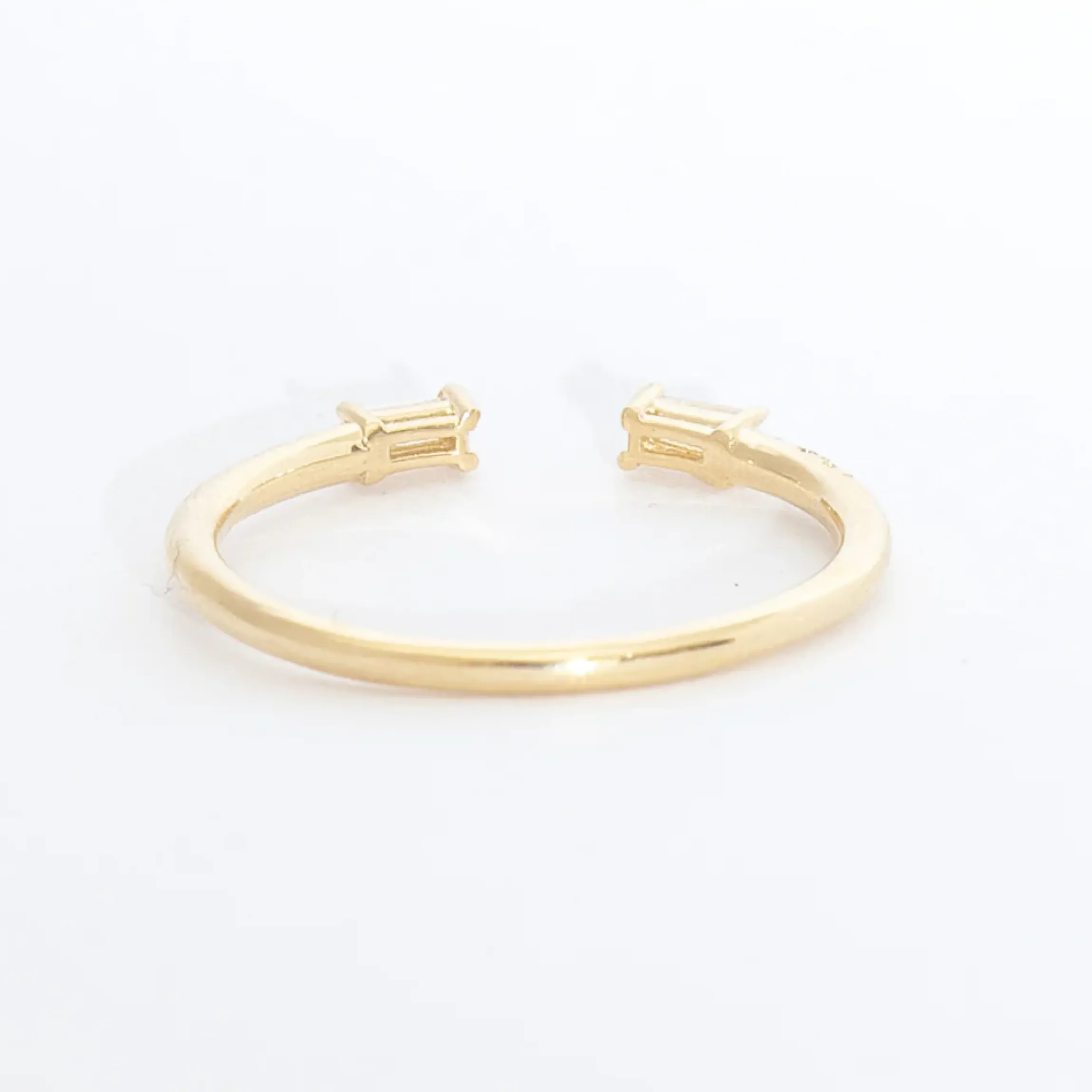 14 karat gold set with two 3 mm x 1.5 mm baguette white diamonds and six 1 mm round white diamonds.