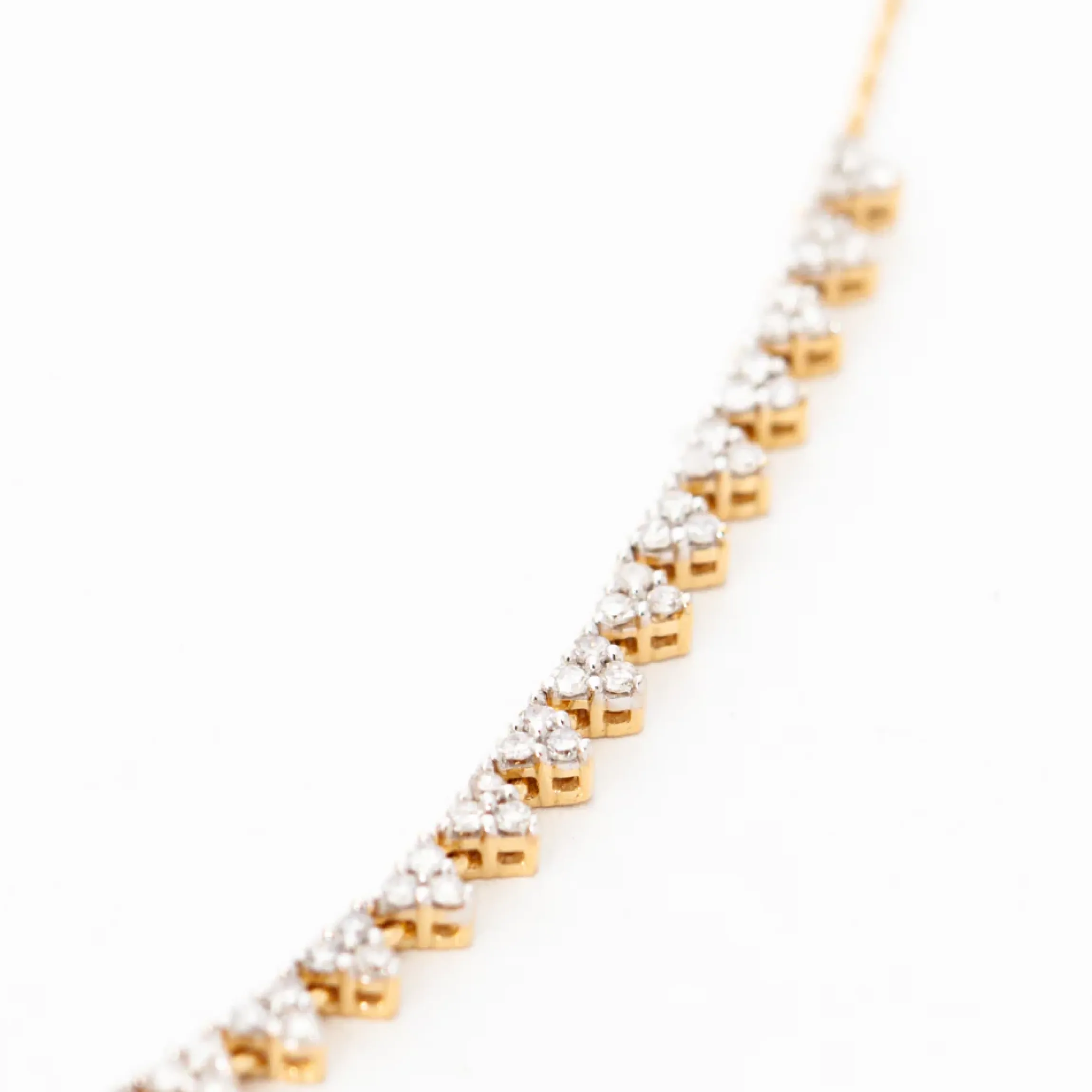 Each diamond cluster measures approximately 3.5 mm in width on a chain that adjusts between 14″, 15″, and 16″ in length.