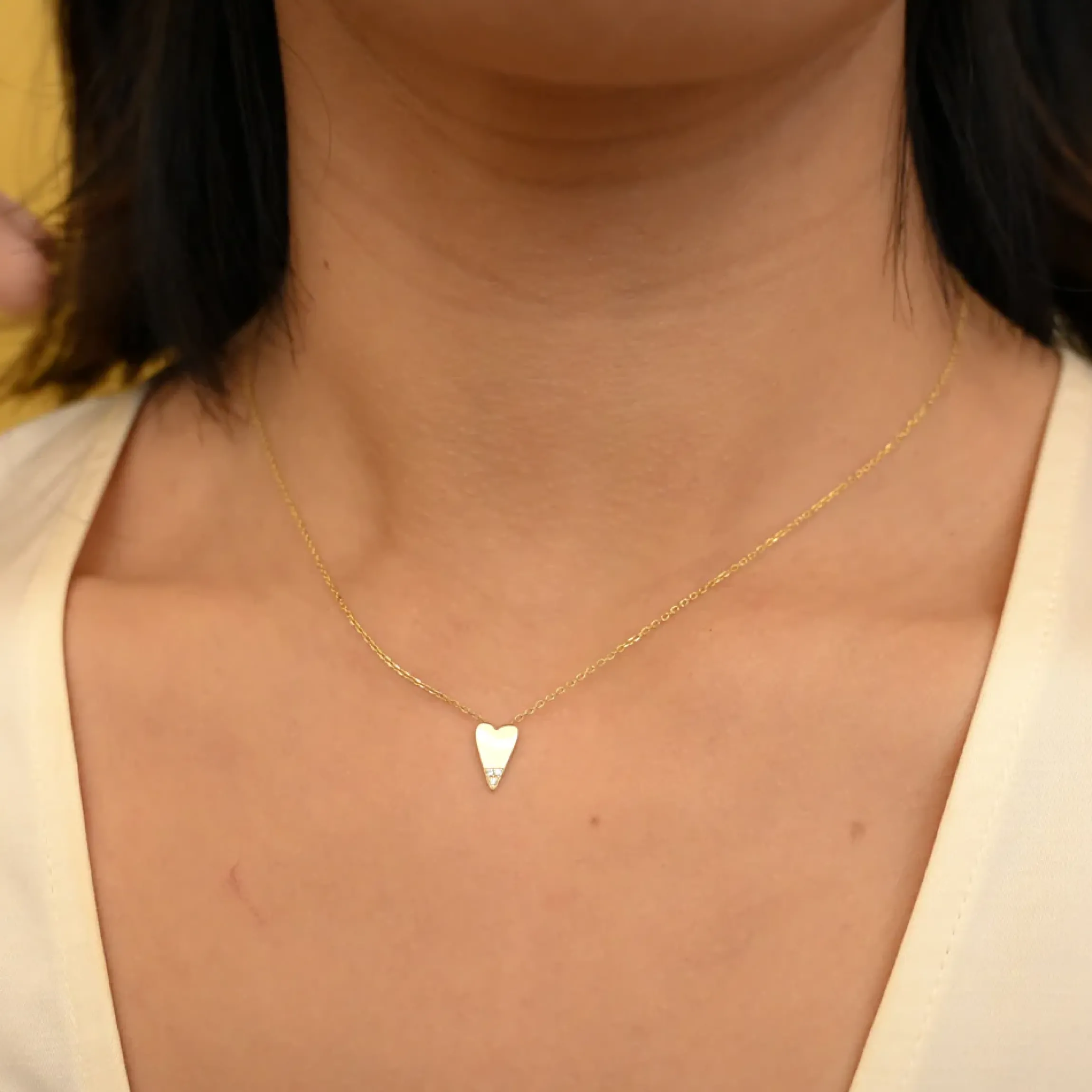This modern update on a classic jewelry motif comes off as sweet and dainty thanks to an elongated heart silhouette and just the barest touch of diamond sparkle. Gift it to someone special or wear it in honor of your beloved. For a more personal touch, ask us about engraving it with a letter. Finished with a spring ring clasp. Made in the U.S.A.