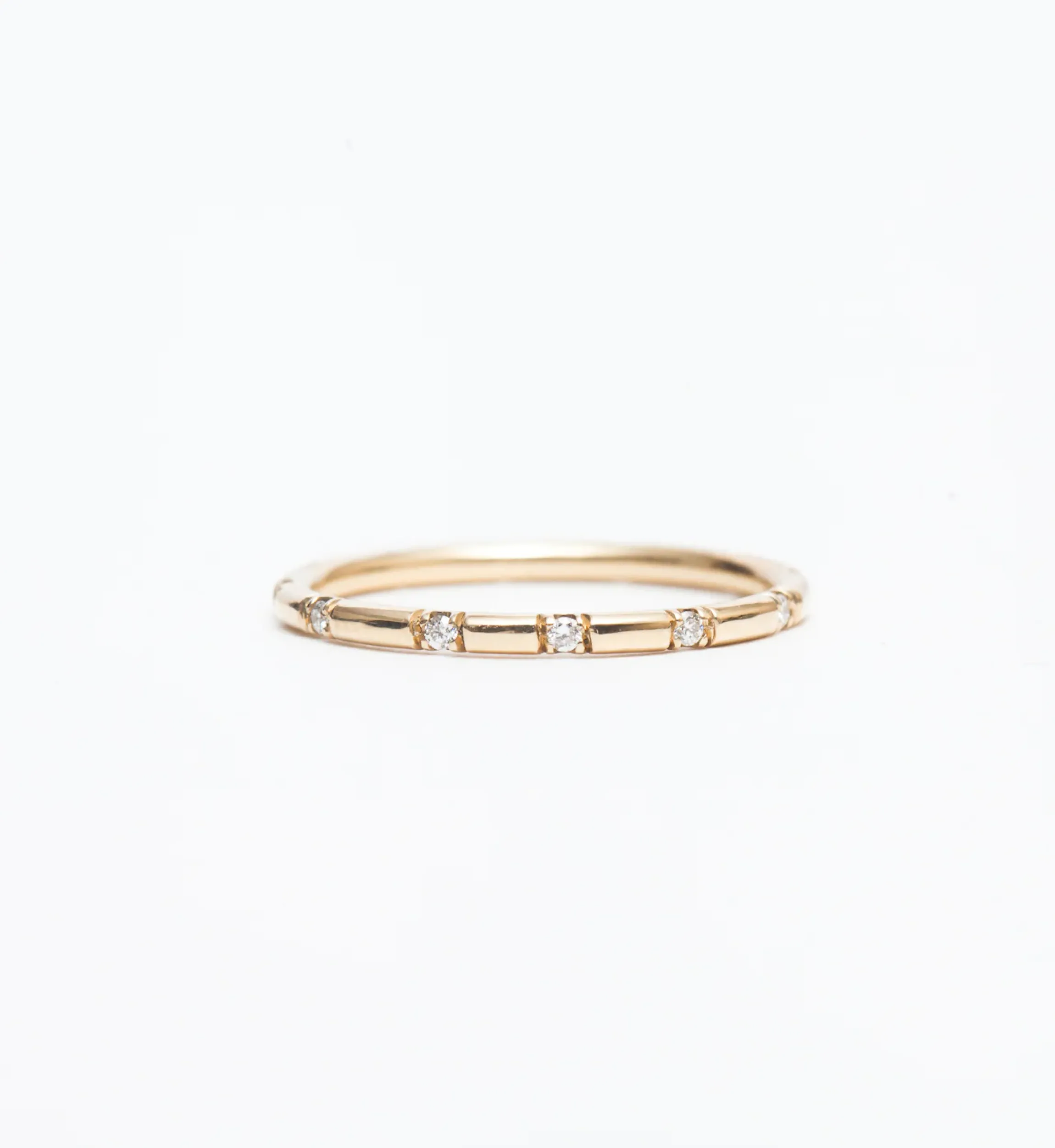 Twinkling diamonds randomly studded into the surface of this ring create an organic contrast between gleaming gold and sparkling stones. We think of it as an alternative to traditional eternity bands, offering you plenty of shine to encircle the finger, but with a more subtle, low-key look. Or treat it as a sparkling stacker to other bands for an eclectic combination you can rearrange any way you like. Made in the U.S.A.