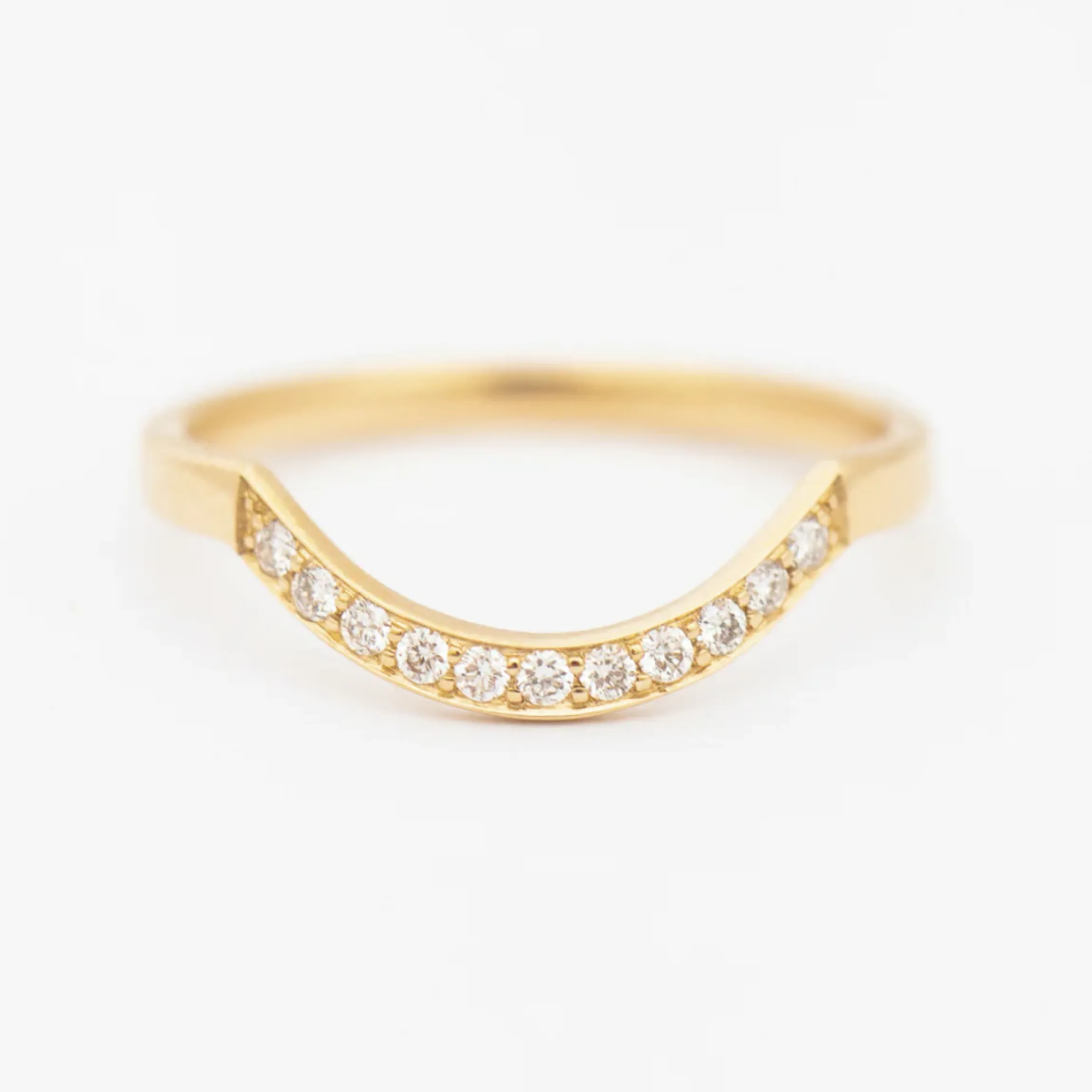 With its wide, sweeping curve, this contour band by the one and only Anna Sheffield is the perfect foil to any engagement ring, be it a simple solitaire or a three-stone stunner. The soft, angled shimmer of diamonds enveloped in gold adds a sophisticated touch you’ll fall head over heels with day after day. Designed in New York.